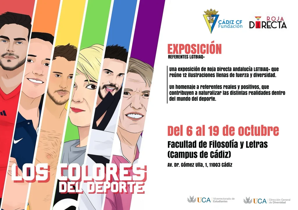 La Universidad de Cádiz acoge este otoño la exposición “Los colores del deporte”, una iniciativa que pone en valor la diversidad y la visibilidad LGTBI en el ámbito deportivo. La muestra, impulsada por Cádiz CF Fundación, la Asociación Roja Directa y el Área de Diversidad de la UCA, se podrá visitar en los cuatro campus universitarios entre los meses de octubre y diciembre.