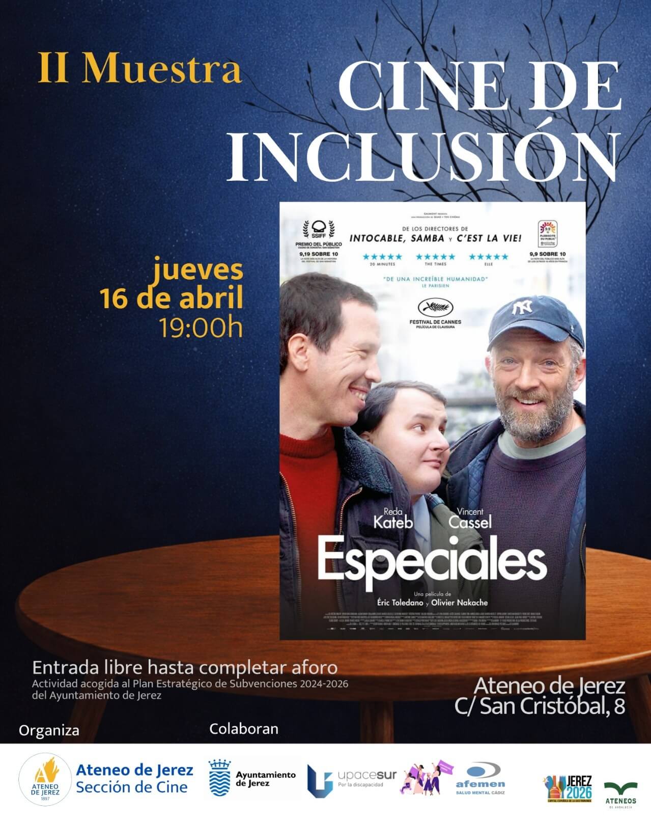 La II Muestra de Cine de Inclusión en Jerez continúa este jueves 16 de abril con la proyección de la película “Especiales”, dirigida por Olivier Nakache y Éric Toledano. La sesión tendrá lugar a las 19:00 horas en el salón de actos del Ateneo de Jerez, situado en la calle San Cristóbal número 8, con entrada gratuita hasta completar aforo.