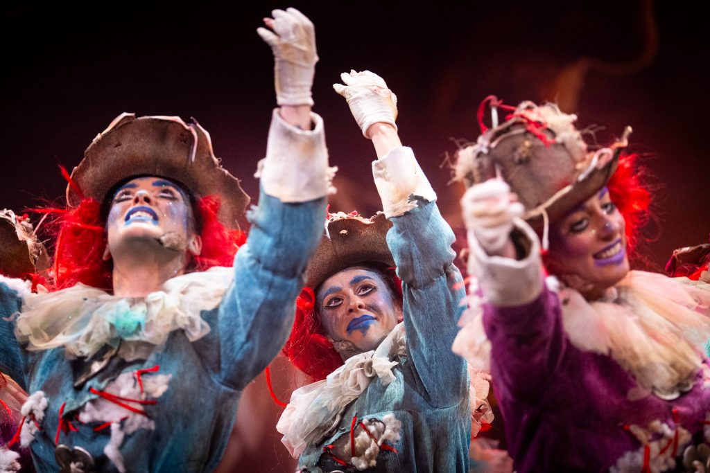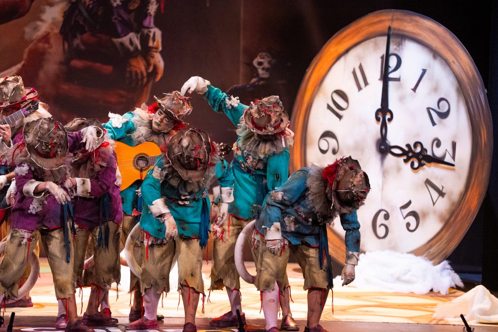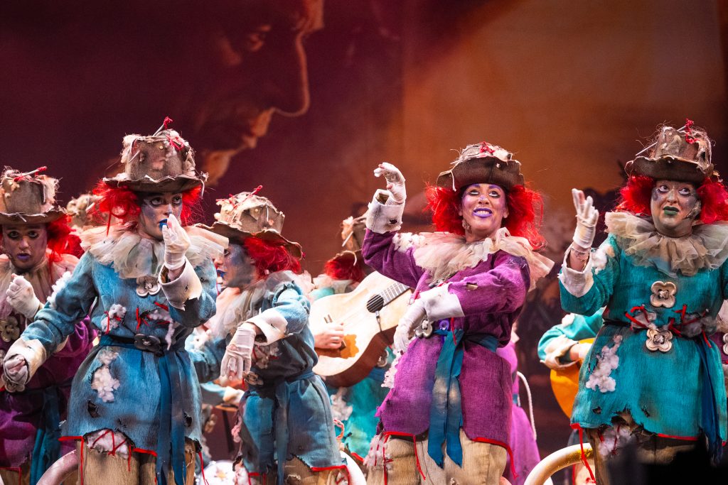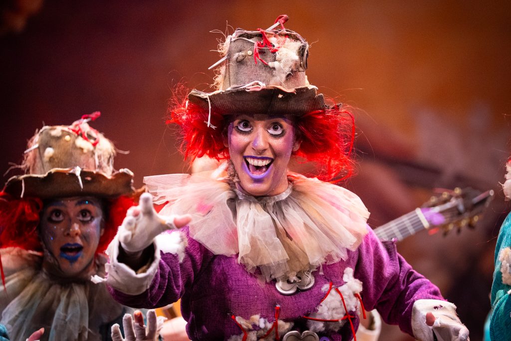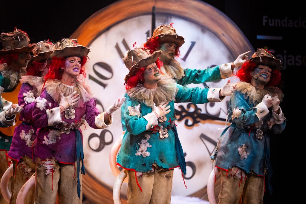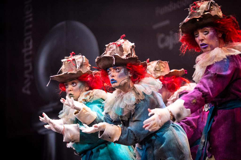 La presentación situó el marco conceptual del repertorio: una juguetería donde las muñecas rompen sus cuerdas para tomar el control de sus propias vidas. La metáfora se sostuvo visualmente en dos grandes elementos escénicos que reducían la escala del escenario y subrayaban la condición de juguetes. El texto jugó con imágenes de tablero, reglas y rompecabezas para denunciar la falta de libertad en el “juego” social y económico. La puesta en escena fue limpia, ordenada y comprensible para el espectador desde los primeros compases.