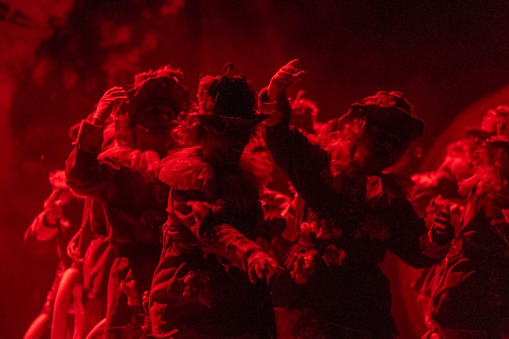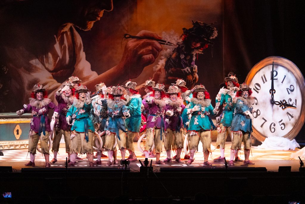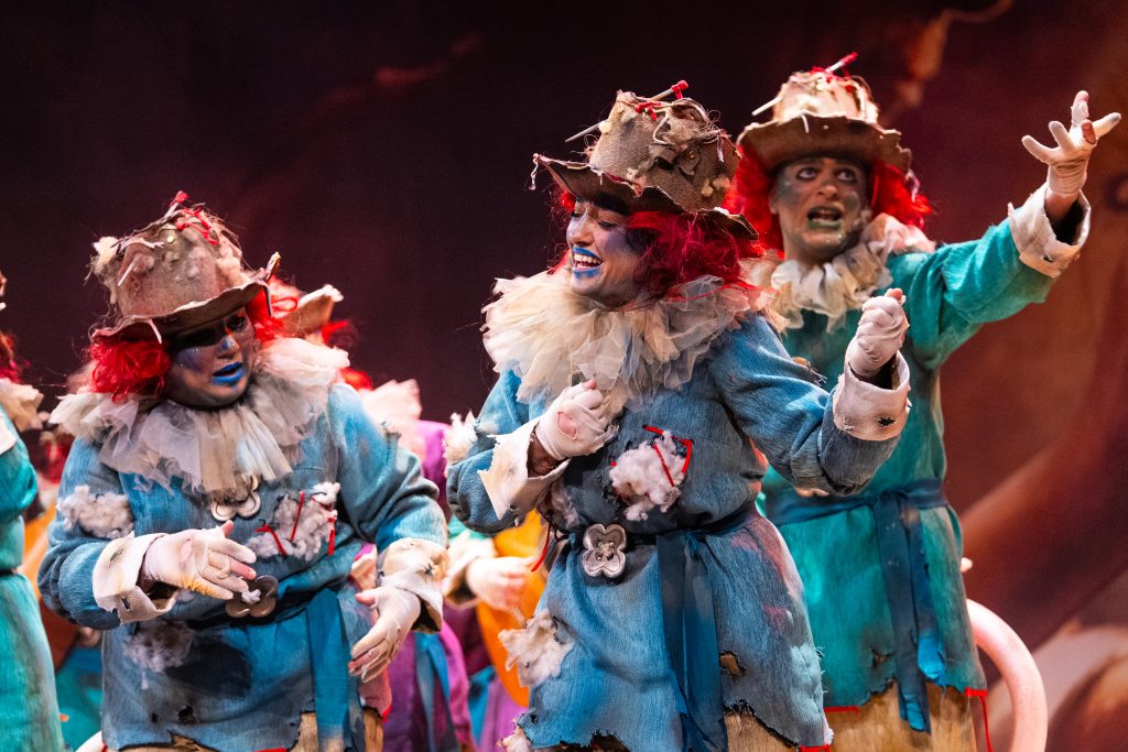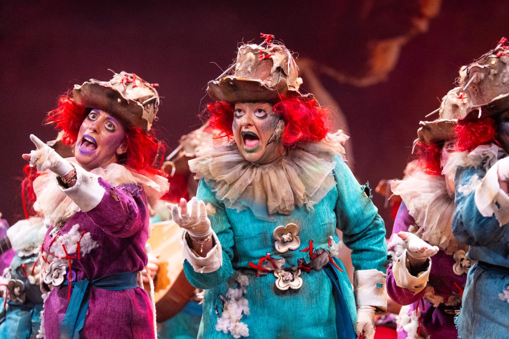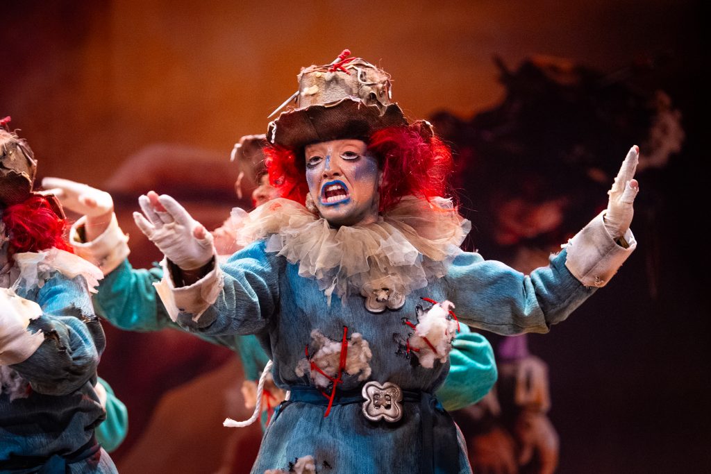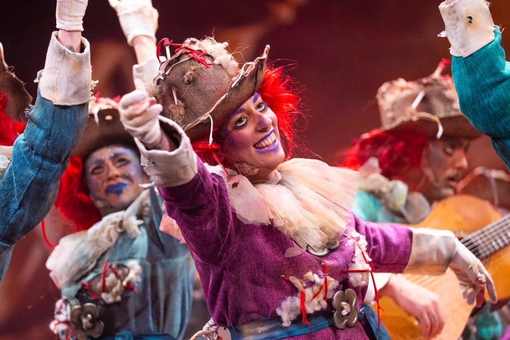 La presentación situó el marco conceptual del repertorio: una juguetería donde las muñecas rompen sus cuerdas para tomar el control de sus propias vidas. La metáfora se sostuvo visualmente en dos grandes elementos escénicos que reducían la escala del escenario y subrayaban la condición de juguetes. El texto jugó con imágenes de tablero, reglas y rompecabezas para denunciar la falta de libertad en el “juego” social y económico. La puesta en escena fue limpia, ordenada y comprensible para el espectador desde los primeros compases.