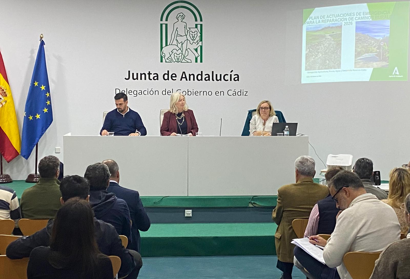 La delegada del Gobierno andaluz se reúne con ayuntamientos y Diputación para informar sobre el plan de reparación de caminos rurales en Cádiz y otras infraestructuras agrarias afectadas por los temporales de noviembre a febrero.