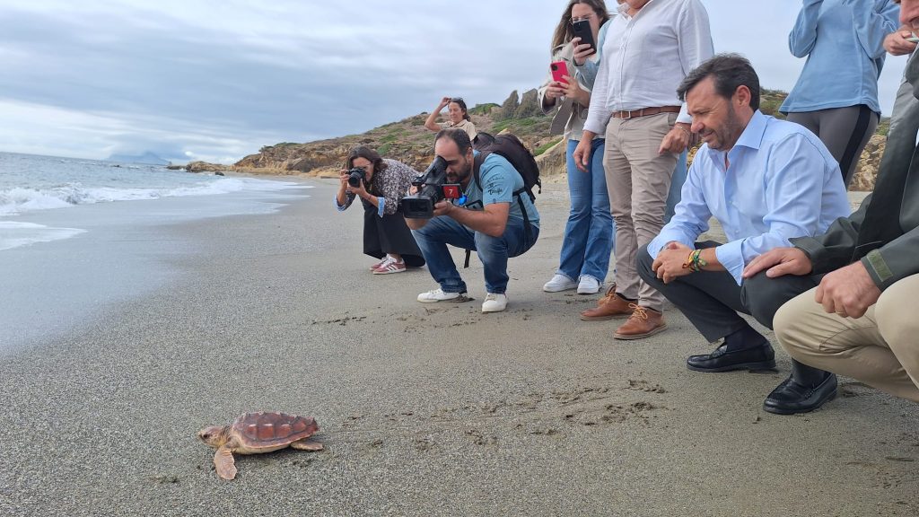 La Junta libera una tortuga boba recuperada en el CEGMA de Algeciras en la playa de Cala Sardina
