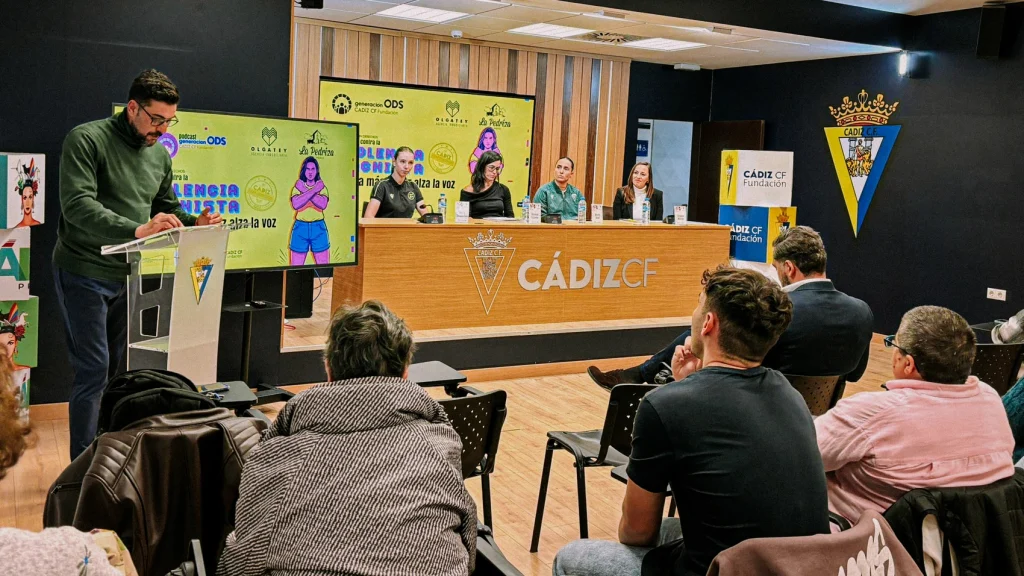 La mesa de intervención reunió a perfiles complementarios para ofrecer una visión multidisciplinar. Participaron la árbitra María Scapachini, la profesora titular de la Universidad de Cádiz Vanessa España y la jugadora del Cádiz CF Femenino Marta Vidal. La sesión contó además con la representación institucional de la concejala de Igualdad del Ayuntamiento de Cádiz, Virginia Martín. Las ponentes compartieron experiencias profesionales y personales, expusieron casos reales y subrayaron la importancia de reforzar la prevención, la sensibilización y la respuesta coordinada ante cualquier forma de violencia hacia la mujer.