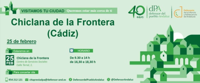 La Oficina de Atención Ciudadana del Defensor del Pueblo Andaluz en Chiclana se instalará el 25 de febrero en el centro de Servicios Sociales de la calle Terral para atender con cita previa a la ciudadanía y mantener un encuentro con asociaciones locales.