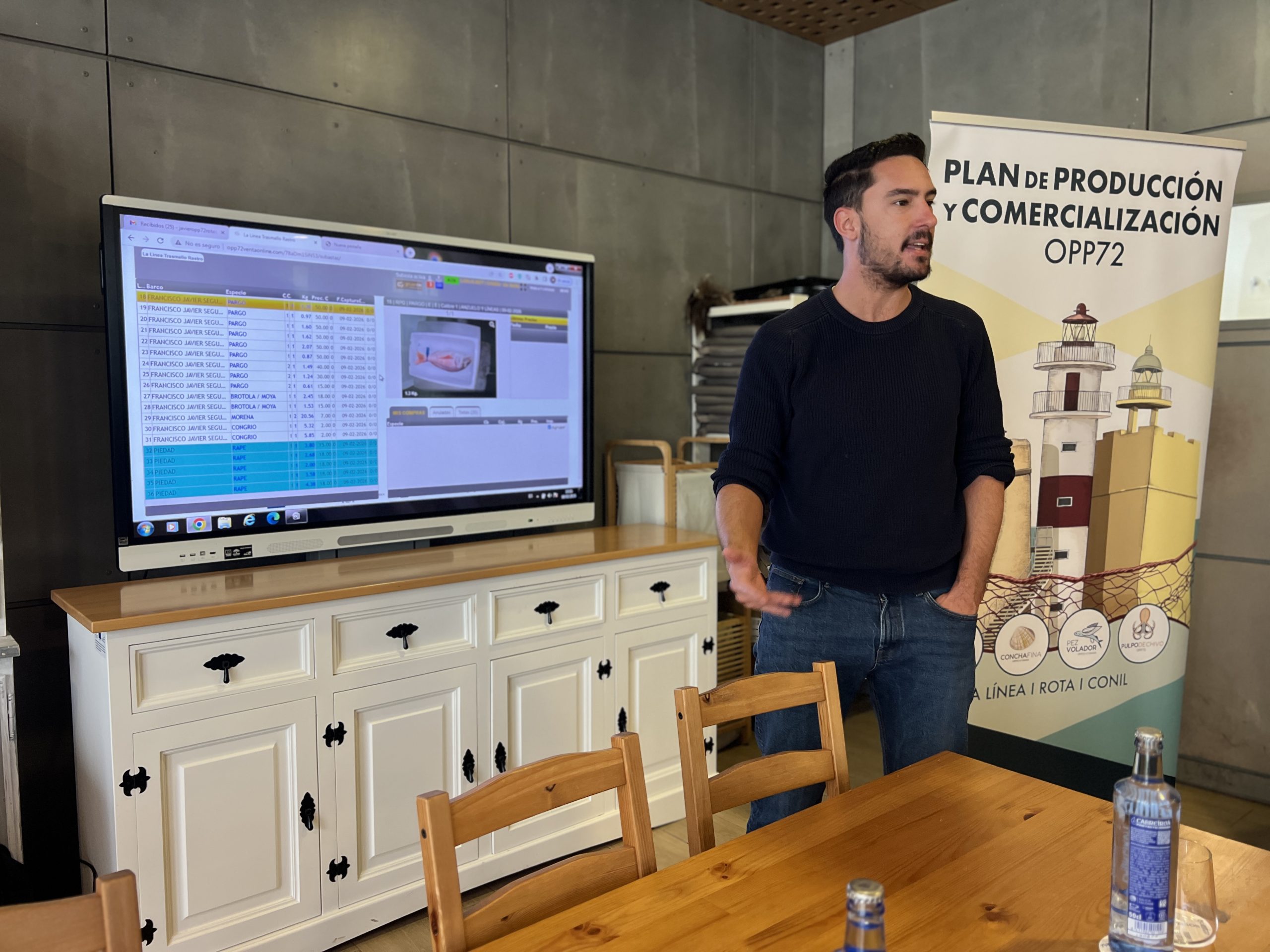 Otro de los ejes del proyecto es el impulso de la comercialización online del pescado. Javier Velo presentó al alumnado una plataforma digital que permite a restaurantes y pescaderías participar en subastas en directo de las lonjas gestionadas por la OPP72. A través de este sistema, los compradores pueden pujar por los lotes y recibir el producto en su establecimiento en un plazo inferior a 24 horas.