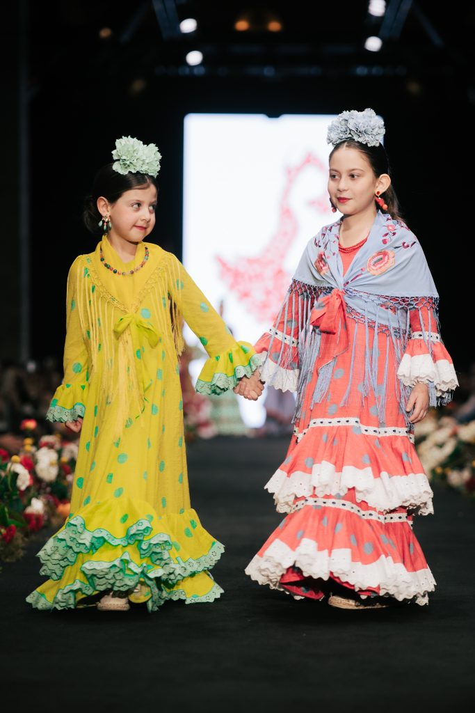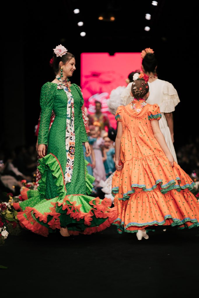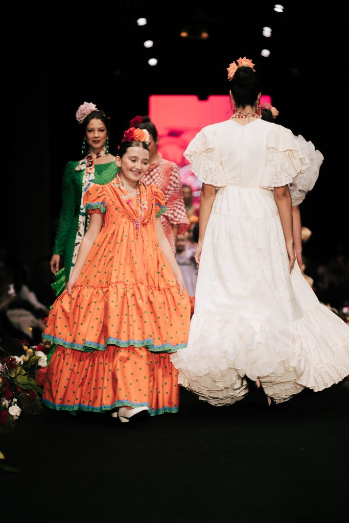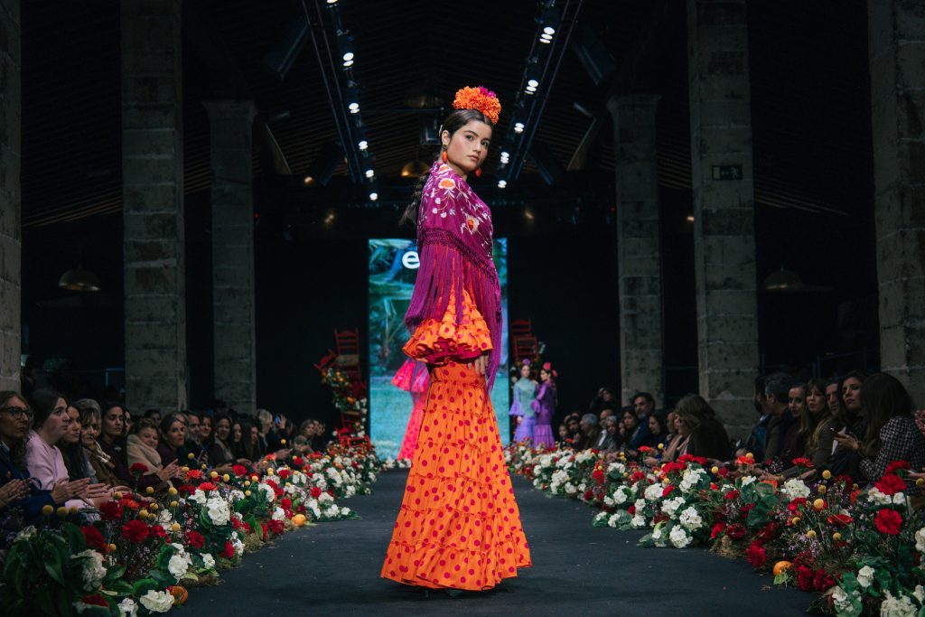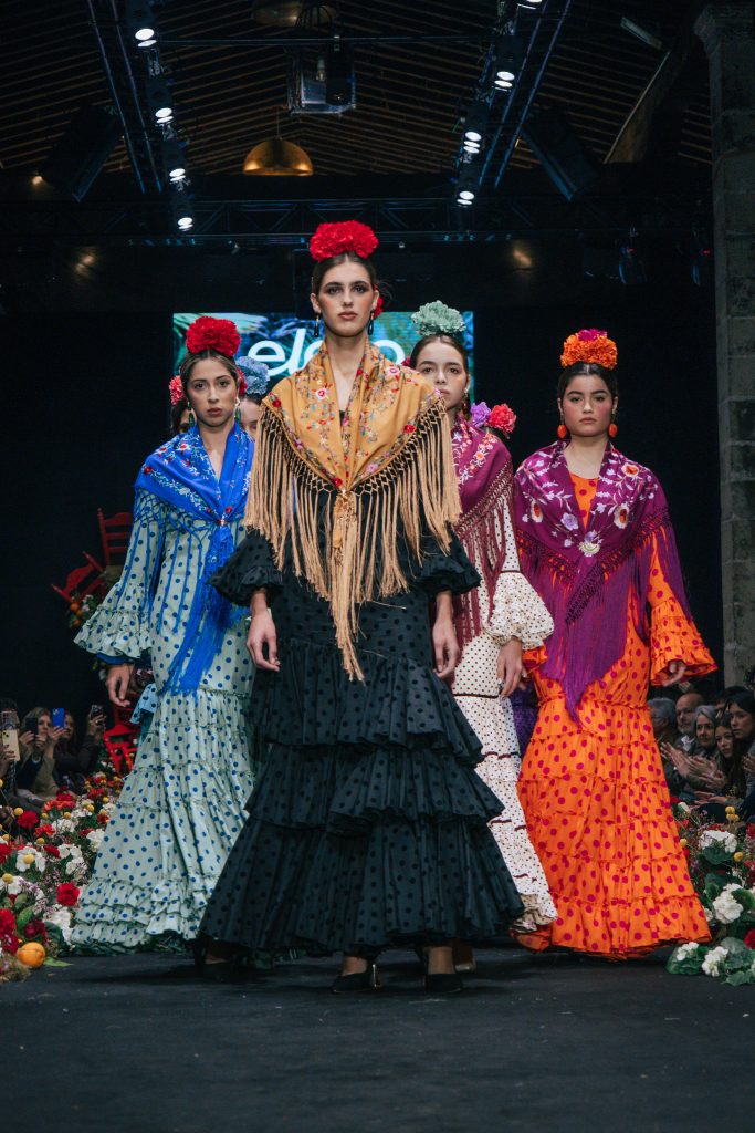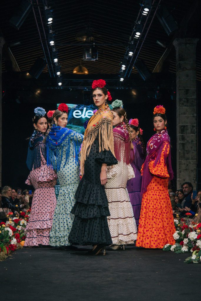 A las 12:30 horas tomó el relevo la firma Ele.O con su colección “Pasarela con Duende”, presentada como una pasarela multigeneracional donde convivieron estilos y edades. La propuesta unificó trajes para niñas, adolescentes y mujeres, conectados por volantes amplios y una paleta cromática decidida que buscó el impacto visual sin perder vínculo con la tradición flamenca.