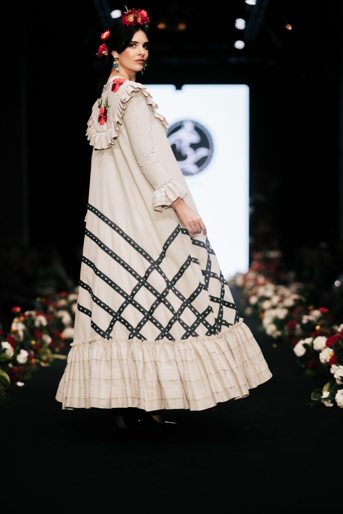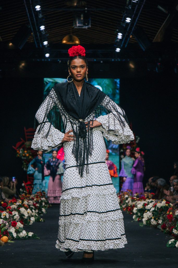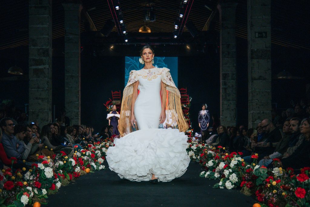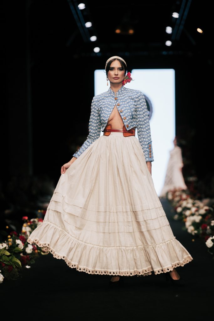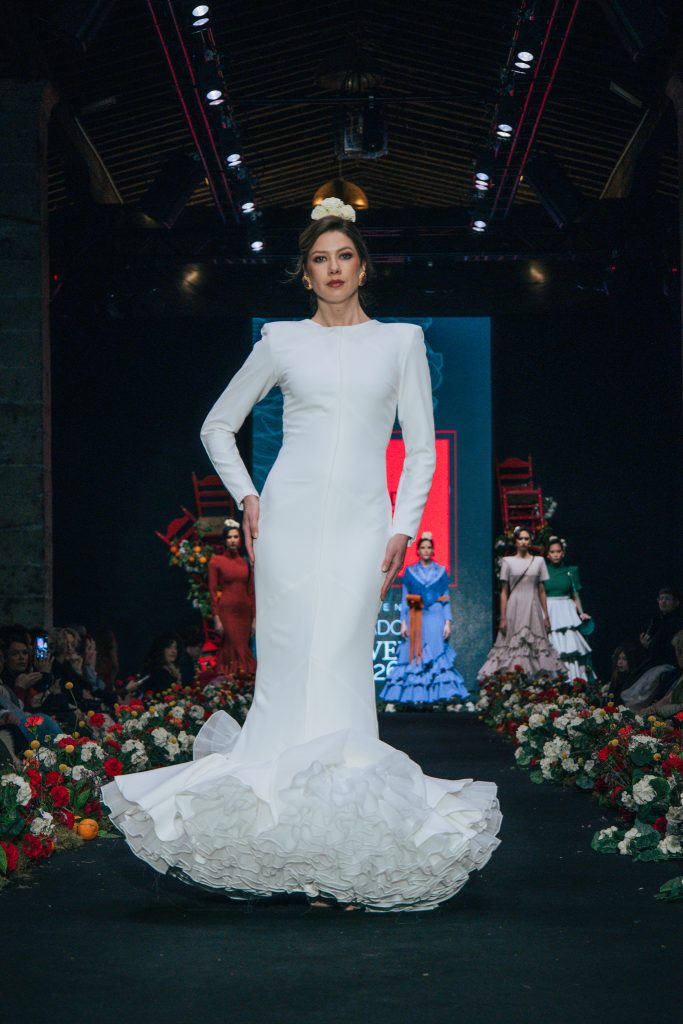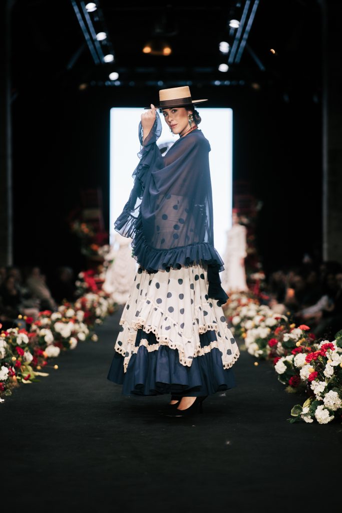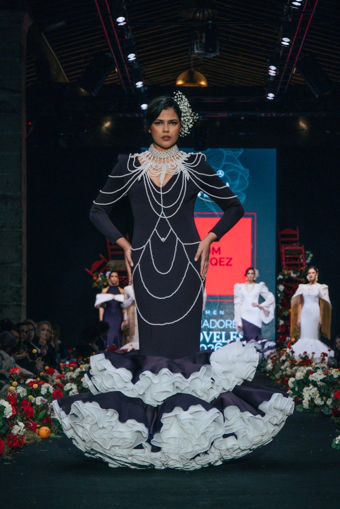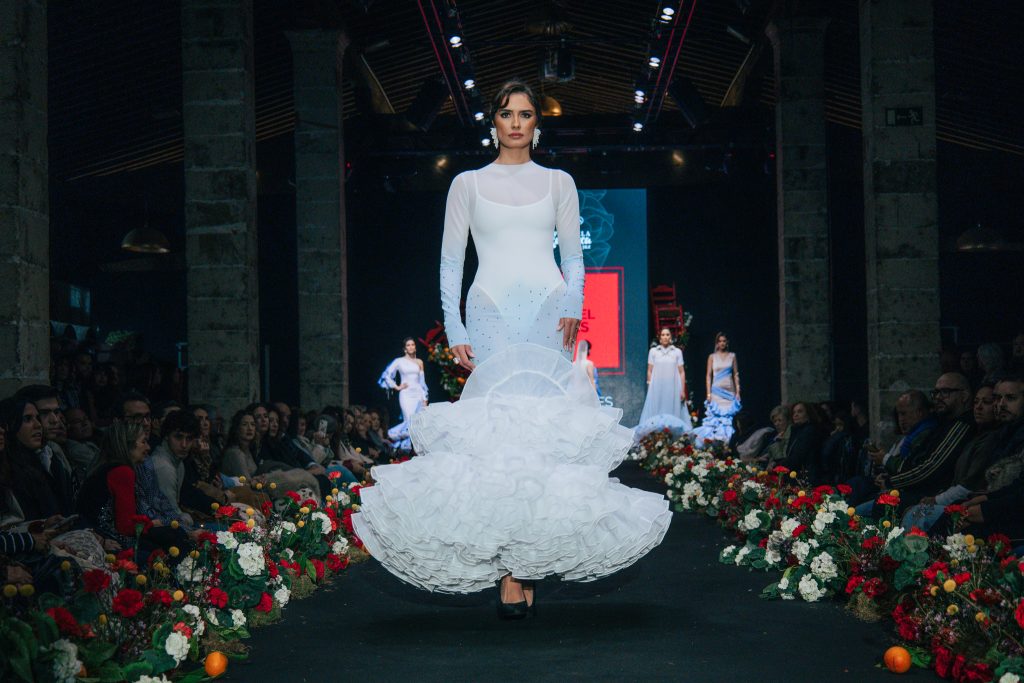 En ese mismo pase, Micaela Villa propuso un juego de contrastes cromáticos con cuerpos ajustados y faldas largas de volantes escalonados, reforzados con mantones en oposición cromática y flores como elemento de estilismo. Su flamenca subrayó la caída, el vuelo y la claridad de la presencia en pasarela.