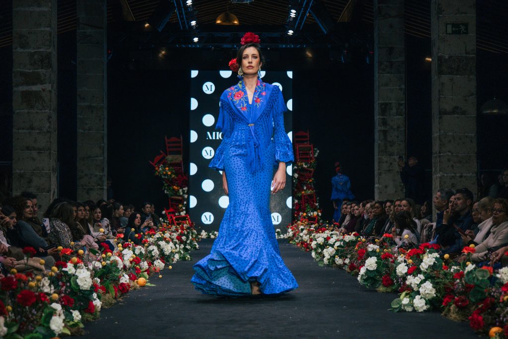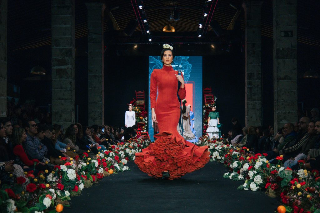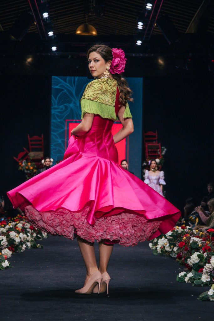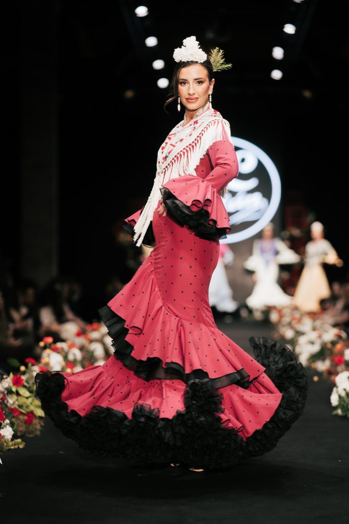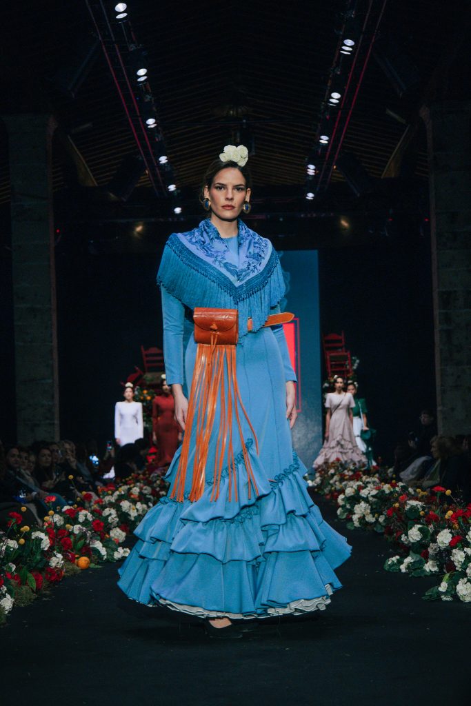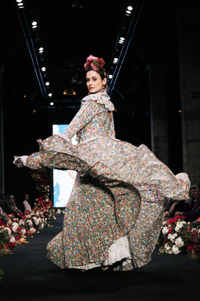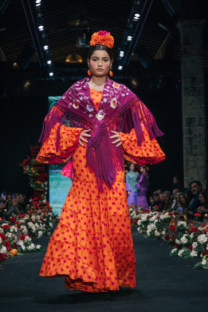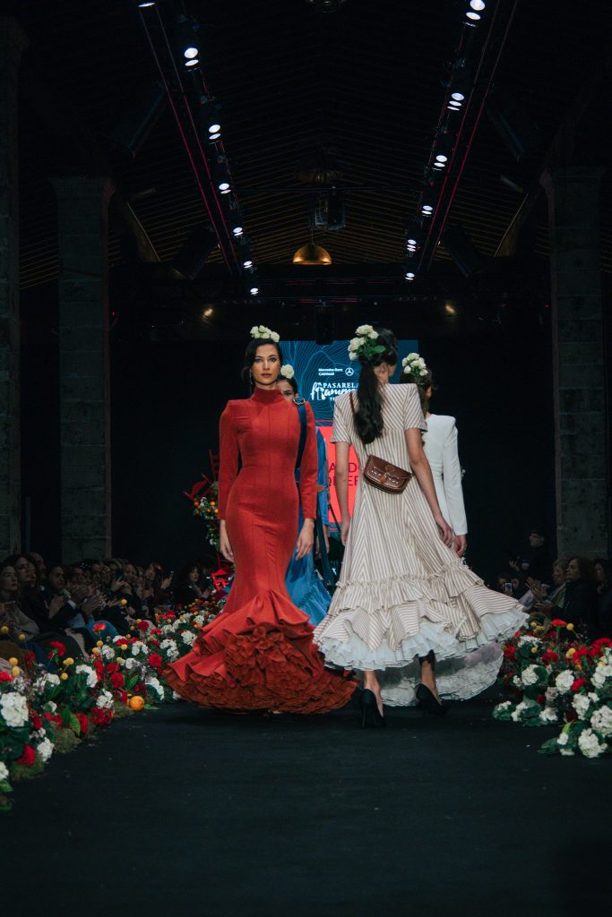 En ese mismo pase, Micaela Villa propuso un juego de contrastes cromáticos con cuerpos ajustados y faldas largas de volantes escalonados, reforzados con mantones en oposición cromática y flores como elemento de estilismo. Su flamenca subrayó la caída, el vuelo y la claridad de la presencia en pasarela.