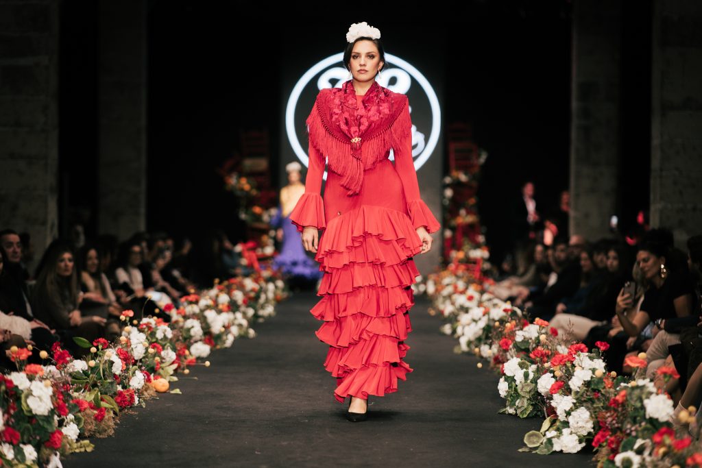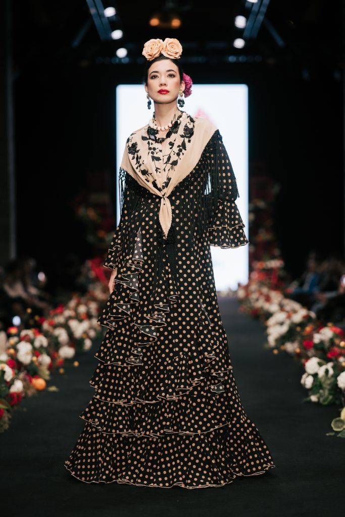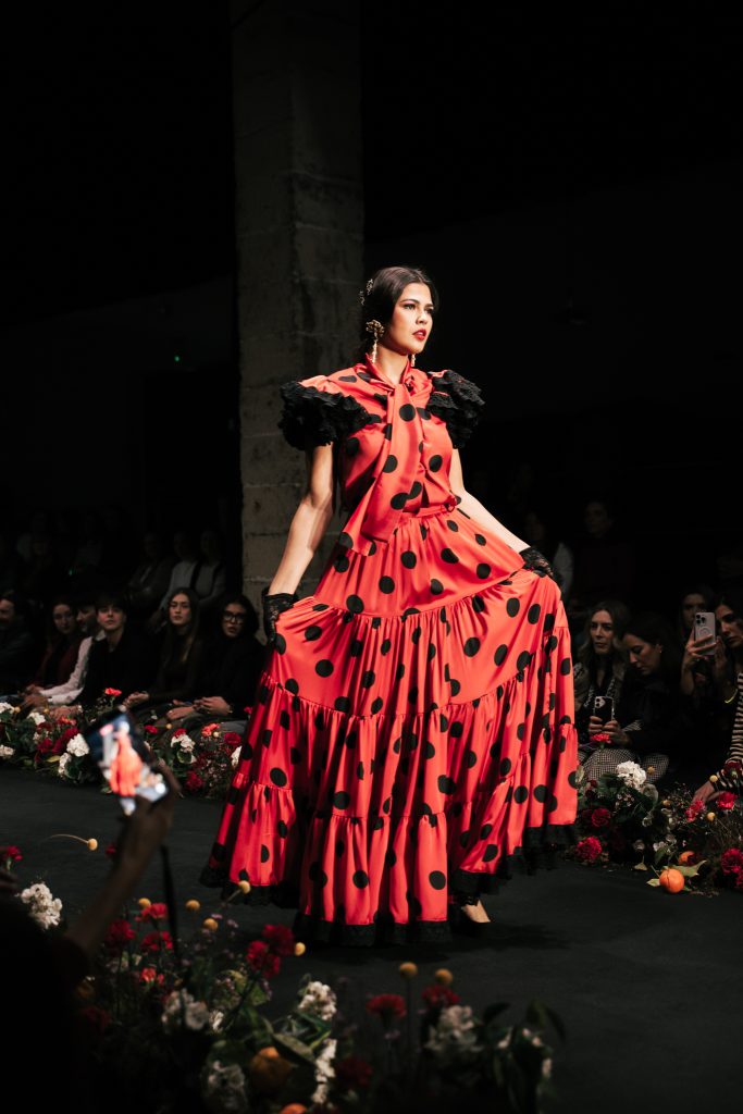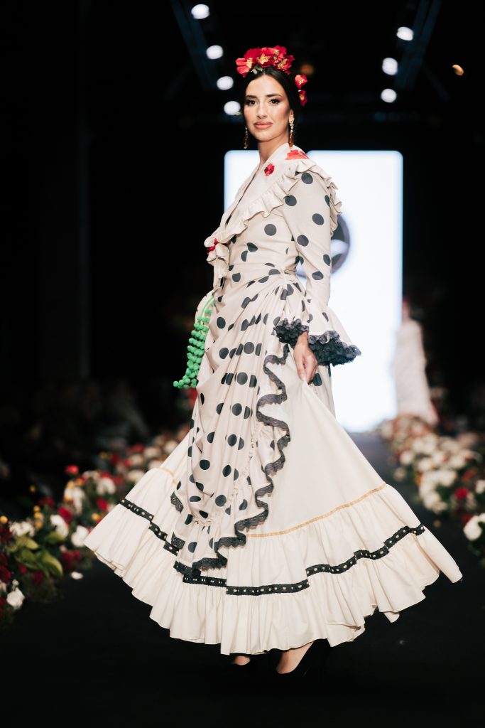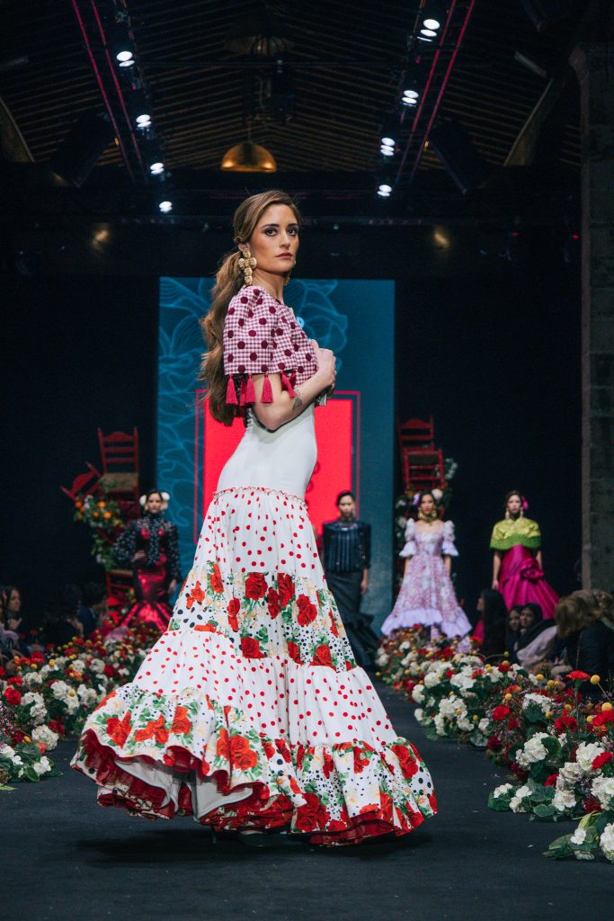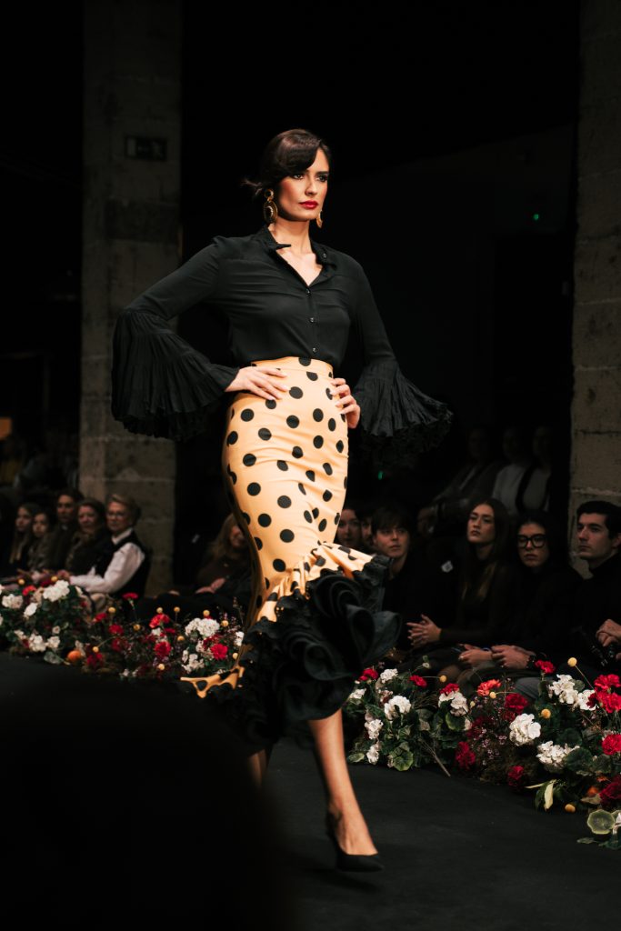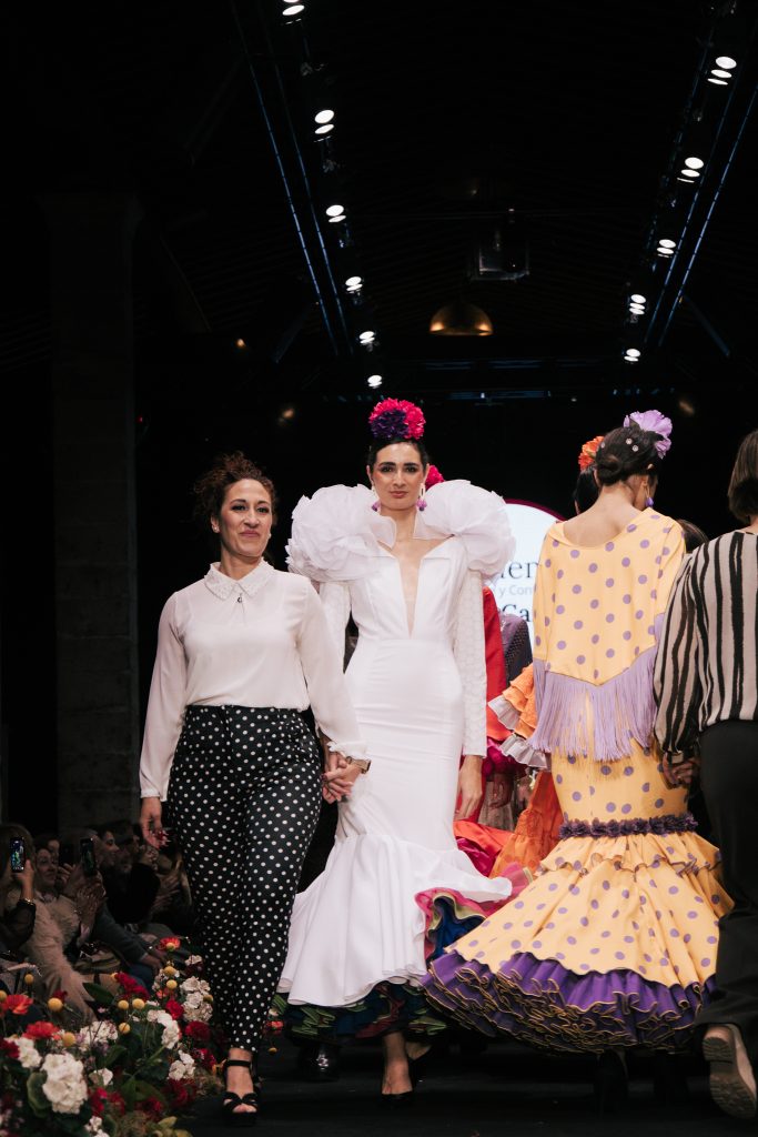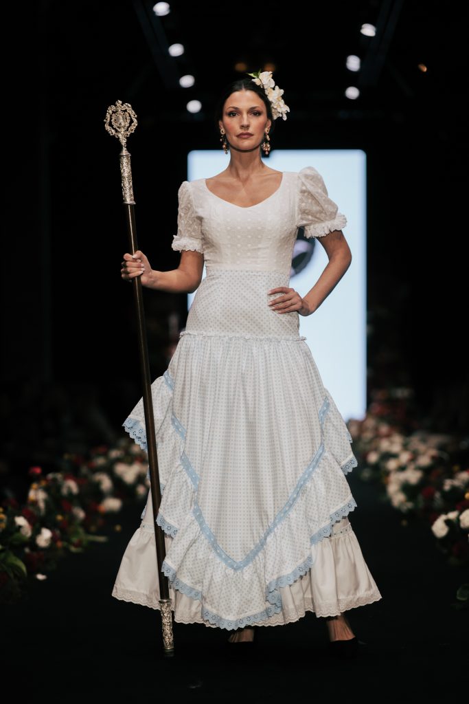 En ese mismo pase, Micaela Villa propuso un juego de contrastes cromáticos con cuerpos ajustados y faldas largas de volantes escalonados, reforzados con mantones en oposición cromática y flores como elemento de estilismo. Su flamenca subrayó la caída, el vuelo y la claridad de la presencia en pasarela.