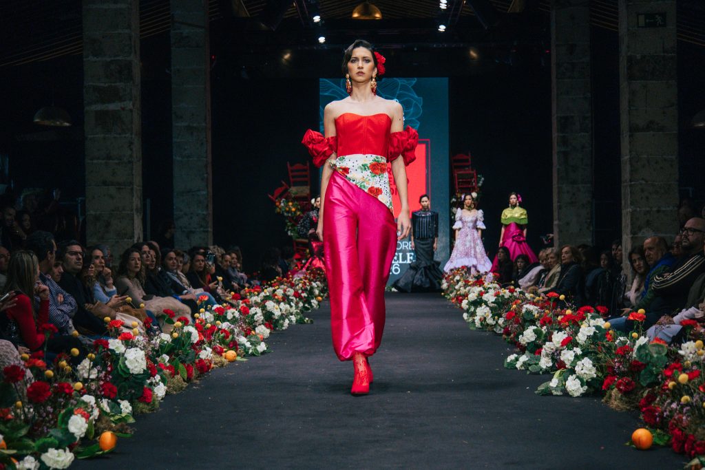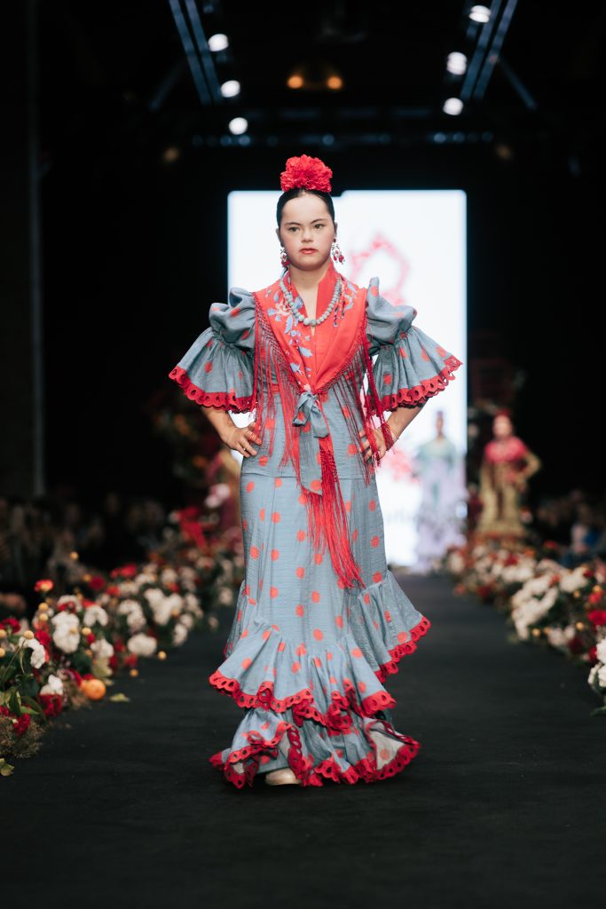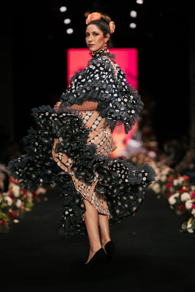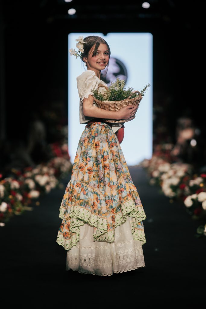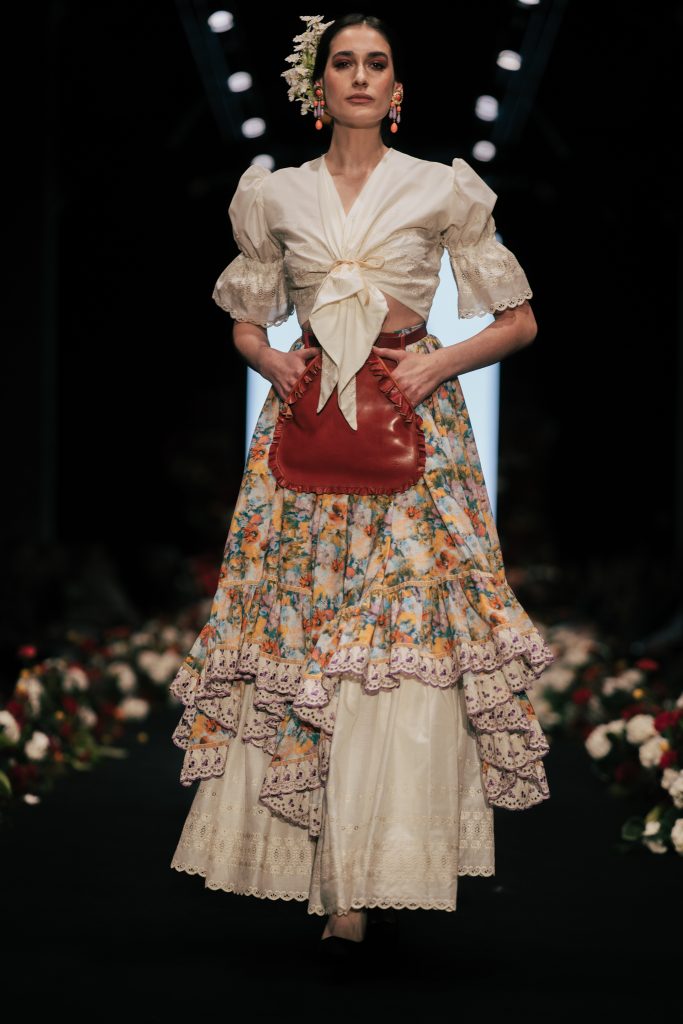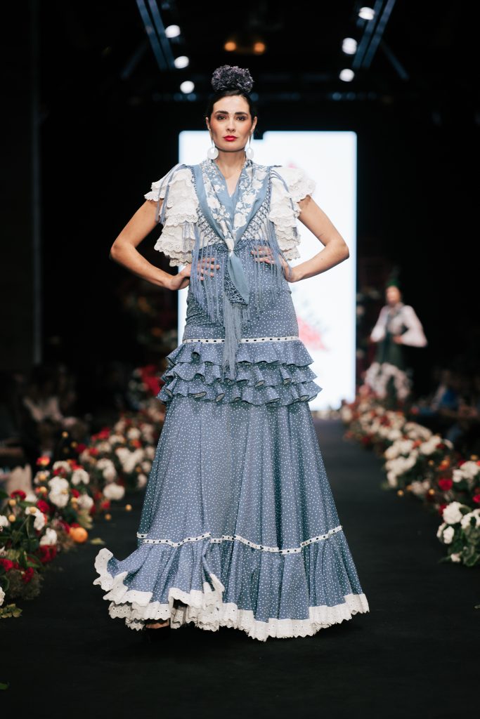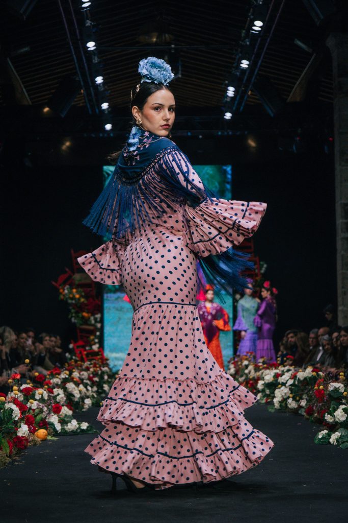 En ese mismo pase, Micaela Villa propuso un juego de contrastes cromáticos con cuerpos ajustados y faldas largas de volantes escalonados, reforzados con mantones en oposición cromática y flores como elemento de estilismo. Su flamenca subrayó la caída, el vuelo y la claridad de la presencia en pasarela.
