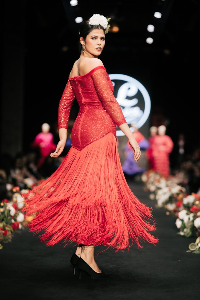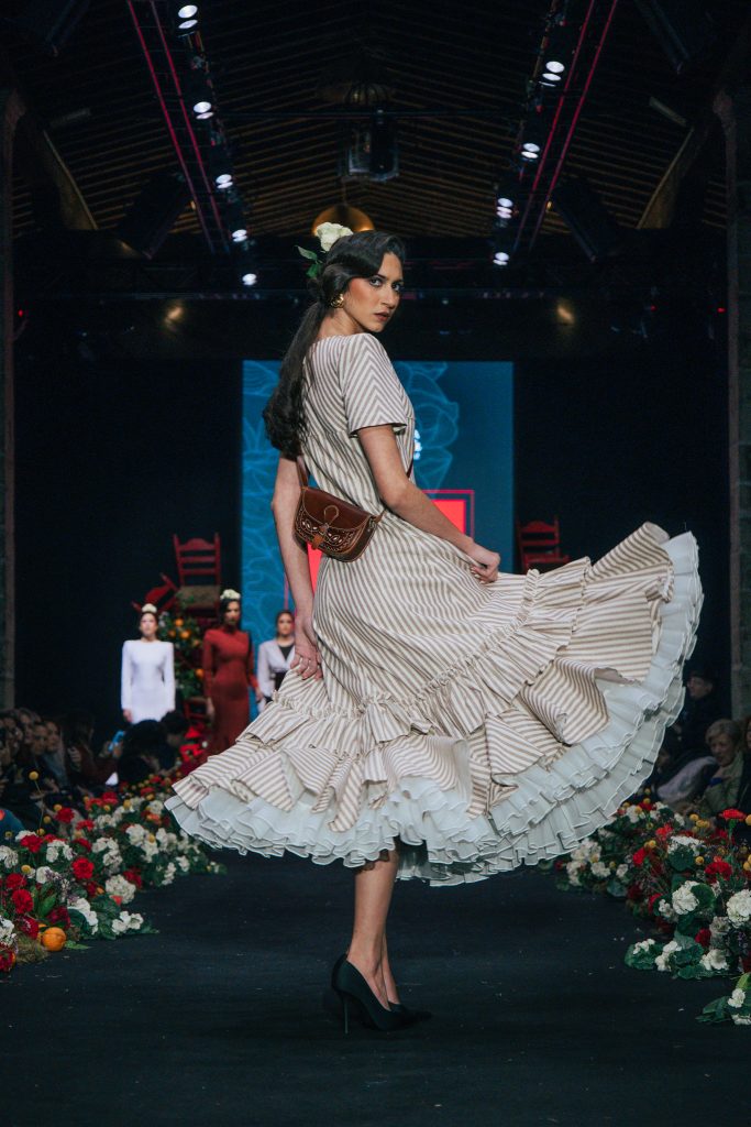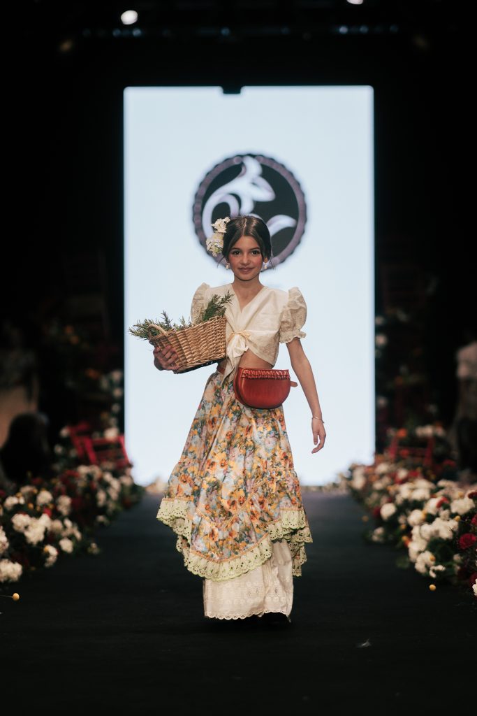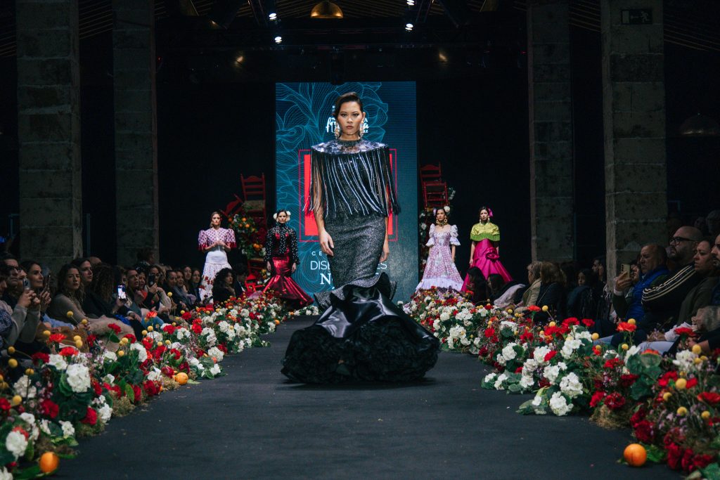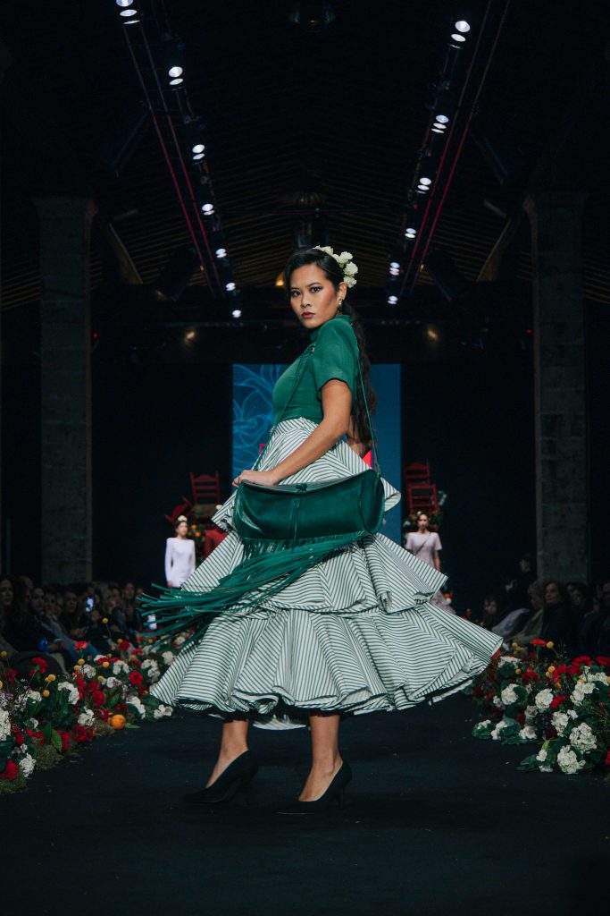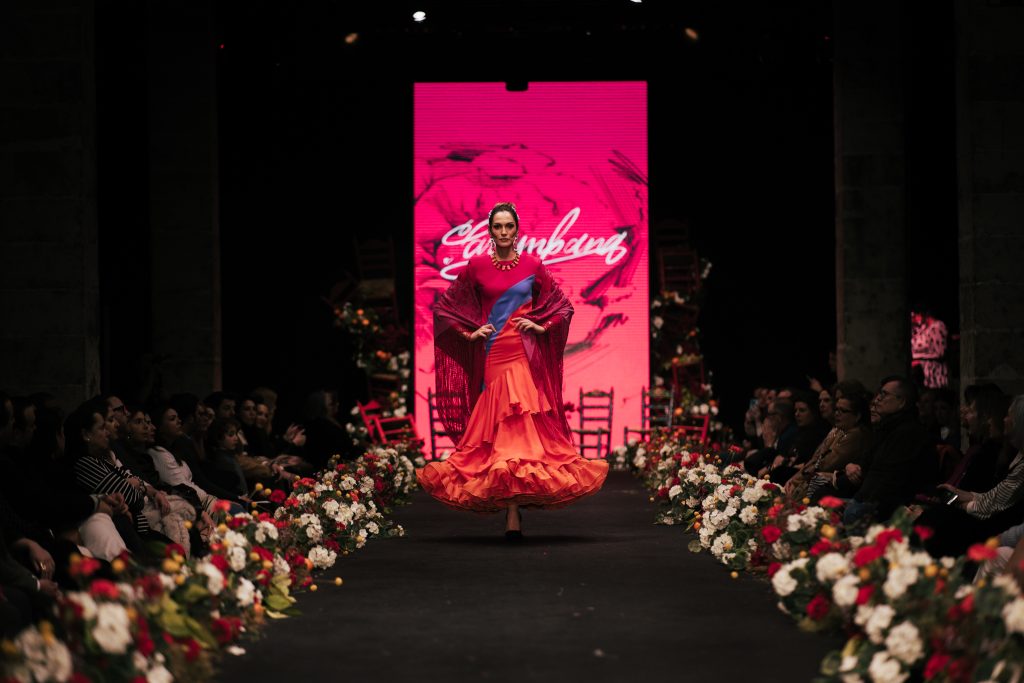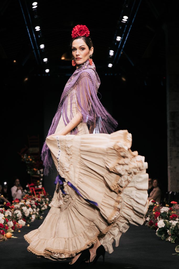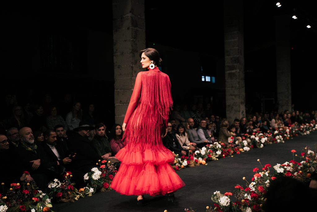 En ese mismo pase, Micaela Villa propuso un juego de contrastes cromáticos con cuerpos ajustados y faldas largas de volantes escalonados, reforzados con mantones en oposición cromática y flores como elemento de estilismo. Su flamenca subrayó la caída, el vuelo y la claridad de la presencia en pasarela.