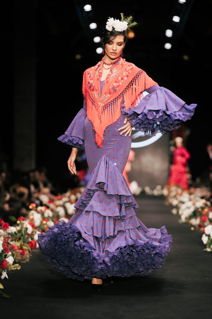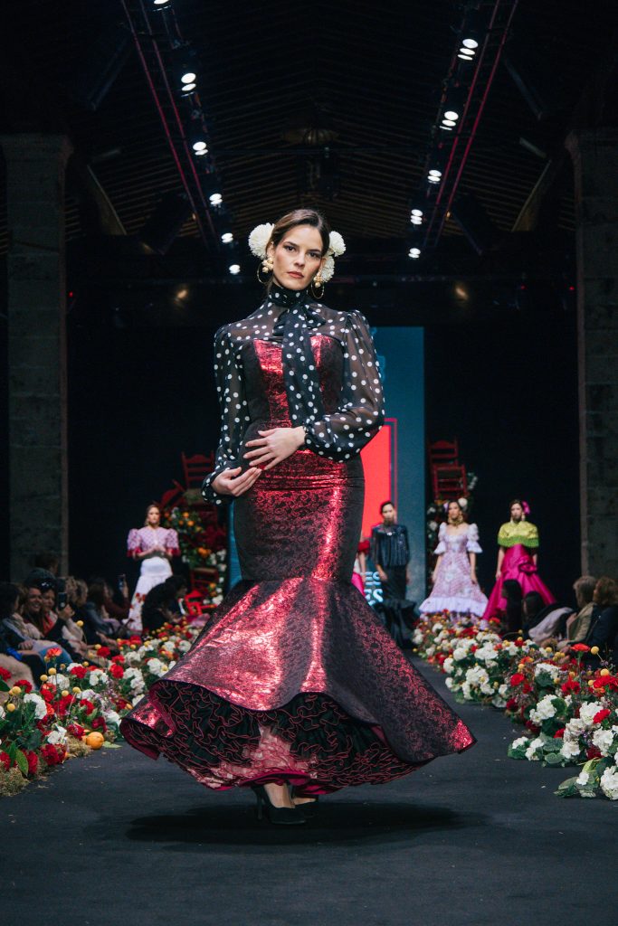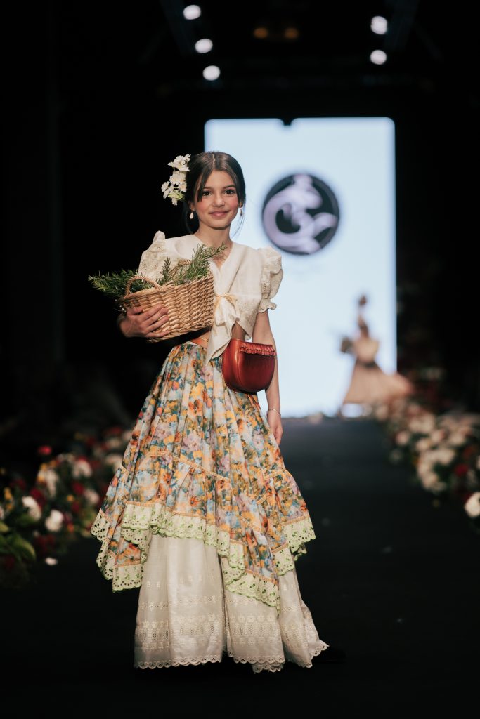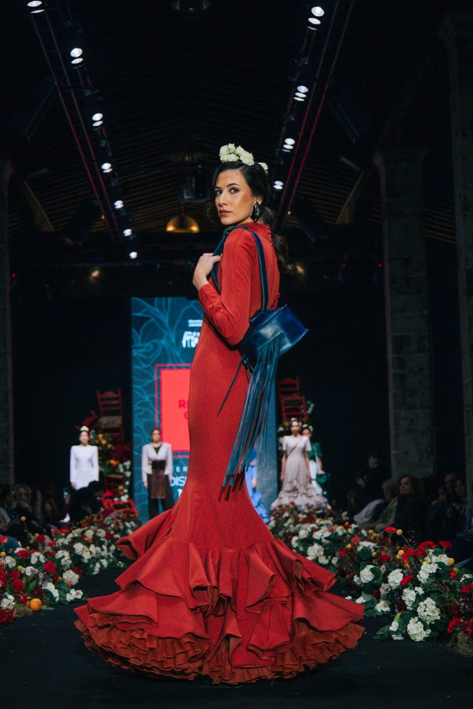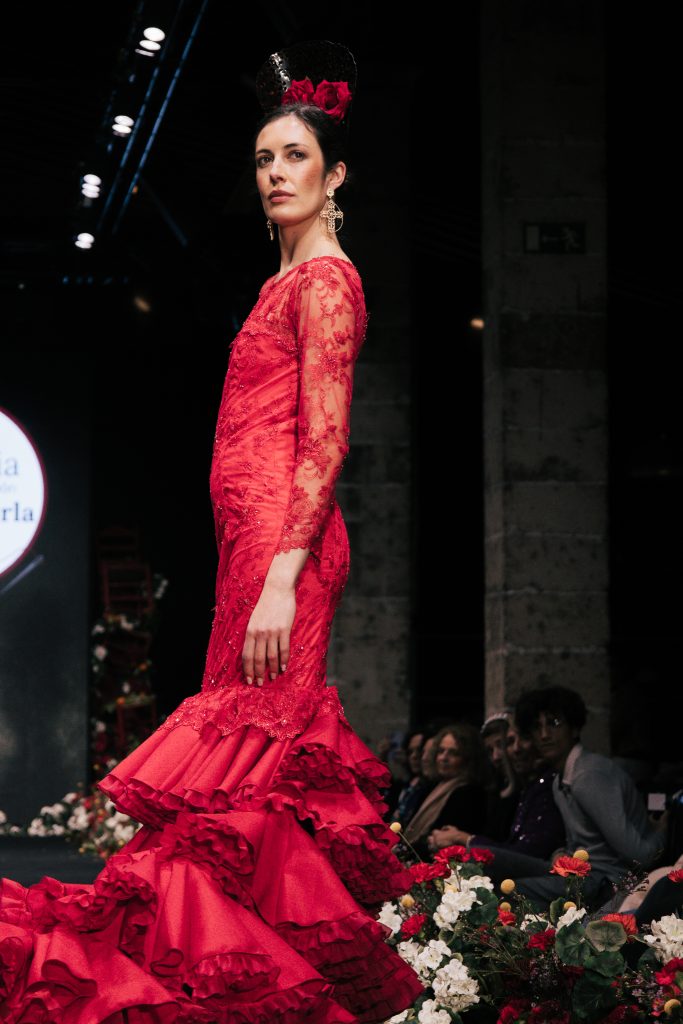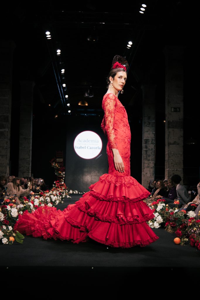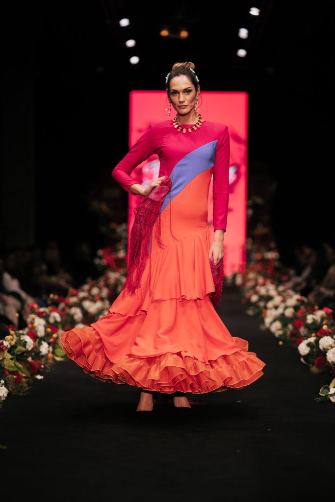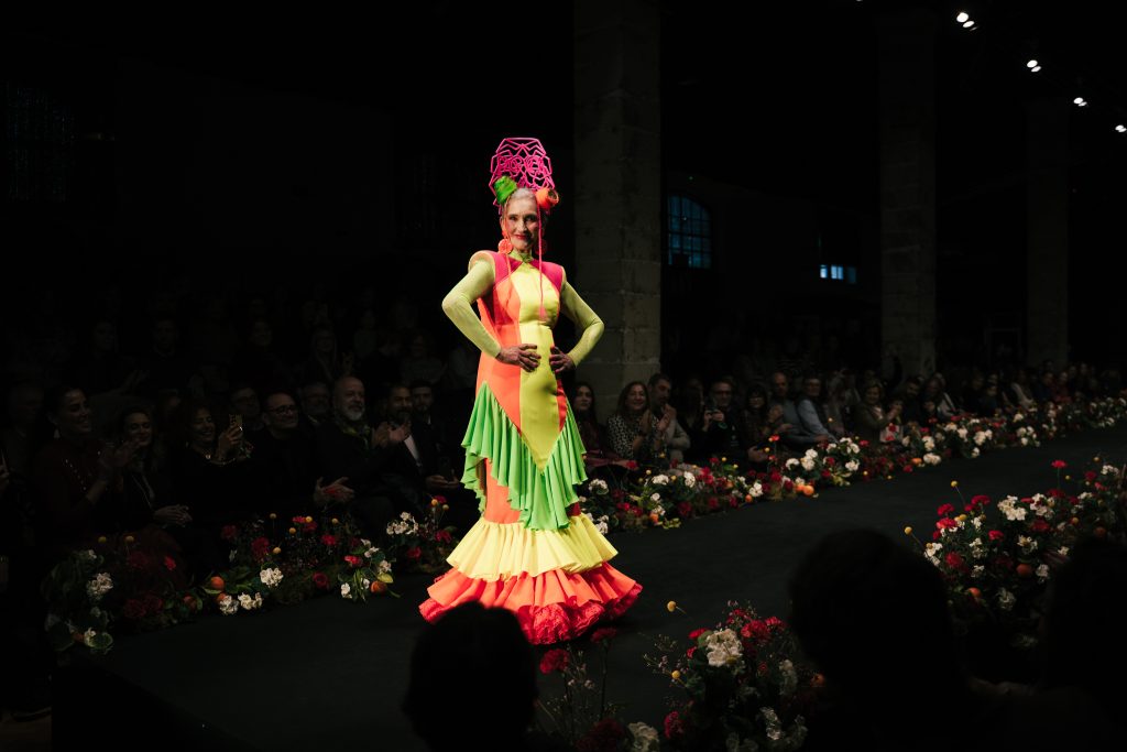 En ese mismo pase, Micaela Villa propuso un juego de contrastes cromáticos con cuerpos ajustados y faldas largas de volantes escalonados, reforzados con mantones en oposición cromática y flores como elemento de estilismo. Su flamenca subrayó la caída, el vuelo y la claridad de la presencia en pasarela.