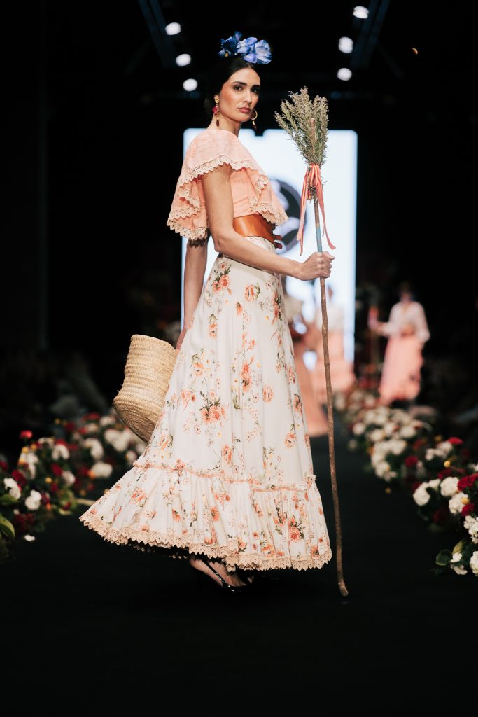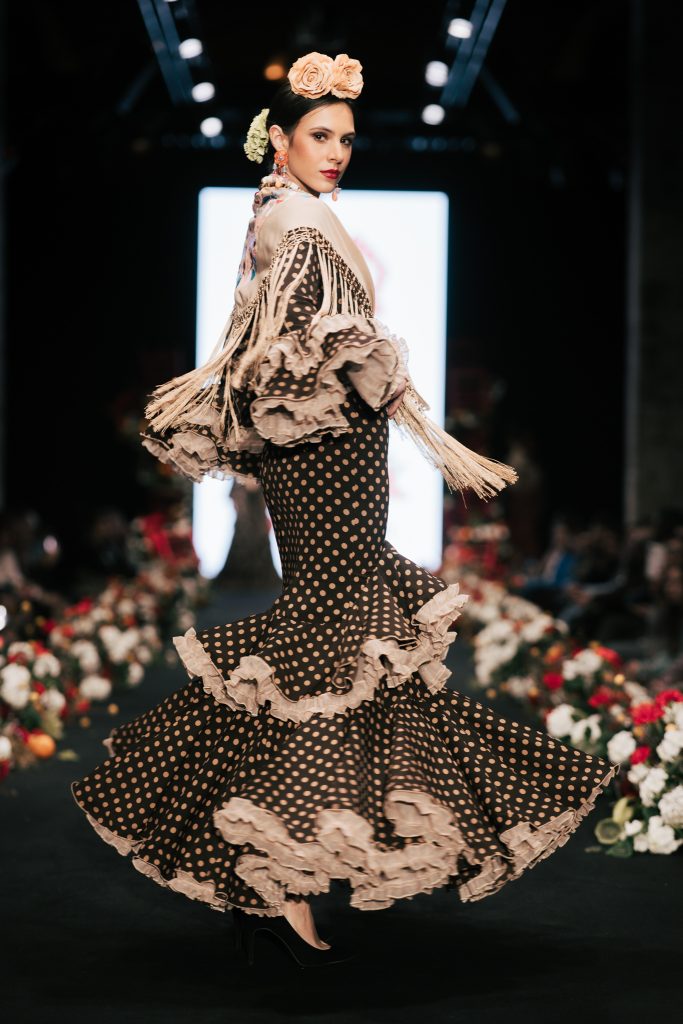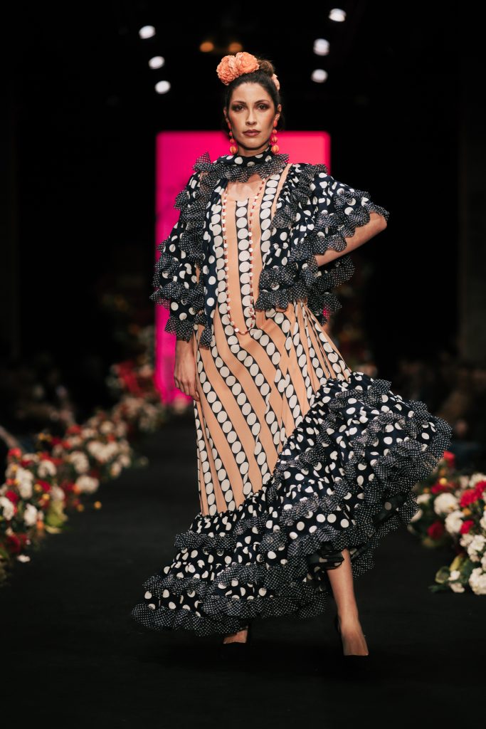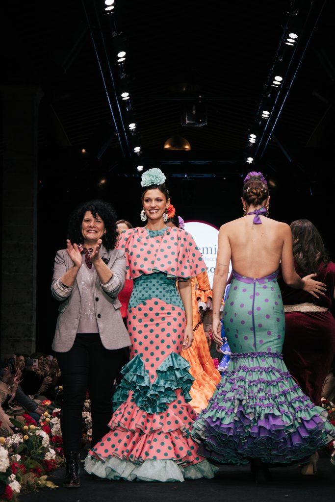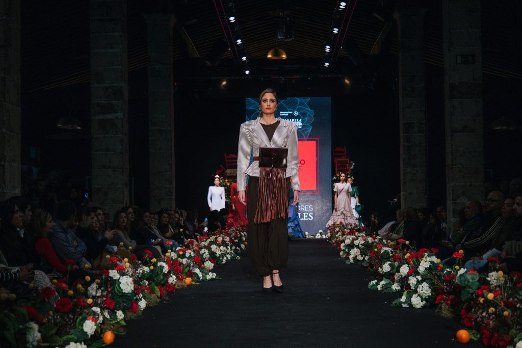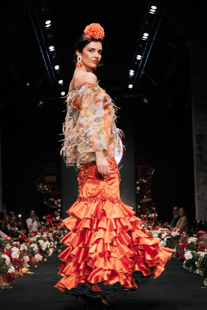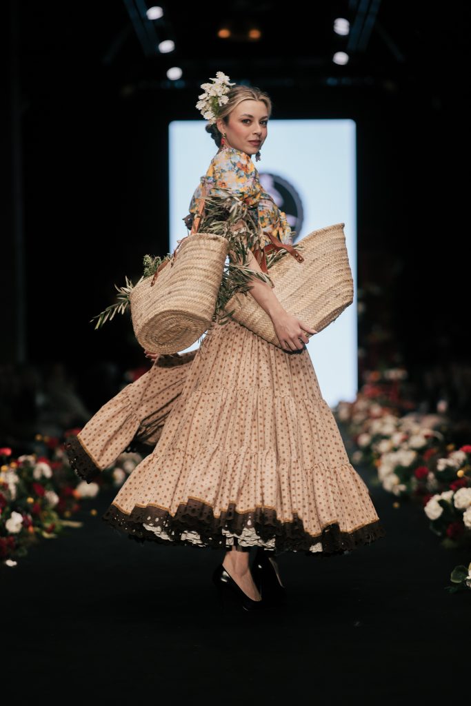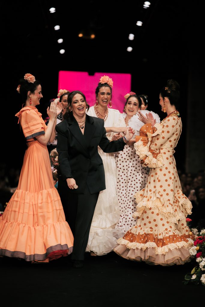 En ese mismo pase, Micaela Villa propuso un juego de contrastes cromáticos con cuerpos ajustados y faldas largas de volantes escalonados, reforzados con mantones en oposición cromática y flores como elemento de estilismo. Su flamenca subrayó la caída, el vuelo y la claridad de la presencia en pasarela.