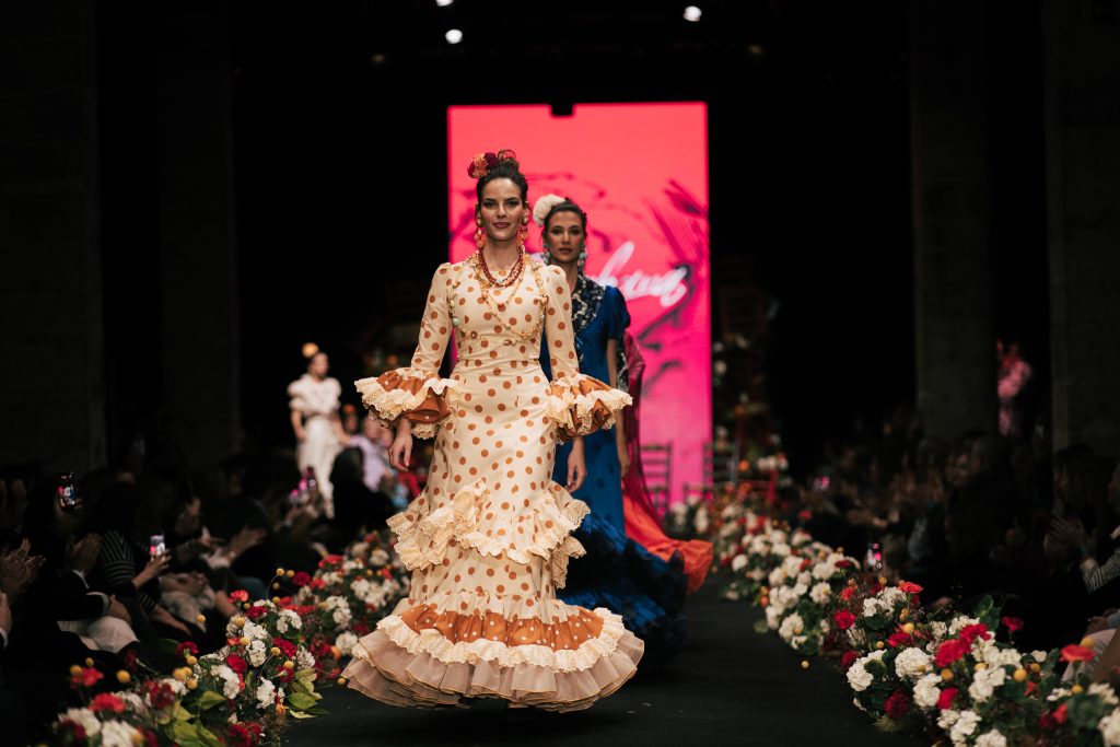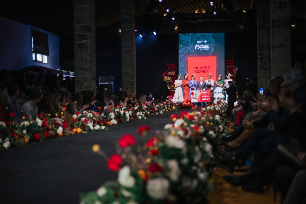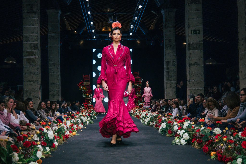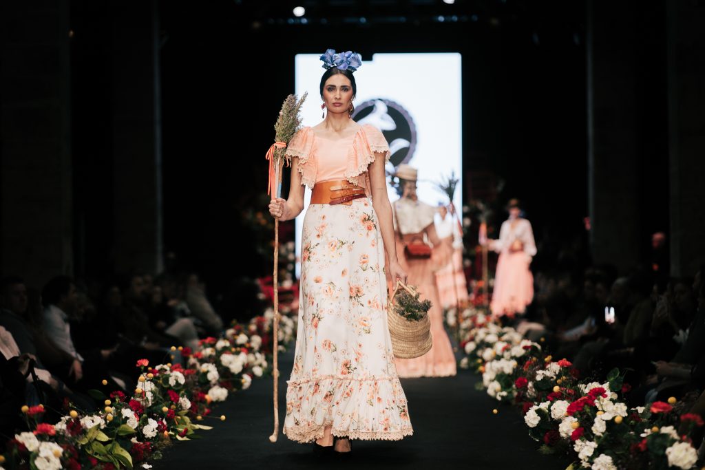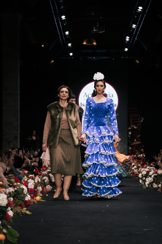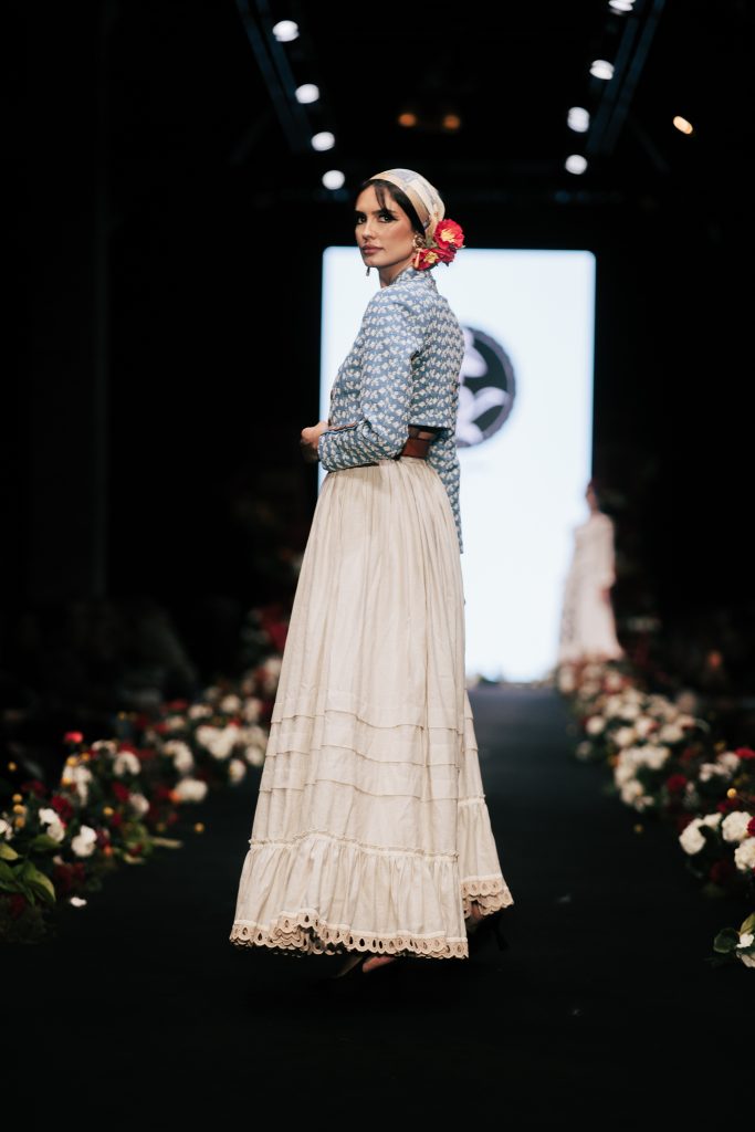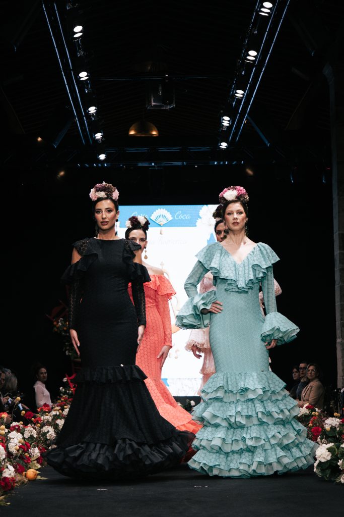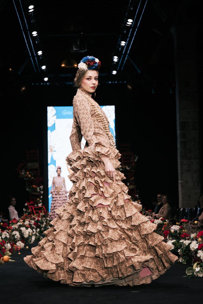 En ese mismo pase, Micaela Villa propuso un juego de contrastes cromáticos con cuerpos ajustados y faldas largas de volantes escalonados, reforzados con mantones en oposición cromática y flores como elemento de estilismo. Su flamenca subrayó la caída, el vuelo y la claridad de la presencia en pasarela.