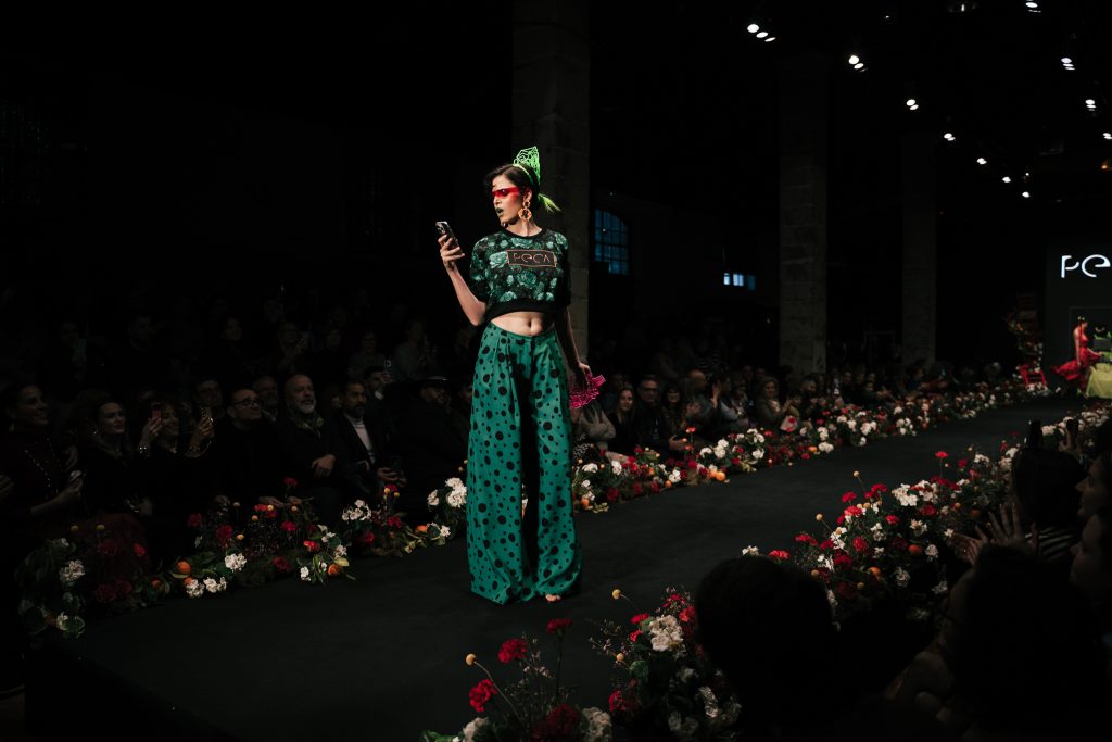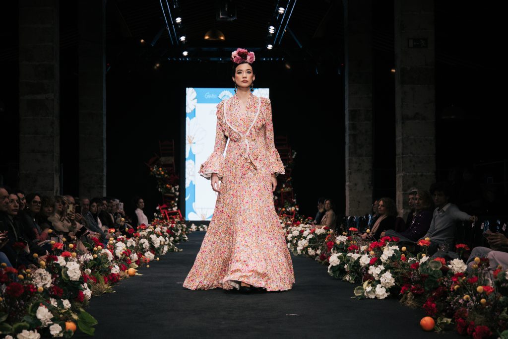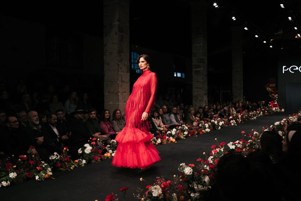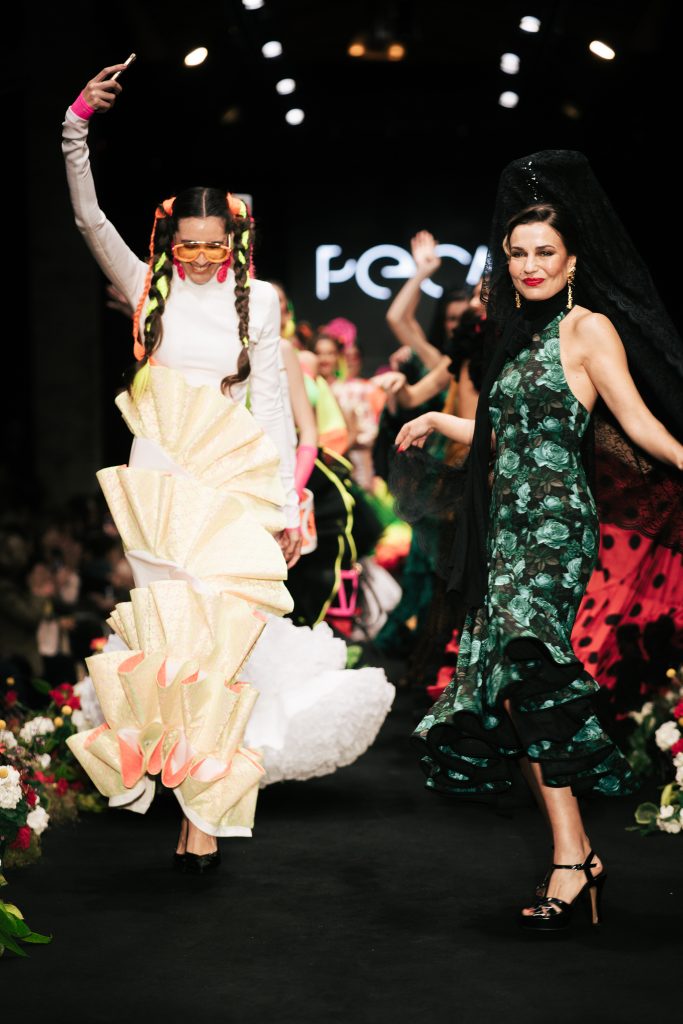 Uno de los desfiles más comentados fue el de Peca con “Hijas del Quejío”, donde la firma repartió pulseras de neón al público como anticipo de la fiesta que se vería después. Pedro Serrano y Carlos Rey plantearon un cruce entre patronaje tradicional y reinterpretación psicodélica con influencias trap, colores vibrantes y propuestas para flamencas atrevidas.