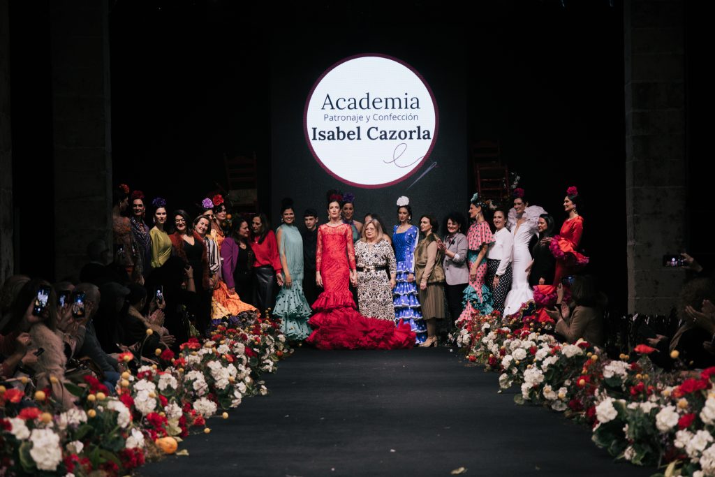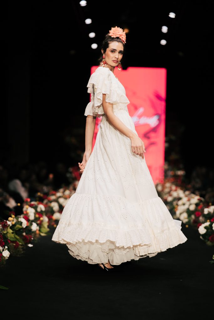 También destacó la presencia de la Academia Isabel Cazorla con “Amaneceres”, concebida como metáfora del debut profesional, donde cada diseño funcionó como declaración de intenciones. A continuación, Gloria Coca presentó “Ellas”, un homenaje a la mujer resistente que se recompone cada día sin perder su imaginación. La diseñadora recuperó recursos tradicionales como ondulinas y perforados, volantes pequeños y cortes desde cintura para crear una flamenca de romanticismo contemporáneo.