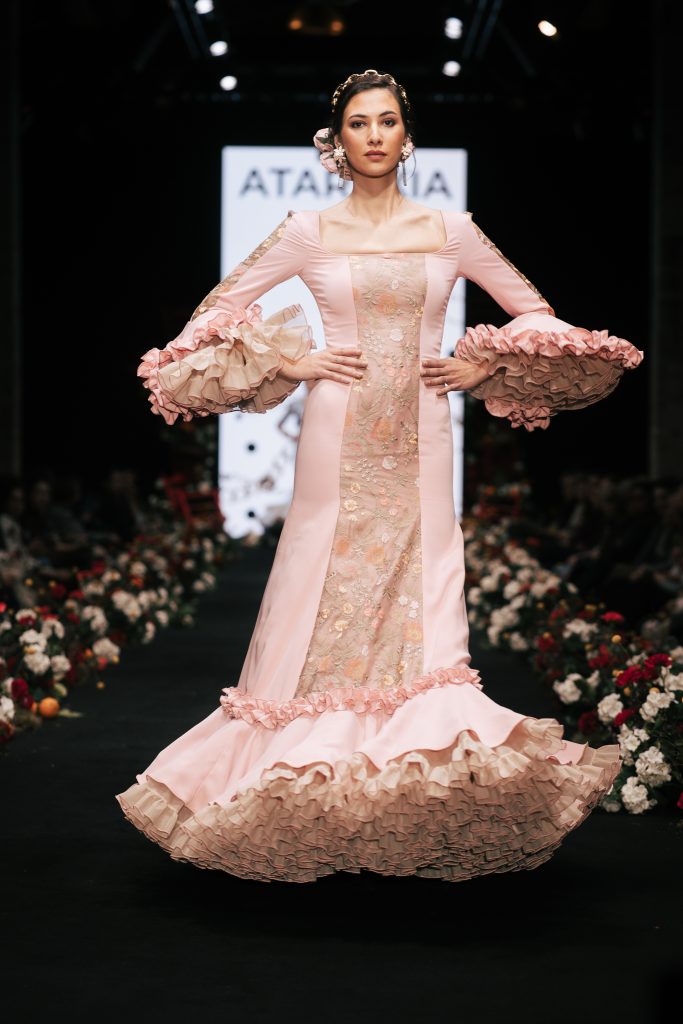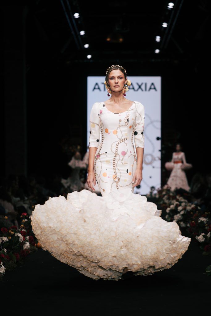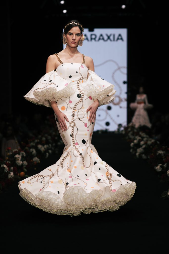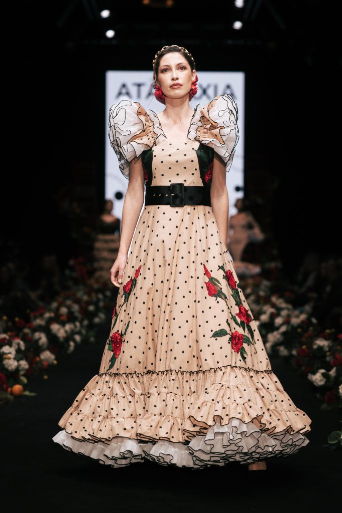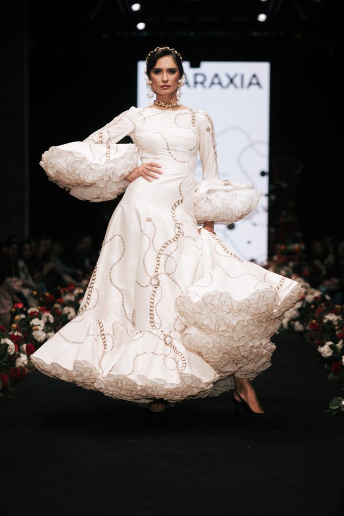 También destacó la presencia de la Academia Isabel Cazorla con “Amaneceres”, concebida como metáfora del debut profesional, donde cada diseño funcionó como declaración de intenciones. A continuación, Gloria Coca presentó “Ellas”, un homenaje a la mujer resistente que se recompone cada día sin perder su imaginación. La diseñadora recuperó recursos tradicionales como ondulinas y perforados, volantes pequeños y cortes desde cintura para crear una flamenca de romanticismo contemporáneo.