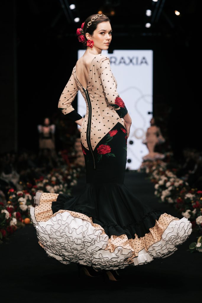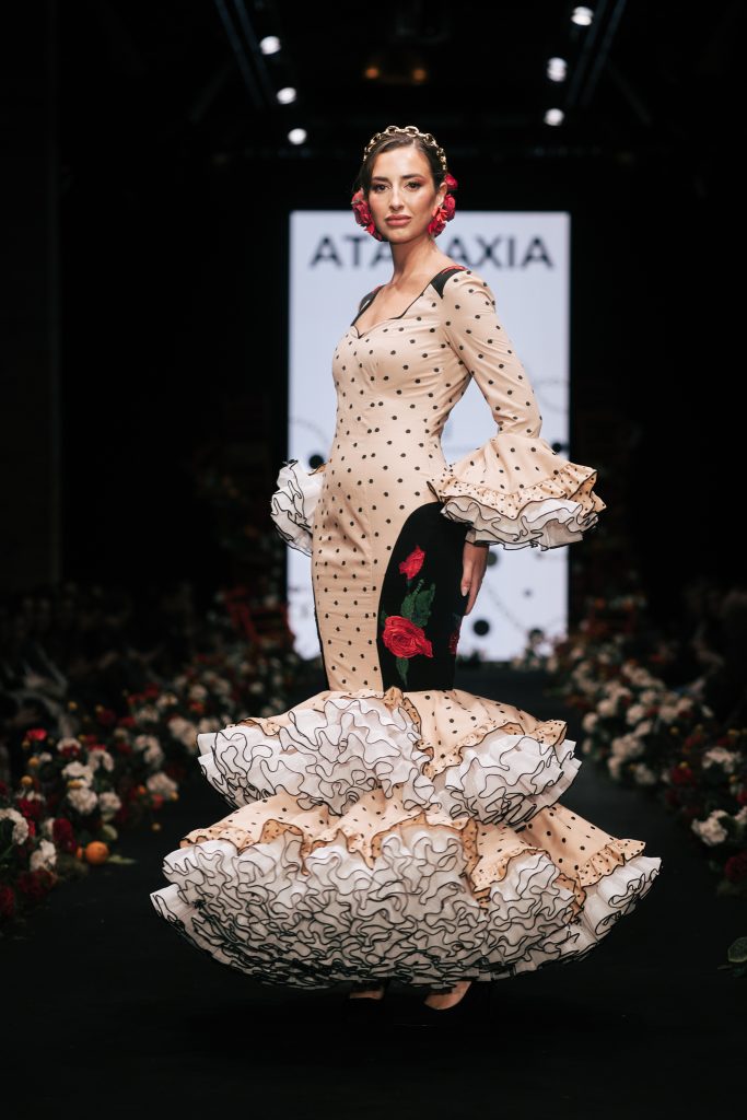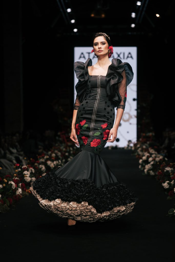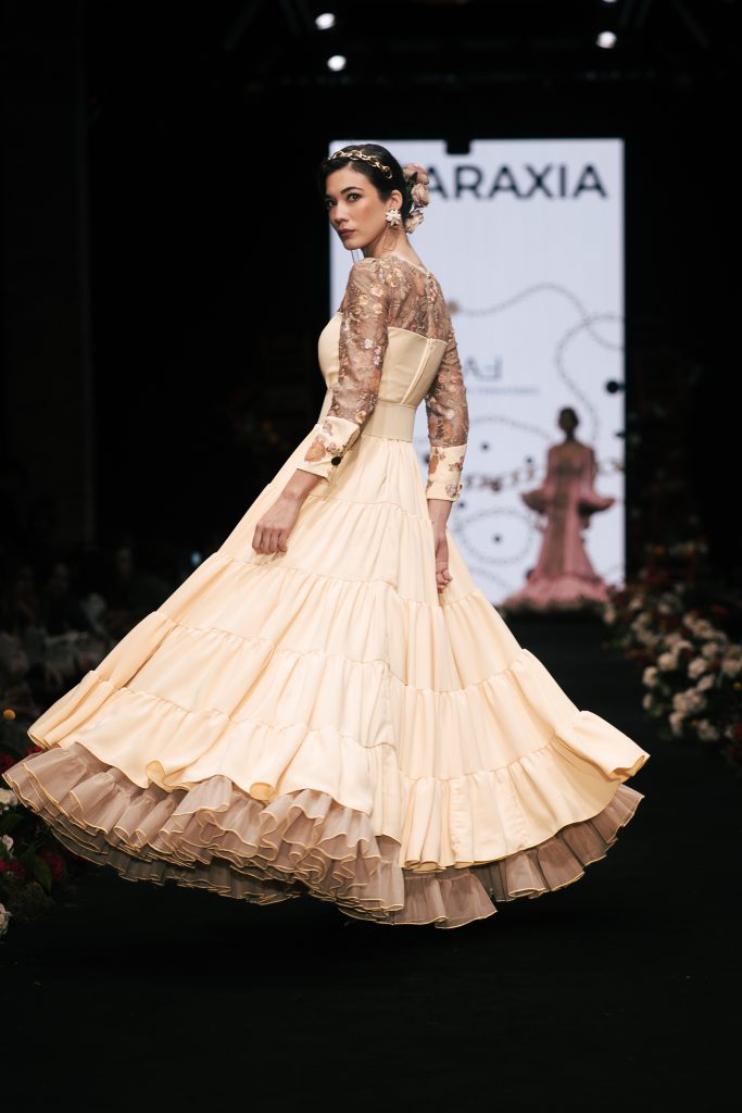 En ese mismo pase, Micaela Villa propuso un juego de contrastes cromáticos con cuerpos ajustados y faldas largas de volantes escalonados, reforzados con mantones en oposición cromática y flores como elemento de estilismo. Su flamenca subrayó la caída, el vuelo y la claridad de la presencia en pasarela.