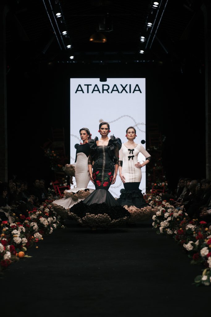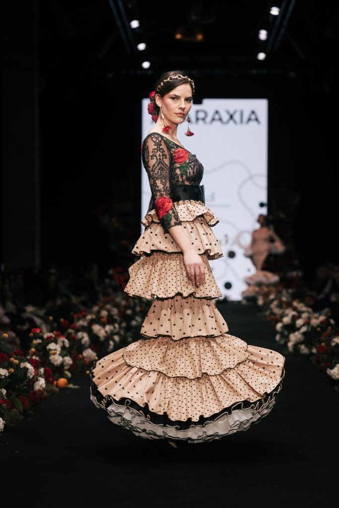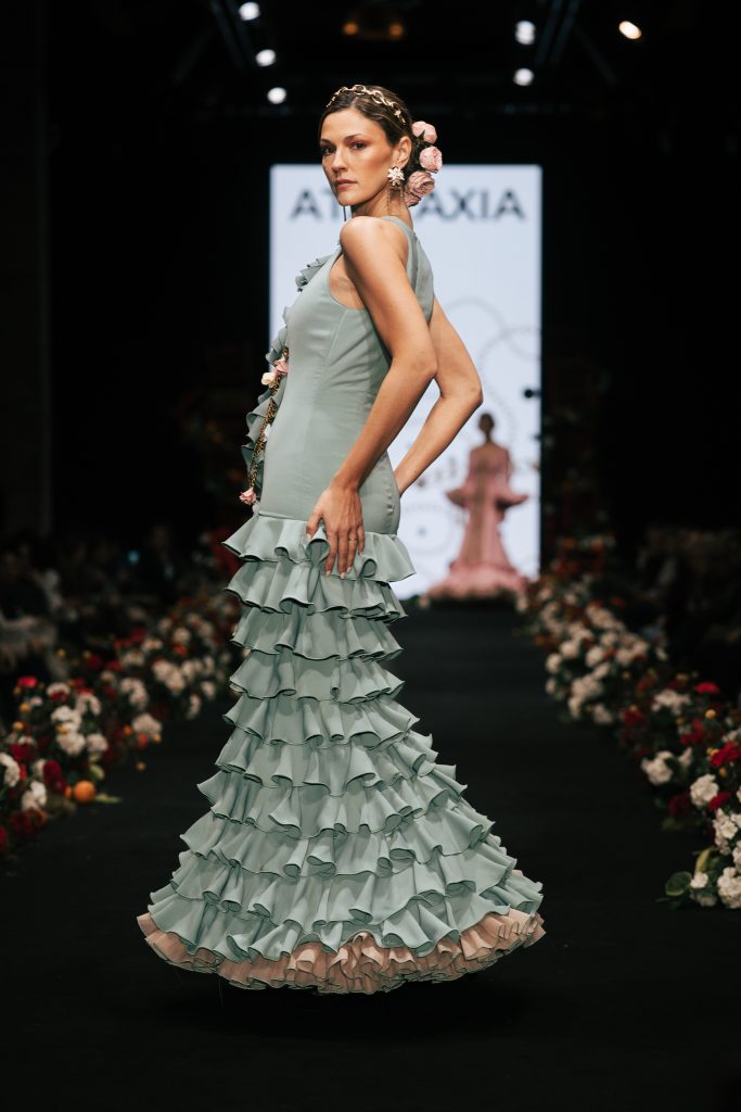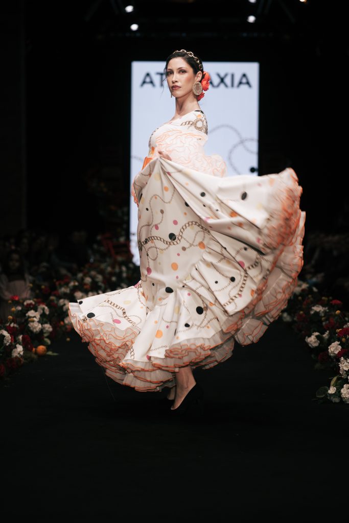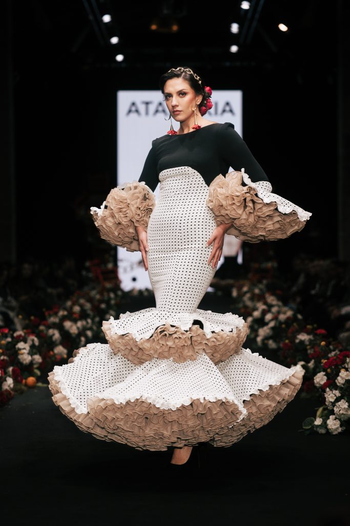 En ese mismo pase, Micaela Villa propuso un juego de contrastes cromáticos con cuerpos ajustados y faldas largas de volantes escalonados, reforzados con mantones en oposición cromática y flores como elemento de estilismo. Su flamenca subrayó la caída, el vuelo y la claridad de la presencia en pasarela.