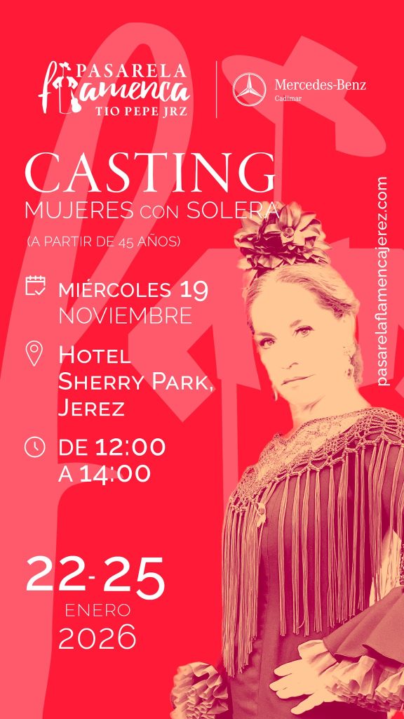La Pasarela Flamenca Jerez Tío Pepe ha anunciado la convocatoria del casting “Mujeres con Solera”, una iniciativa que busca a mujeres mayores de 45 años para desfilar en su próxima edición. El proceso de selección se celebrará el miércoles 19 de noviembre de 2025, de 12:00 a 14:00 horas, en el Hotel Sherry Park de Jerez de la Frontera.