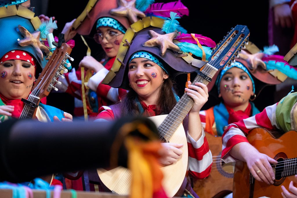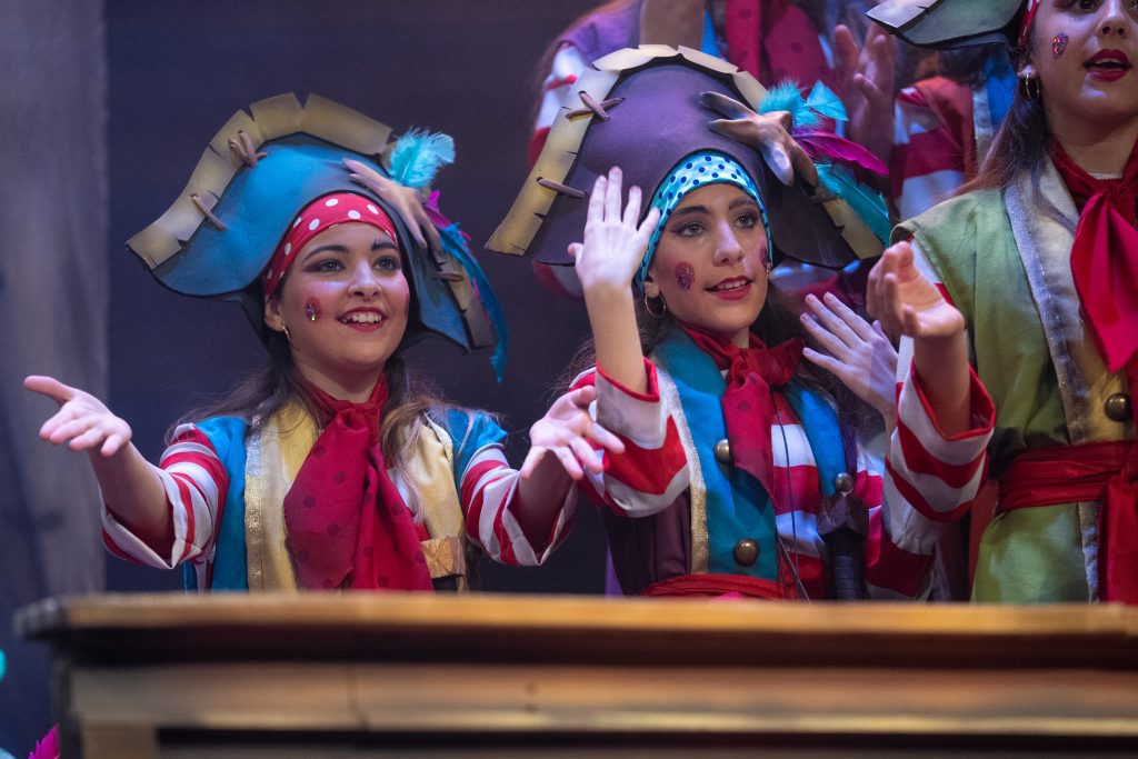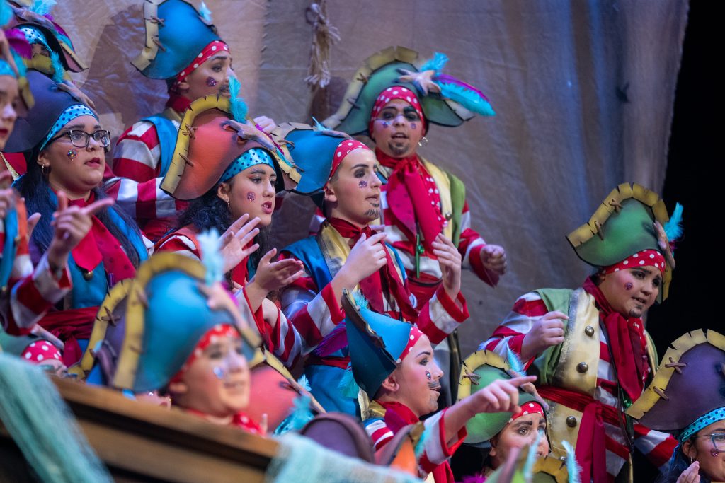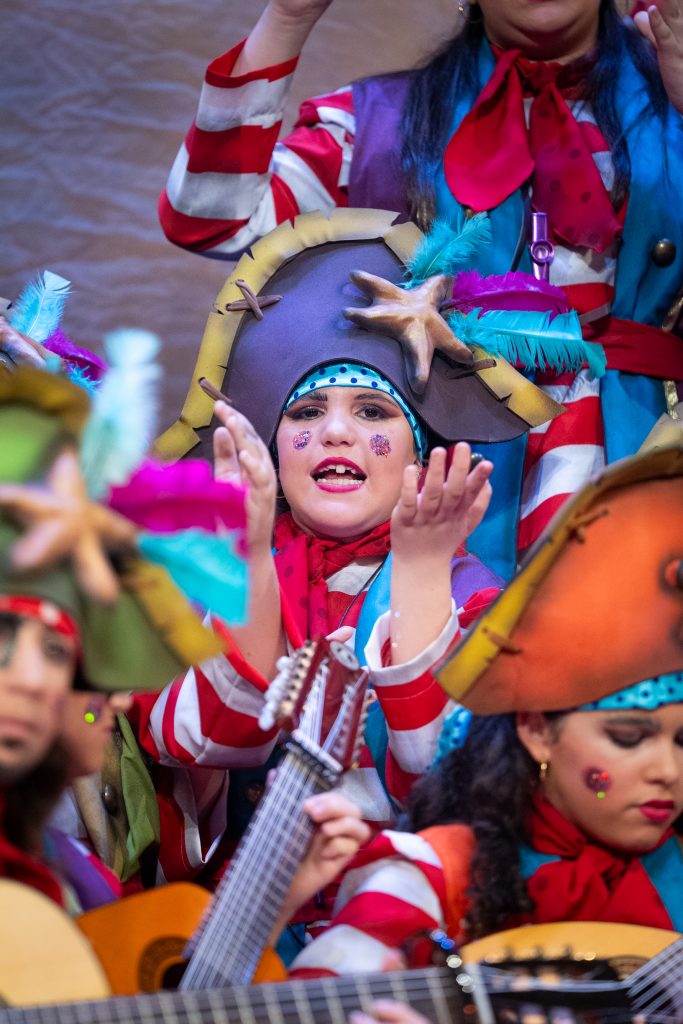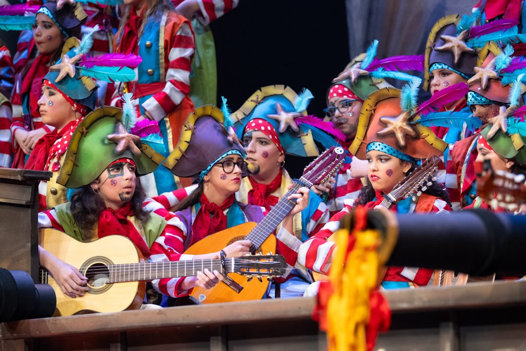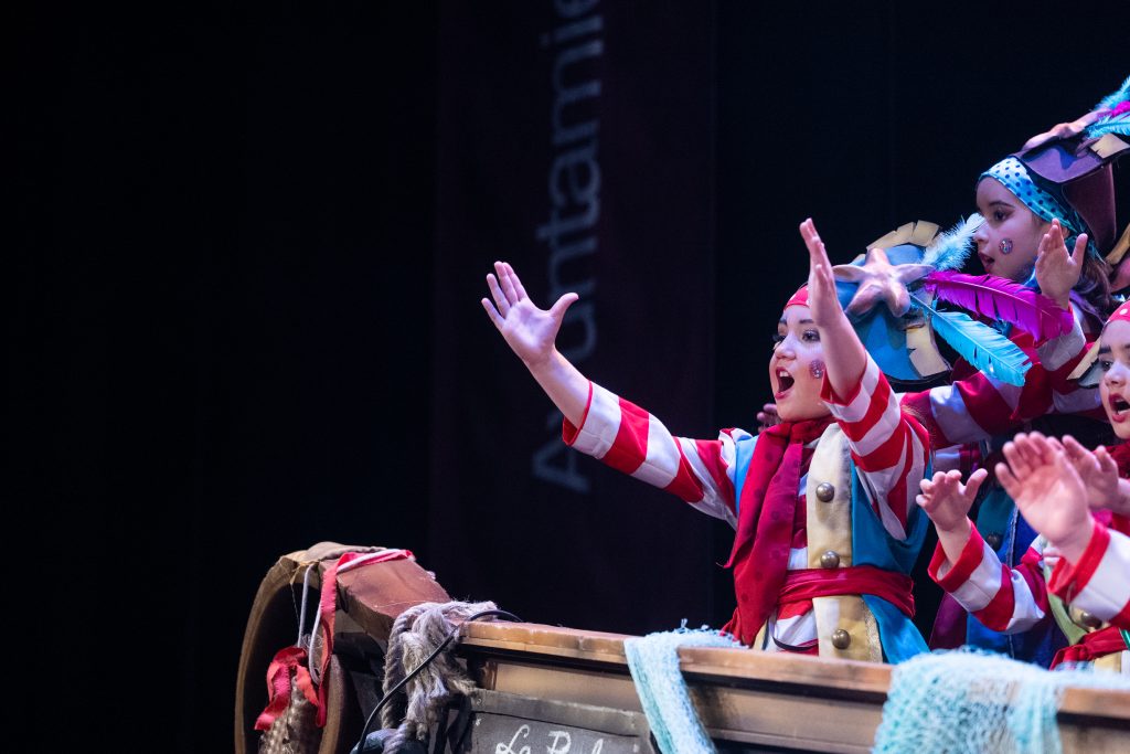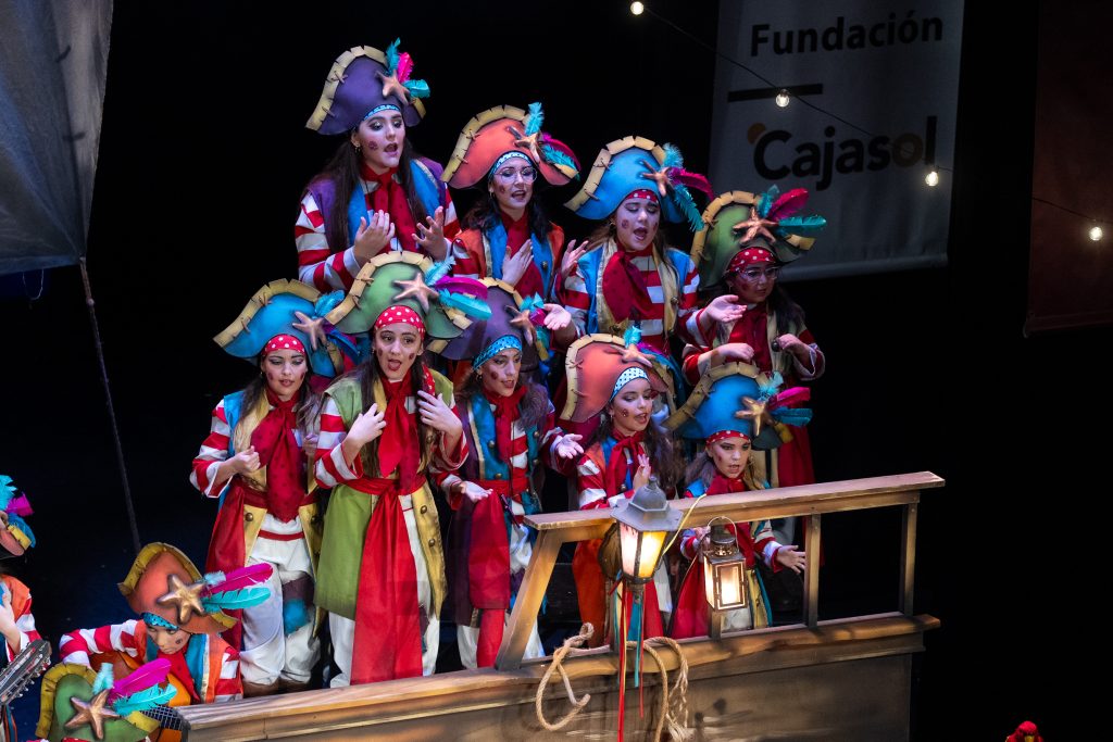 El tipo remitía al pirata clásico, aunque tamizado por un colorismo festivo apto para infantil. La música de presentación combinó la banda sonora de Piratas del Caribe, el tema El pregonero del Carnaval de Antoñito Molina —himno popularizado en 2025— y un guiño final a Los piratas de Antonio Martínez Ares. Esa triple cita no necesitó explicación: contextualizó el viaje, marcó el tono y estableció la identidad carnavalesca inmediata del grupo.