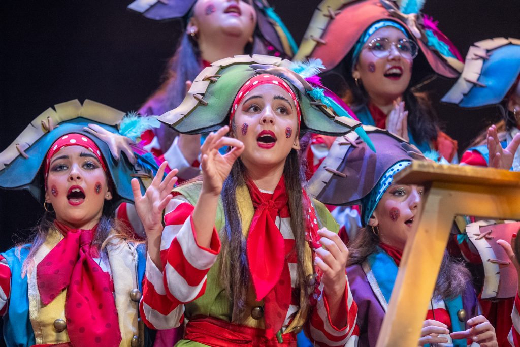 Los cuplés introdujeron un giro humorístico. El primero se dirigió a los fichajes del Cádiz CF, mencionando a varios jugadores con el remate de que el equipo “no llega ni al play-off”. La mención futbolística funcionó por proximidad geográfica y por reconocimiento colectivo en patio de butacas. El segundo cuplé giró hacia los rascas de lotería, protagonizado por un abuelo que “rasca hasta los lunares a ver si dan premio”. La escena fue ligera, doméstica y bien entendida en registración infantil. El bloque de cuplés intercaló una breve pausa entre piezas, fenómeno habitual en infantil por cuestiones logísticas y respiratorias.