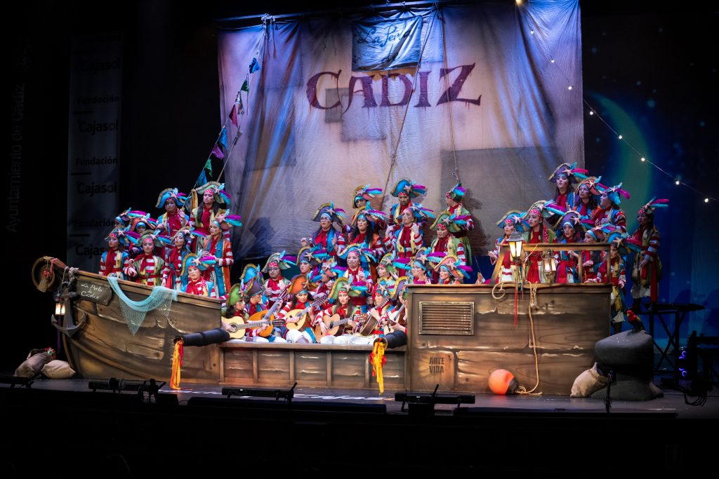 El coro infantil ‘La perla de Cádiz’, procedente de Chiclana de la Frontera, abrió su actuación en el COAC 2026 con un despliegue escénico poco habitual en cantera: un galeón pirata completo, tripulación distribuida entre proa, centro y popa, vela con la leyenda “Cádiz” y un cuerpo coral que alcanzó los 42 componentes. Una parte del público vestía camisetas negras con el nombre de la agrupación, lo que anticipó un recibimiento cálido y un entorno favorable para un coro que, según recordaba la retransmisión, procede de un proyecto que ya en ediciones previas había conseguido resultados destacados.