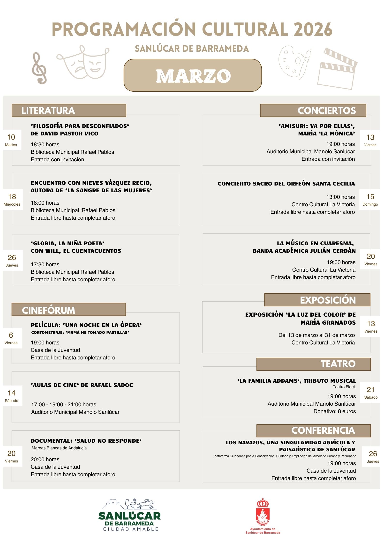 La programación cultural de marzo en Sanlúcar, presentada por la Delegación de Cultura, se desarrollará en distintos espacios municipales con actividades como presentaciones de libros, conciertos, proyecciones y exposiciones dirigidas a todos los públicos.