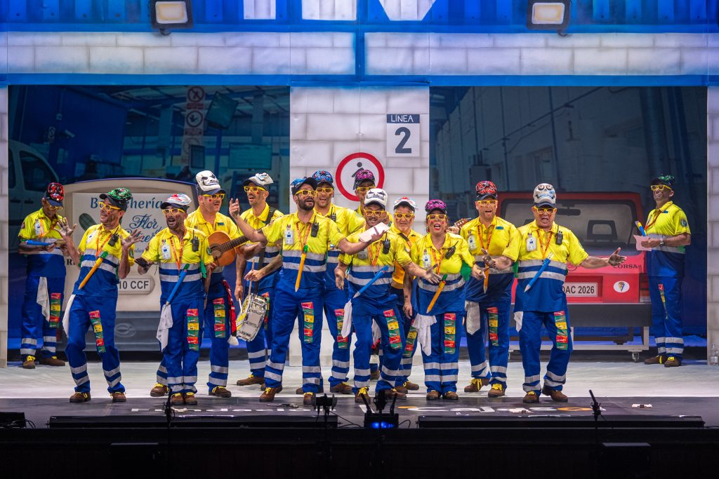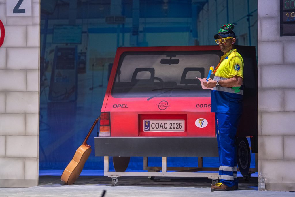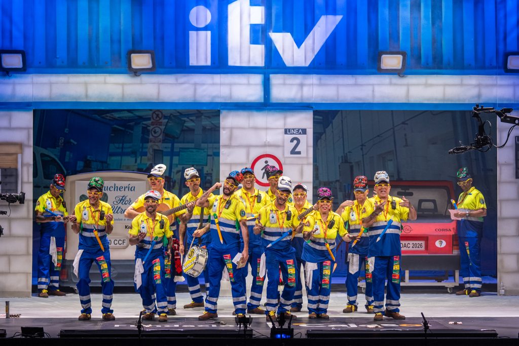 El popurrí fue el tramo que mejor ensambló el tipo, la crítica y el humor. La chirigota entró en una sucesión de escenas que llevaron la ITV a múltiples ámbitos: coches tuneados, vehículos cofrades, furgonetas de reparto, camperización, narcotráfico, hostelería y conducción eclesial. La aparición de referencias como “Carglas”, “Macarena”, “Carrero” y “Tesla” generó contraste entre actualidad y cultura popular. El cierre, con una lectura delirante del sueño de vehículos voladores, dejó el tramo más aplaudido del pase.
