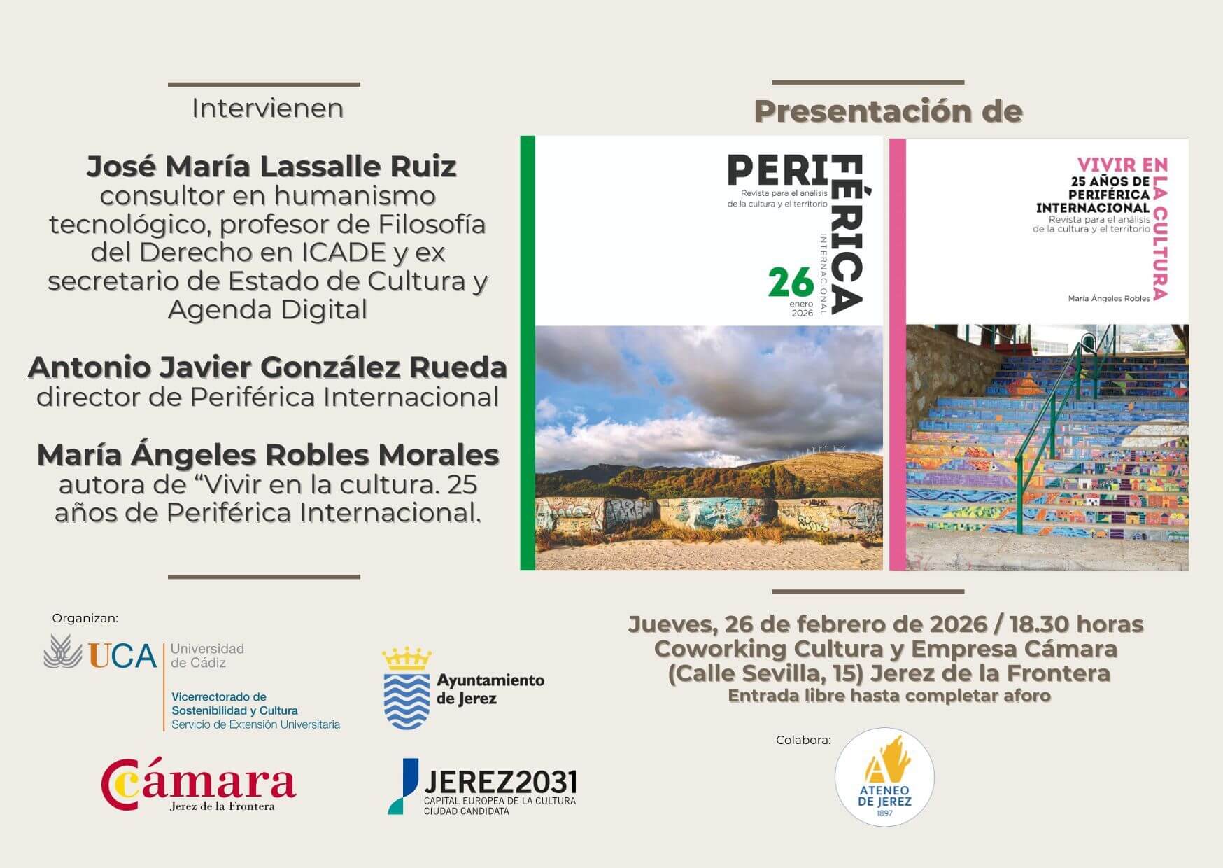 La revista Periférica Internacional en Jerez celebrará este jueves 26 de febrero un acto abierto al público en el Coworking Cultura y Empresa Cámara de Jerez, donde también se presentará el libro “Vivir en la cultura. 25 años de Periférica Internacional”.