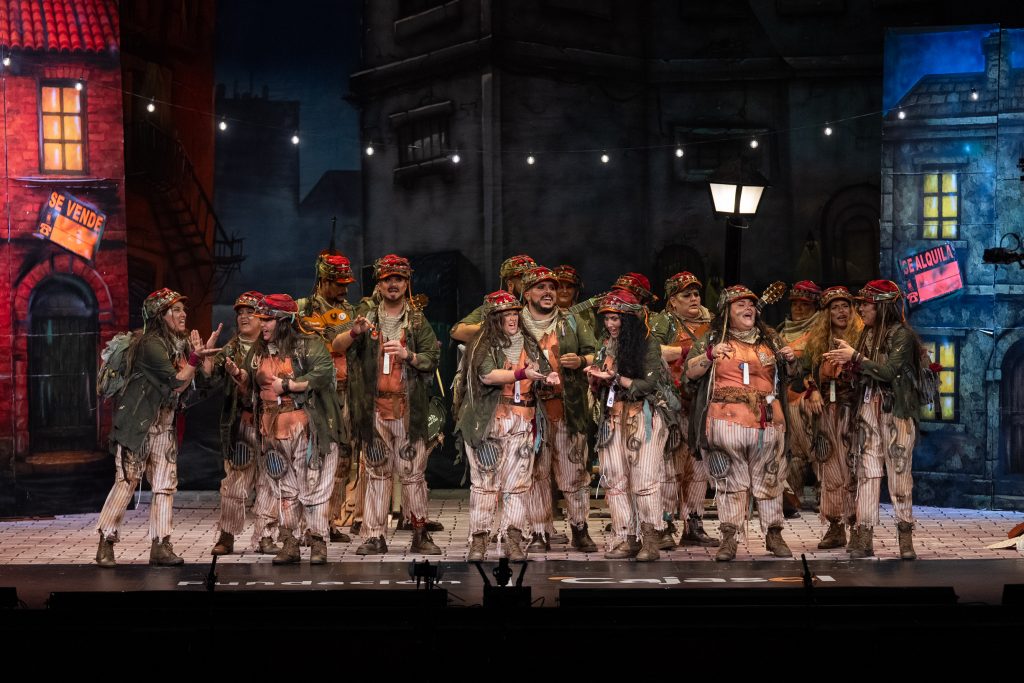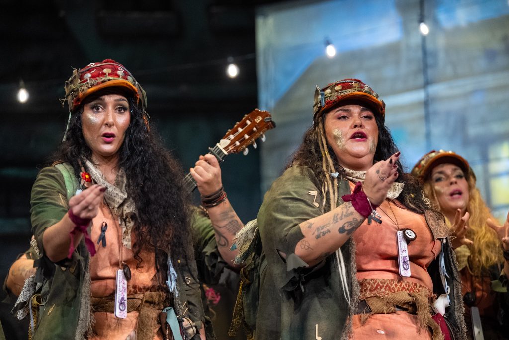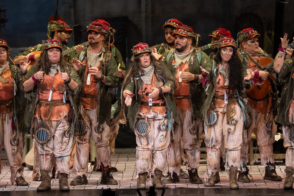 La comparsa de Tarifa presentó en el Gran Teatro Falla ‘La última cuerda’, una propuesta sobre la música y la calle como refugio vital que deja buenas intenciones, pero escasa evolución artística.