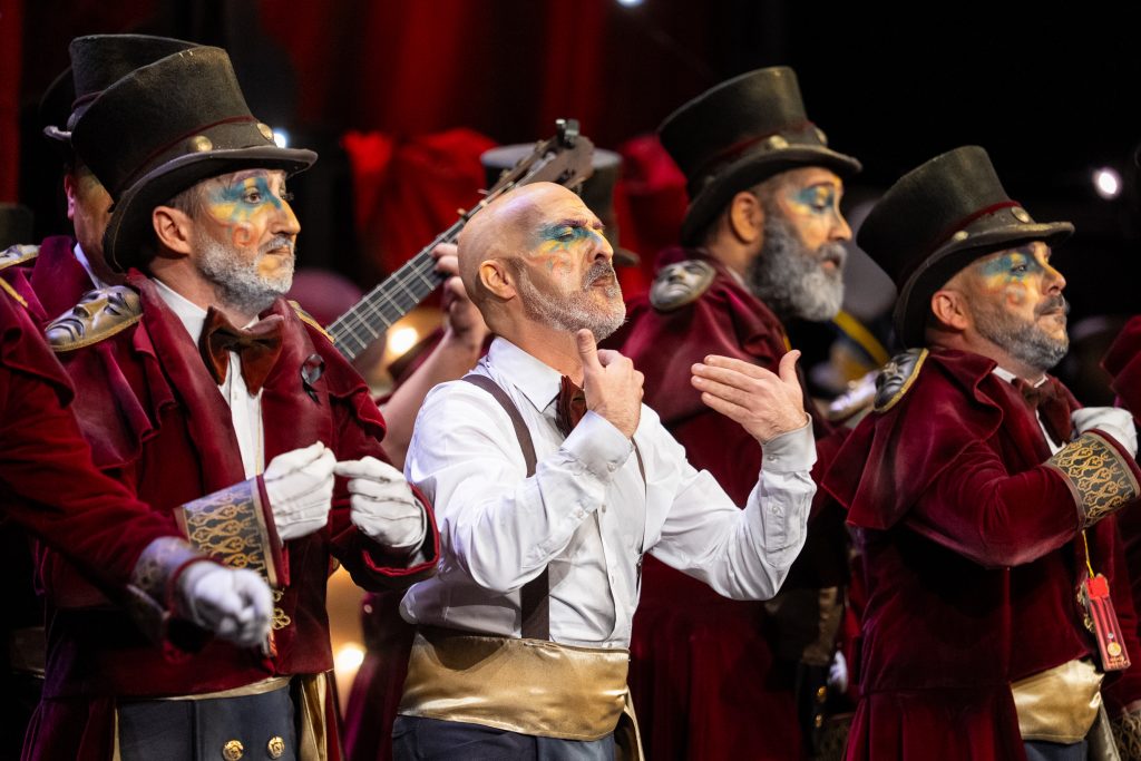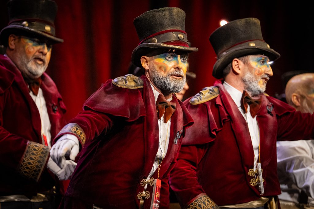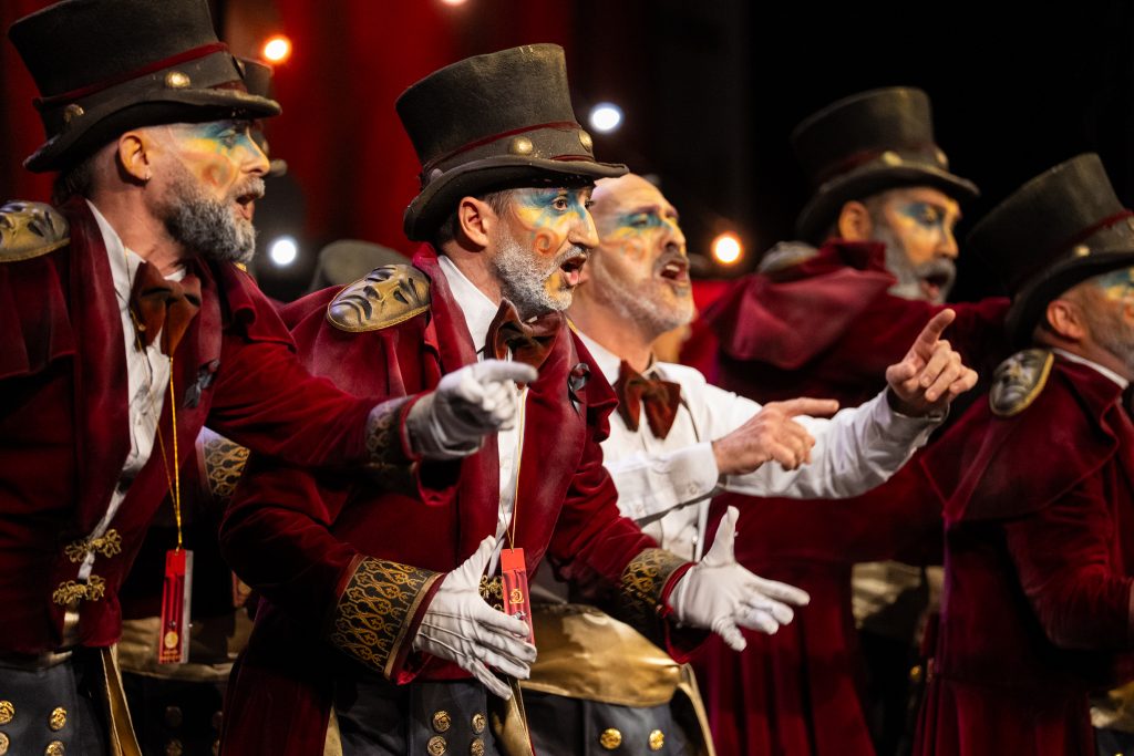 El popurrí es donde mejor se respira la atmósfera planteada al inicio. El grupo vuelve al escenario como espacio biográfico para reivindicar la figura de quienes trabajan en la sombra: costureras, técnicos, escenógrafos y equipo artístico. Una de las cuartetas más celebradas se centra precisamente en la costurera, presentada como trabajadora invisible cuyo mérito sostiene la puesta en escena. La última pieza introduce elementos de despedida explícita y el telón adquiere protagonismo como símbolo de la separación entre vida pública y privada. La escena final, con el teatro como hogar y el Carnaval como oficio, es la imagen más sólida del concepto.