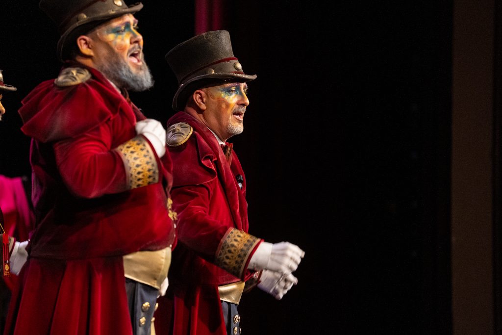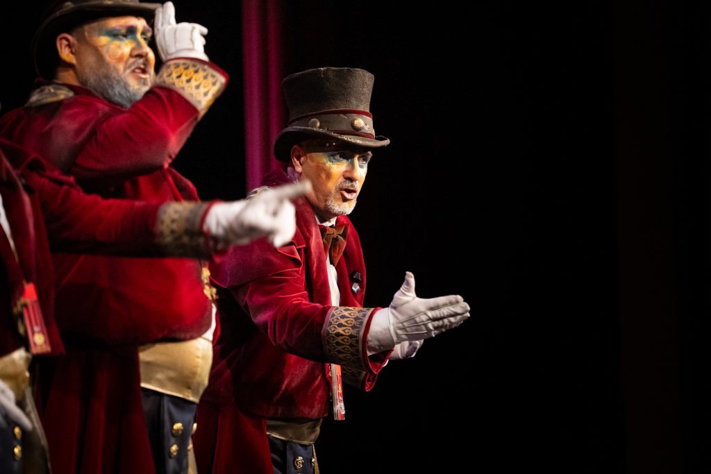 La presentación define desde el inicio las coordenadas de la propuesta. Candilejas, maquillaje, cortinas y telón remiten al instante en el que el artista se queda solo con sus nervios antes de enfrentarse al público. La letra subraya la relación íntima del comparsista con el teatro, situándolo frente a su final. Pastrana introduce referencias a su propia trayectoria —más de tres décadas en el Concurso— lo que refuerza el carácter testimonial y personalista del planteamiento. El grupo no entra en la competición por volumen o potencia; su apuesta es narrativa.