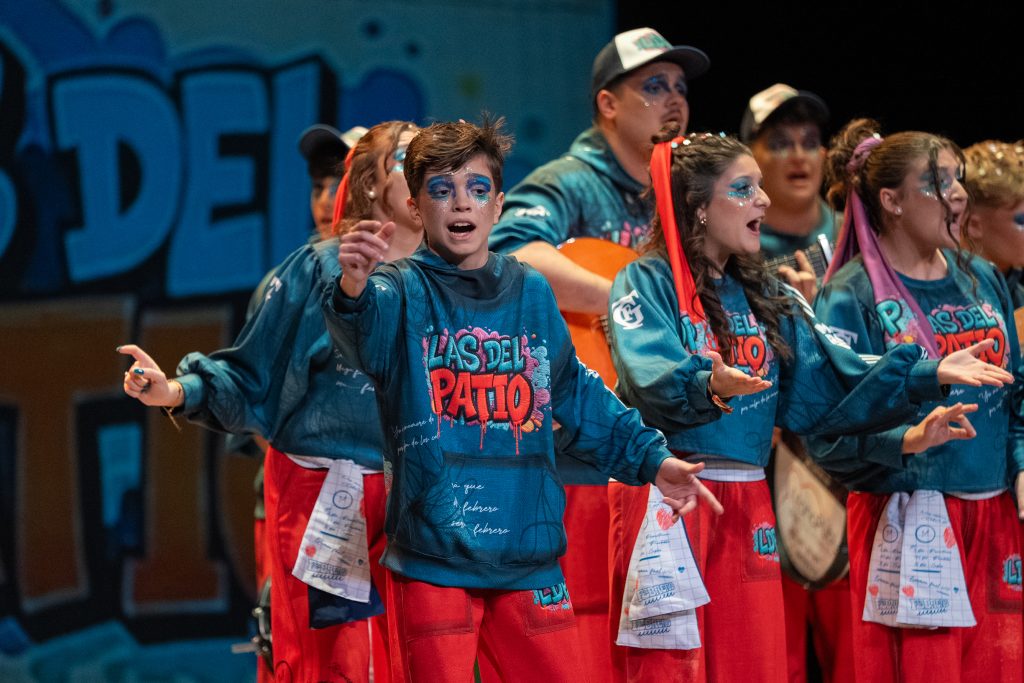 El tipo situó la acción en el patio de un colegio, ese espacio intermedio entre la infancia y la madurez donde se forjan vínculos, inquietudes y primeras reivindicaciones. Desde ahí, Las del patio desarrolló un repertorio que combinó referencias educativas, emocionales y sociales, siempre desde una óptica juvenil que evitó el tono impostado. El grupo, conocido como “los indomables”, defendió desde el inicio su amor por el Carnaval, subrayando el esfuerzo añadido que supone desplazarse desde Extremadura para cantar en Cádiz.