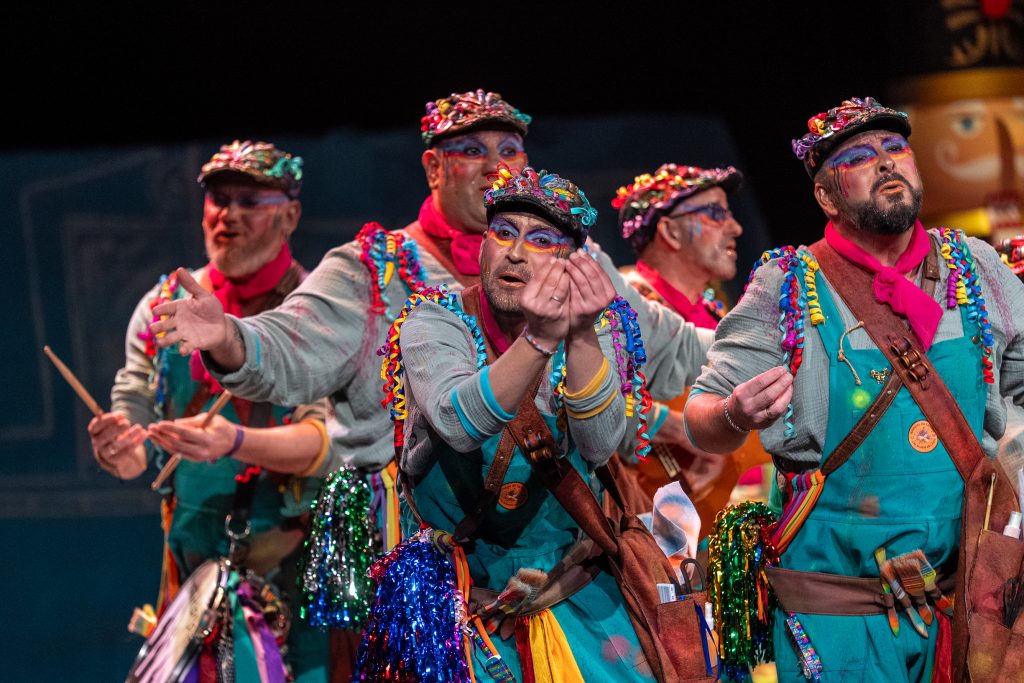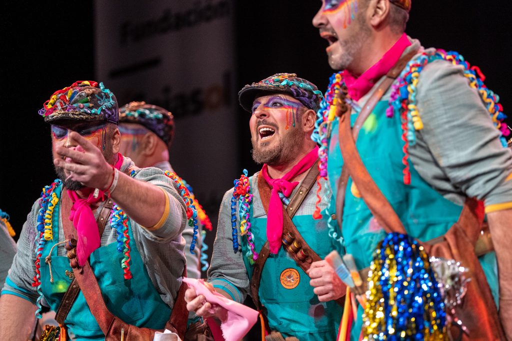 La comparsa Las manos de Cádiz, procedente de El Puerto de Santa María y con letra de Raúl Villanueva y música de Carlos Javier Noriega y Javier Cuevas, regresó al Gran Teatro Falla con un tipo de artesanos del Carnaval que trabajan en el taller, espacio previo donde se diseñan tipos, se pintan bocetos y se construye la puesta en escena que luego llega a las tablas. La idea se expuso desde la presentación con claridad conceptual: el taller como territorio donde participan quienes no tienen el don de la palabra pero sí el del oficio, y donde se levantan escenografías, vestuarios, maquillajes y atrezo. La propuesta apuntó a los llamados “invisibles del Carnaval”, un colectivo que la comparsa reivindica como parte nuclear del Concurso.