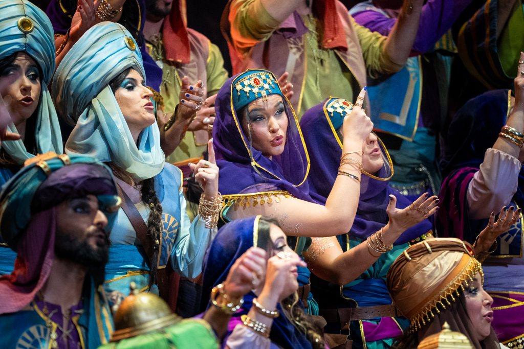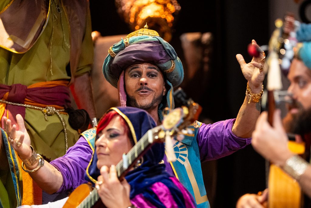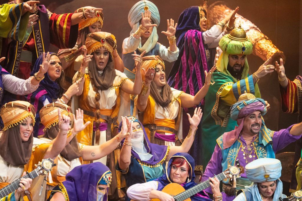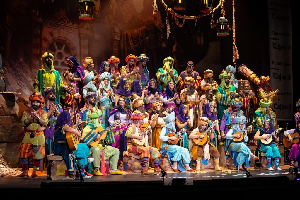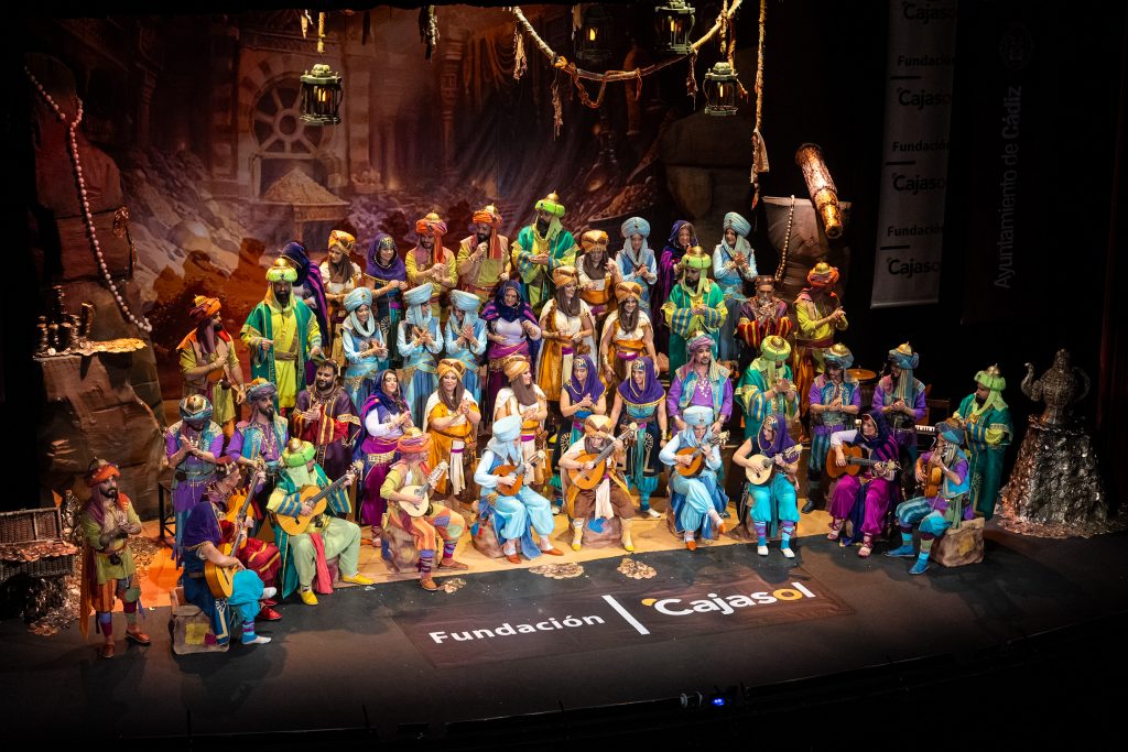 La presentación situó el tipo en el universo de Alí Babá y los ladrones, con la cueva de tesoros convertida en metáfora de Cádiz como ciudad de “mil maravillas”. La idea activó un juego gaditanista de apropiación simbólica: el coro “roba” aquello que la ciudad tiene de valioso para preservarlo frente a otros, una operación que el público reconoció de inmediato. La puesta en escena, con diseño de Keko Trinidad, escenografía de Solo Arte Creaciones y faroles suspendidos en altura, desplazó la caja escénica hacia arriba y otorgó profundidad visual al proyecto, reforzado por maquillaje y vestuario de vocación estética. La recepción fue de entusiasmo contenido, propia de una apertura de repertorio que privilegia la estética sobre el conflicto.
