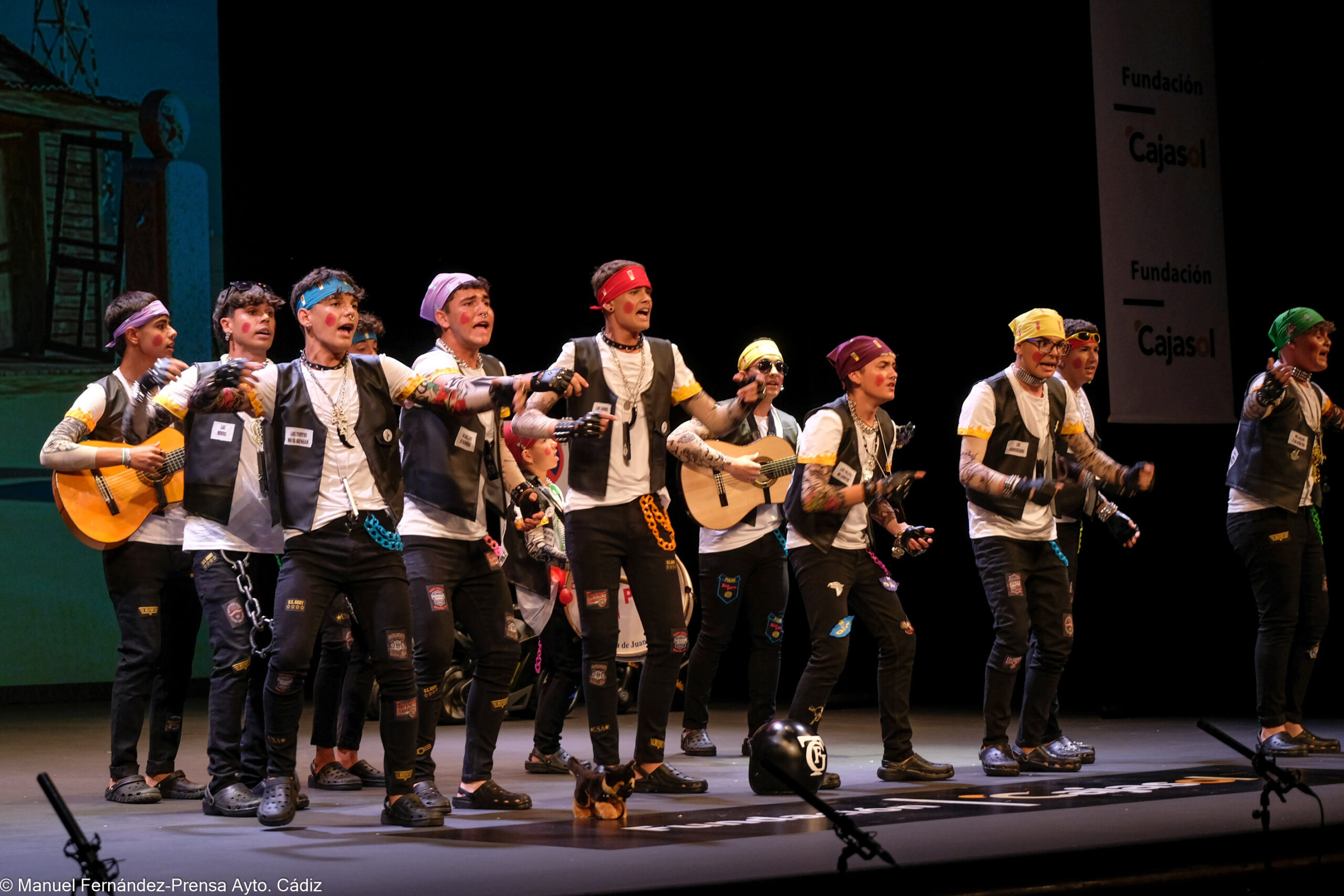 Un homenaje a la chirigota ‘Los pofesionales’. La presentación empieza con el estribillo de esa chirigota. Aparecen como los encargados de una caseta de feria de tiro al blanco estos roteños que el año pasado alcanzaron los cuartos de final con ‘Este año ya nos despedimos’. No necesitan más que cantar en febrero para el resto de su vida, cantan en la presentación.