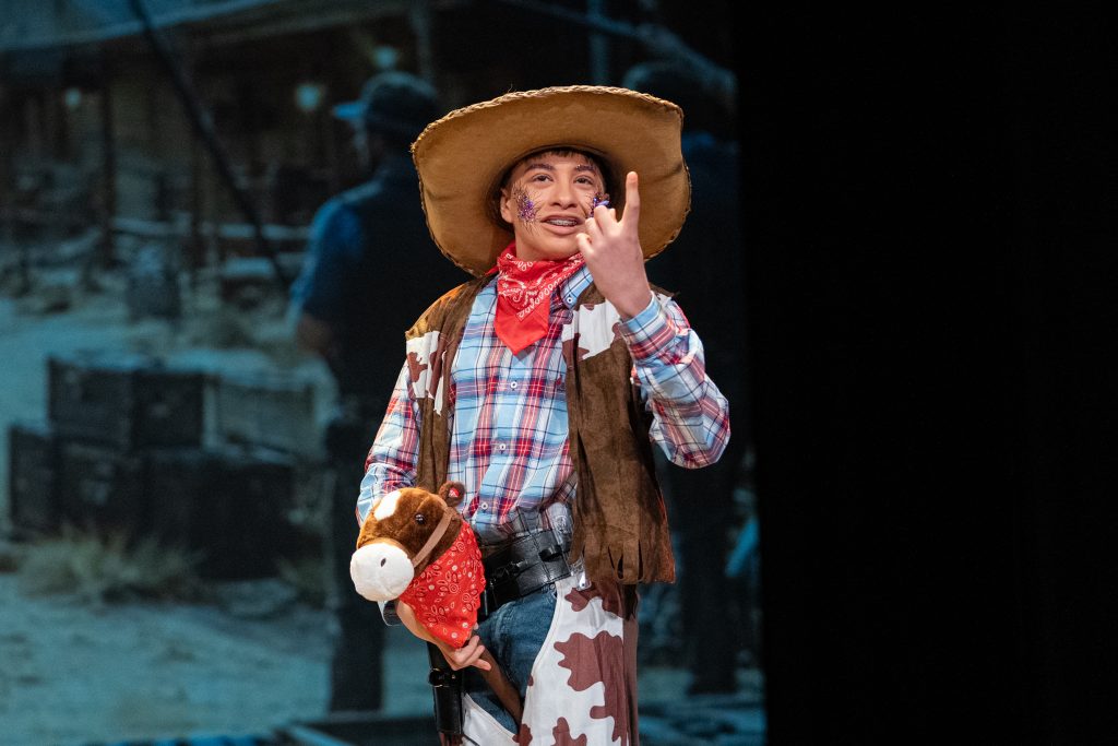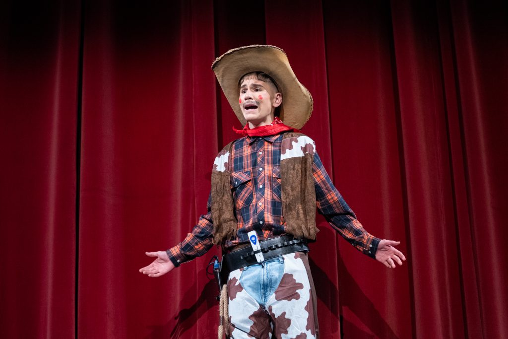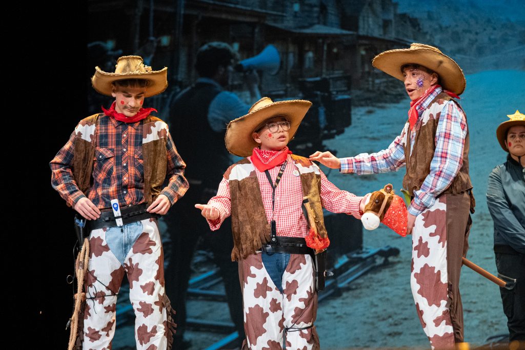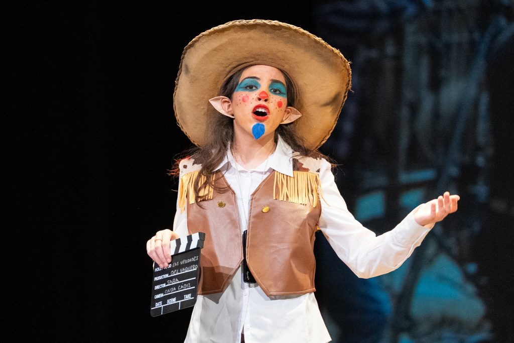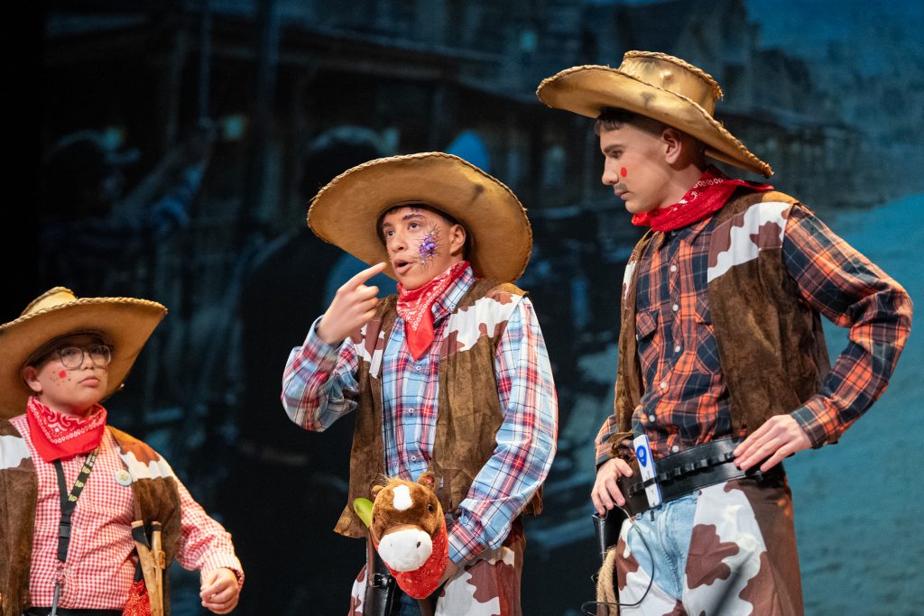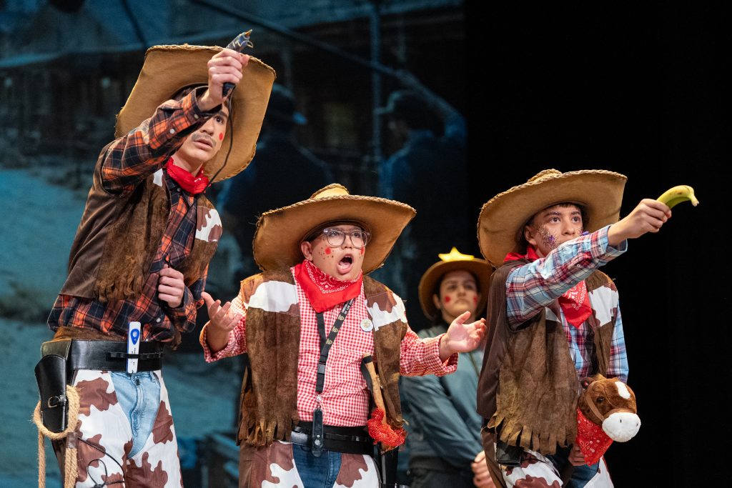 La actuación arrancó con una escena meta-teatral en la que los propios personajes reconocían los nervios previos a la función y el contexto de actuar en una sesión compartida con otras agrupaciones. A partir de ahí, la parodia situó a los componentes como vaqueros elegidos para protagonizar una película del “lejano este”, mezclando códigos del western clásico con expresiones, bromas y situaciones propias de Cádiz. El reparto de papeles —el bueno, el feo y el malo— sirvió como punto de partida para una sucesión de diálogos ágiles, apoyados en la exageración y el contraste entre el imaginario americano y la realidad gaditana.