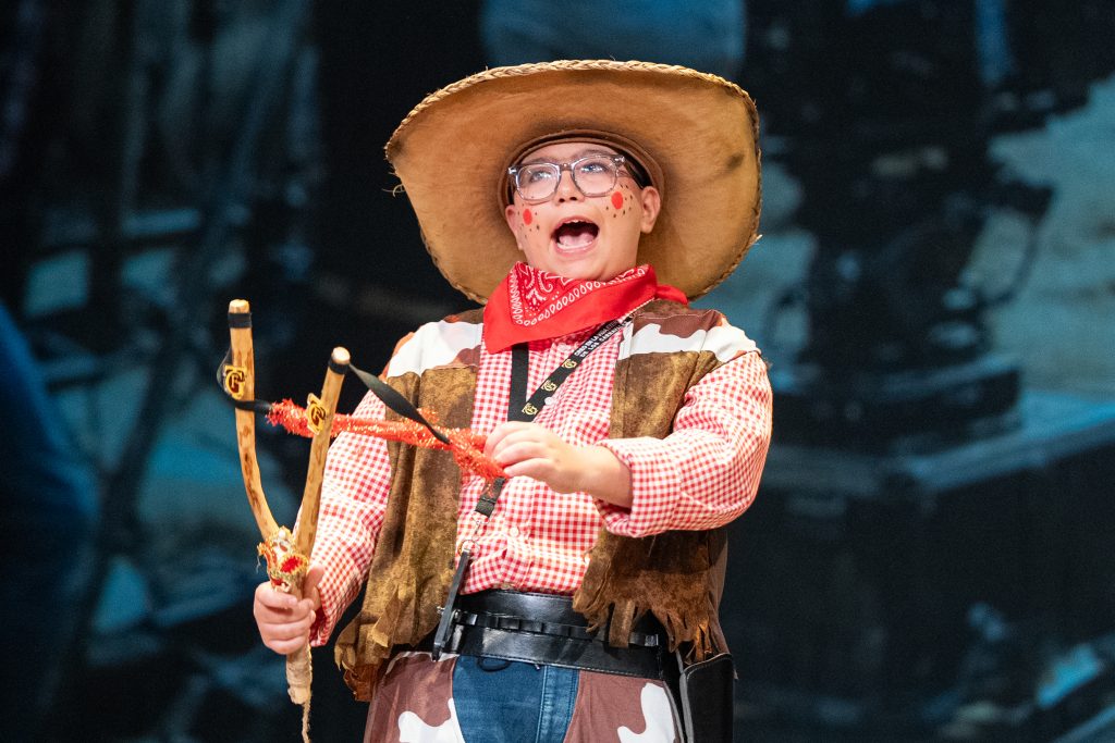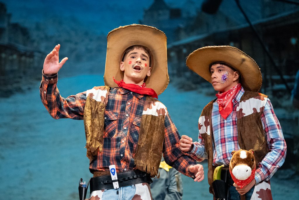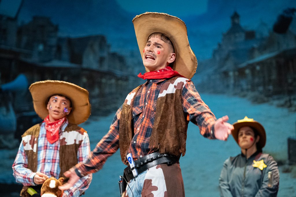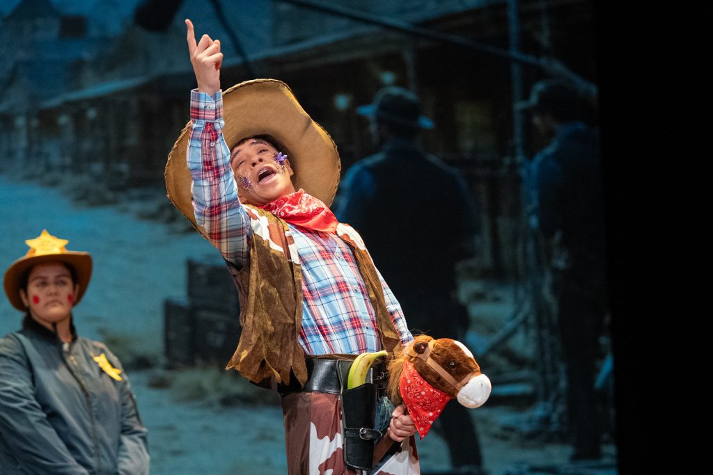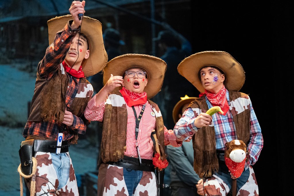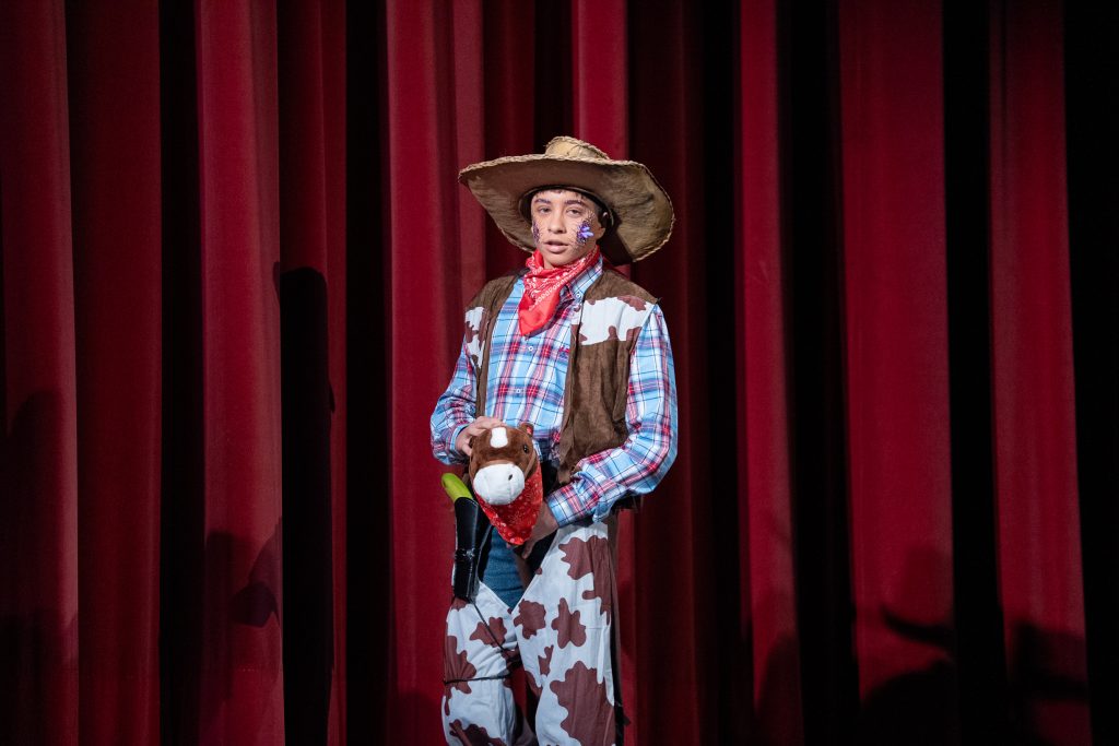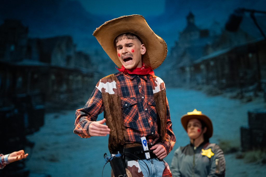 La actuación arrancó con una escena meta-teatral en la que los propios personajes reconocían los nervios previos a la función y el contexto de actuar en una sesión compartida con otras agrupaciones. A partir de ahí, la parodia situó a los componentes como vaqueros elegidos para protagonizar una película del “lejano este”, mezclando códigos del western clásico con expresiones, bromas y situaciones propias de Cádiz. El reparto de papeles —el bueno, el feo y el malo— sirvió como punto de partida para una sucesión de diálogos ágiles, apoyados en la exageración y el contraste entre el imaginario americano y la realidad gaditana.