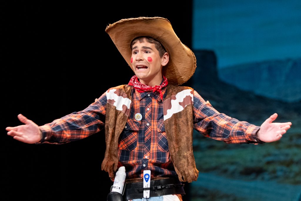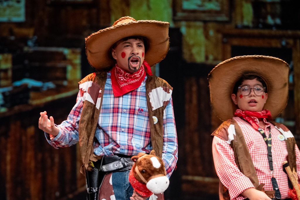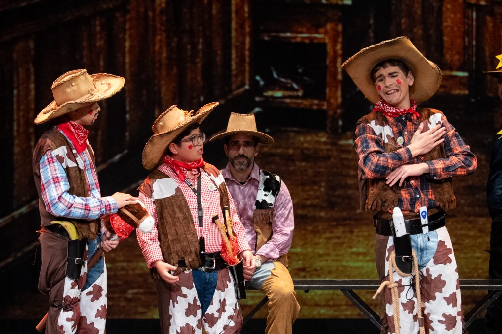 El inicio situó al público en un espacio escénico mínimo, con elementos sencillos que sirvieron de base para la acción. La ausencia inicial de personajes sobre el escenario dio paso a una presentación dialogada en la que fueron apareciendo los vaqueros protagonistas, cada uno definido por un rasgo exagerado que facilitó el desarrollo del humor: el experto en duelos que nunca ha participado en uno, el aspirante a domador sin experiencia real o el personaje que propone planes sin medir consecuencias. Desde ese planteamiento, el cuarteto articuló una parodia continua basada en el contraste entre la épica del Oeste y la cotidianeidad de situaciones reconocibles.