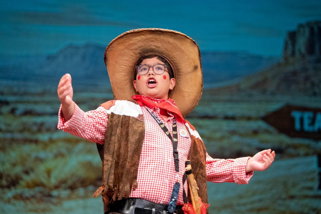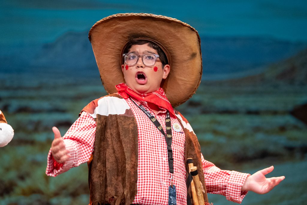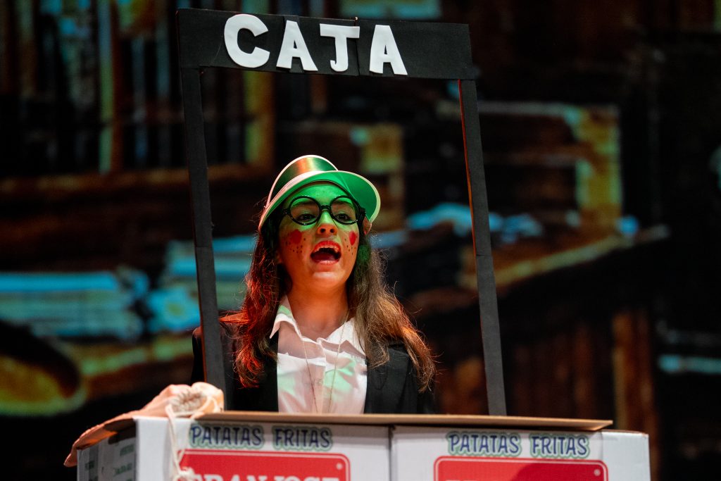 La estructura se apoyó fundamentalmente en el texto hablado, con intercambios rápidos y un ritmo sostenido que mantuvo la acción en movimiento. El atraco al banco funcionó como hilo conductor para introducir situaciones absurdas relacionadas con turnos, comisiones, trámites y esperas, trasladando al universo del Oeste dinámicas propias del día a día actual. Ese juego de anacronismos permitió conectar con el público desde la ironía, sin perder el tono propio de la categoría juvenil.