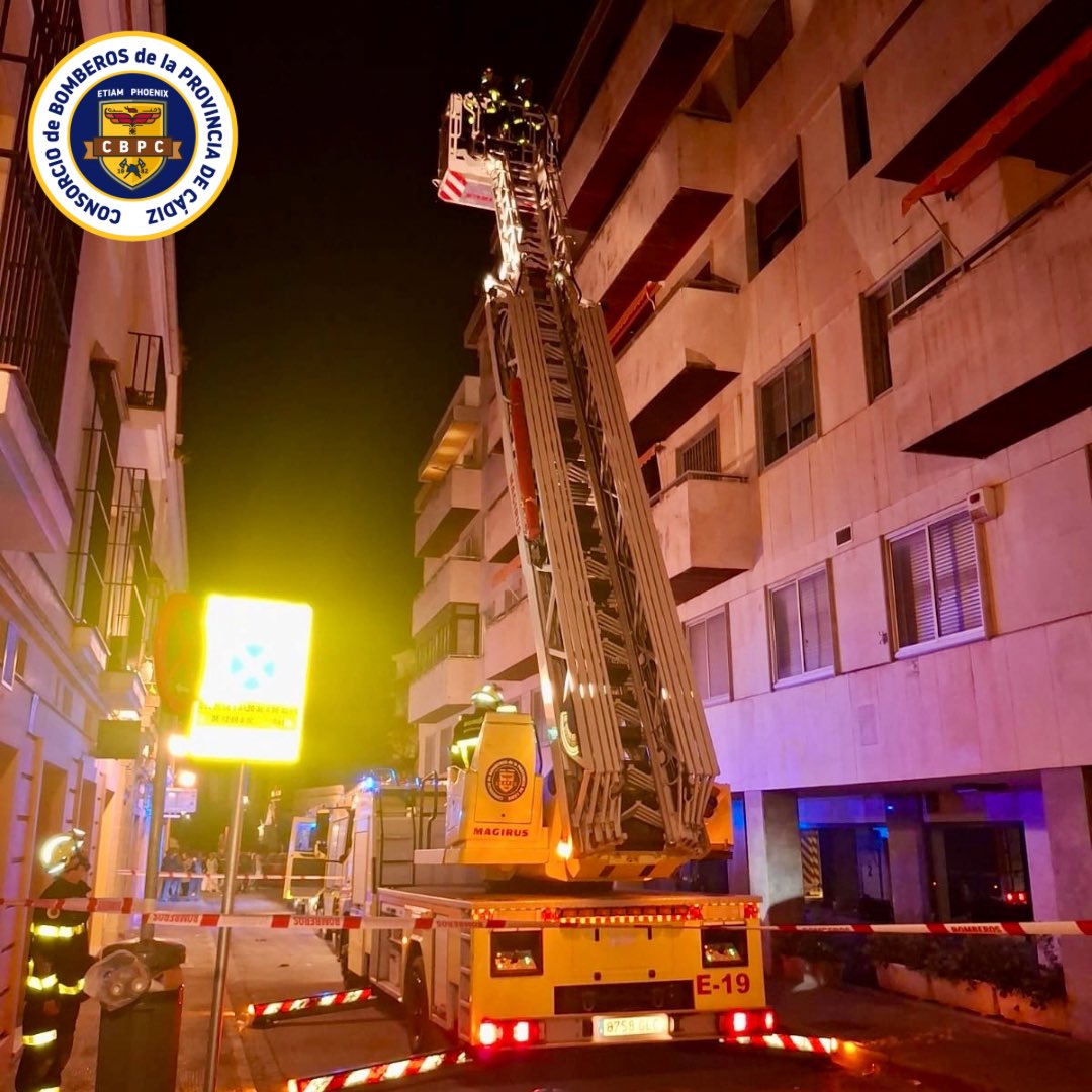La actuación se produjo en torno a las 21.00 horas, cuando se movilizó una dotación compuesta por seis efectivos del parque de bomberos de Jerez. El aviso alertaba de la existencia de elementos de la fachada con peligro de caída a la calle, una situación que suponía riesgo tanto para peatones como para vehículos que transitan por la zona.