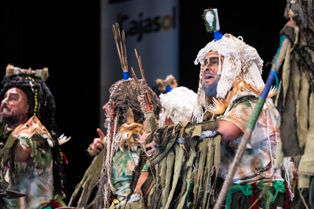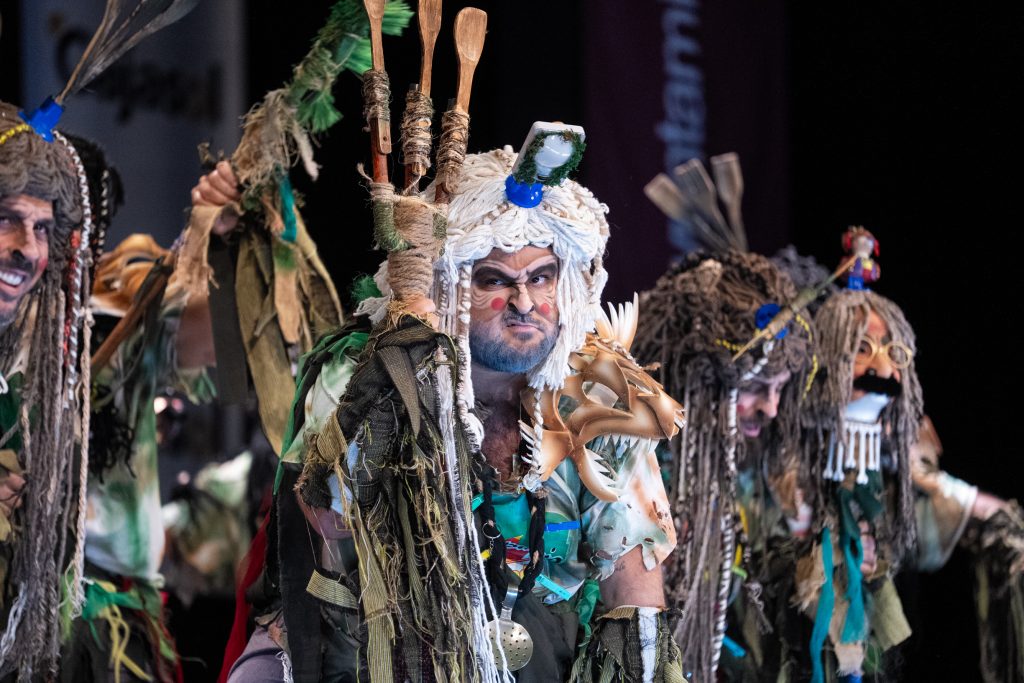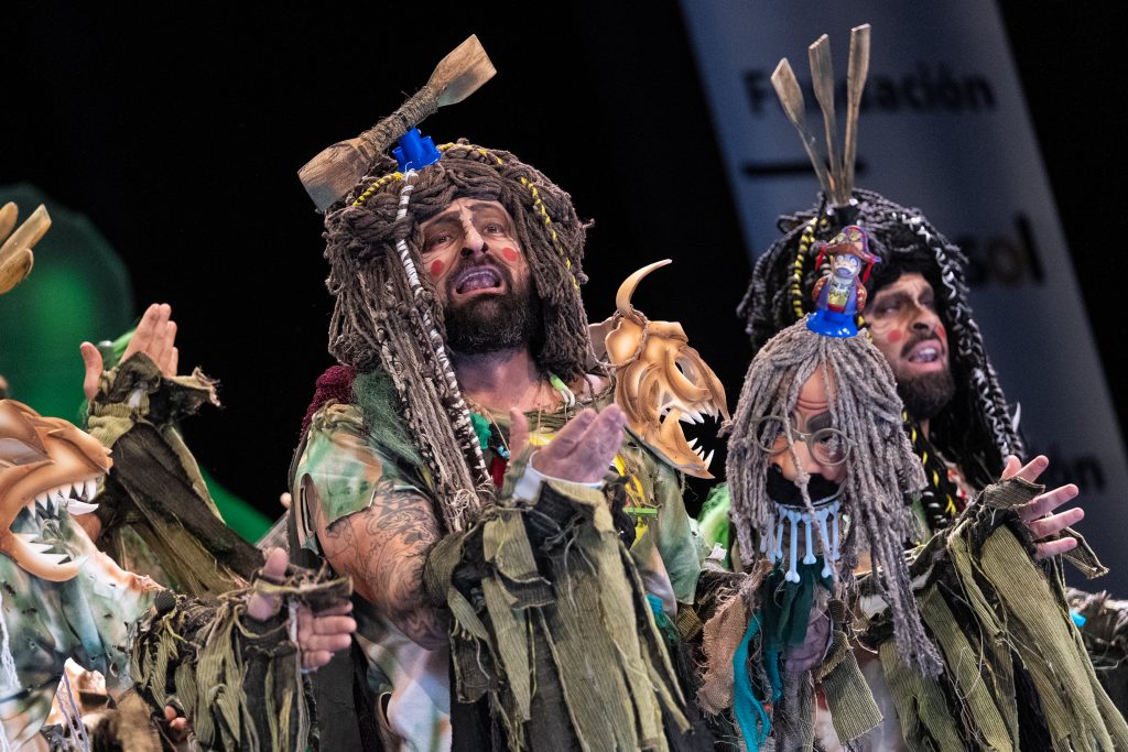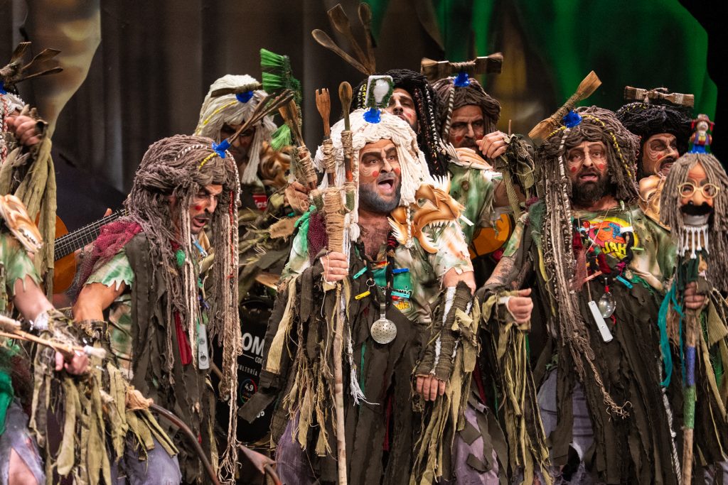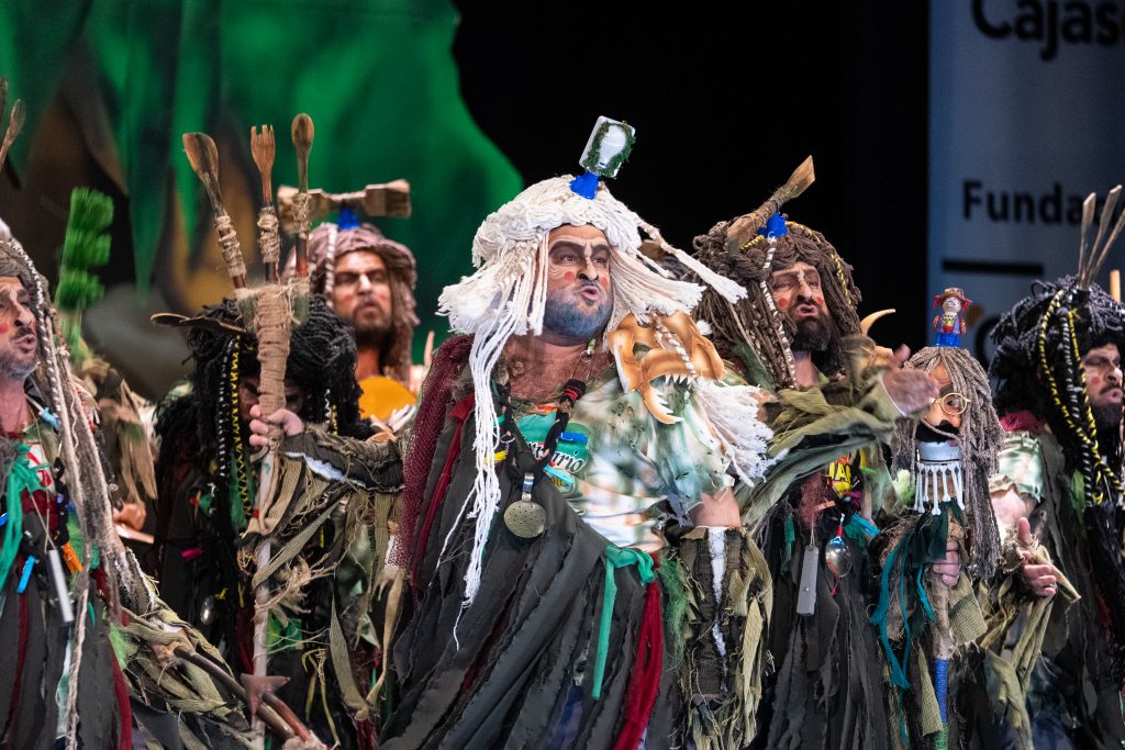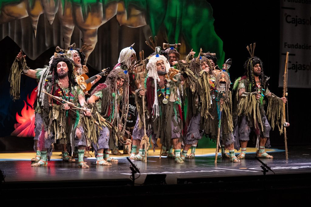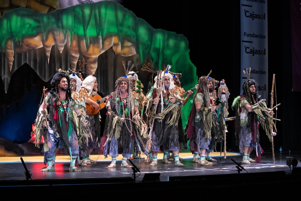 El tipo presenta a una tribu de trogloditas gaditanos, habitantes de una “edad de piedra ostionera”, que cambian la canoa por el autobús urbano y mantienen un lenguaje, unas costumbres y una mirada sobre la ciudad profundamente reconocibles. No se trata de un concepto especialmente llamativo en lo visual, pero sí coherente con el gaditanismo clásico que la chirigota de la Viña viene defendiendo desde hace años. La idea se mantiene con constancia durante toda la actuación, sin grandes giros ni rupturas.