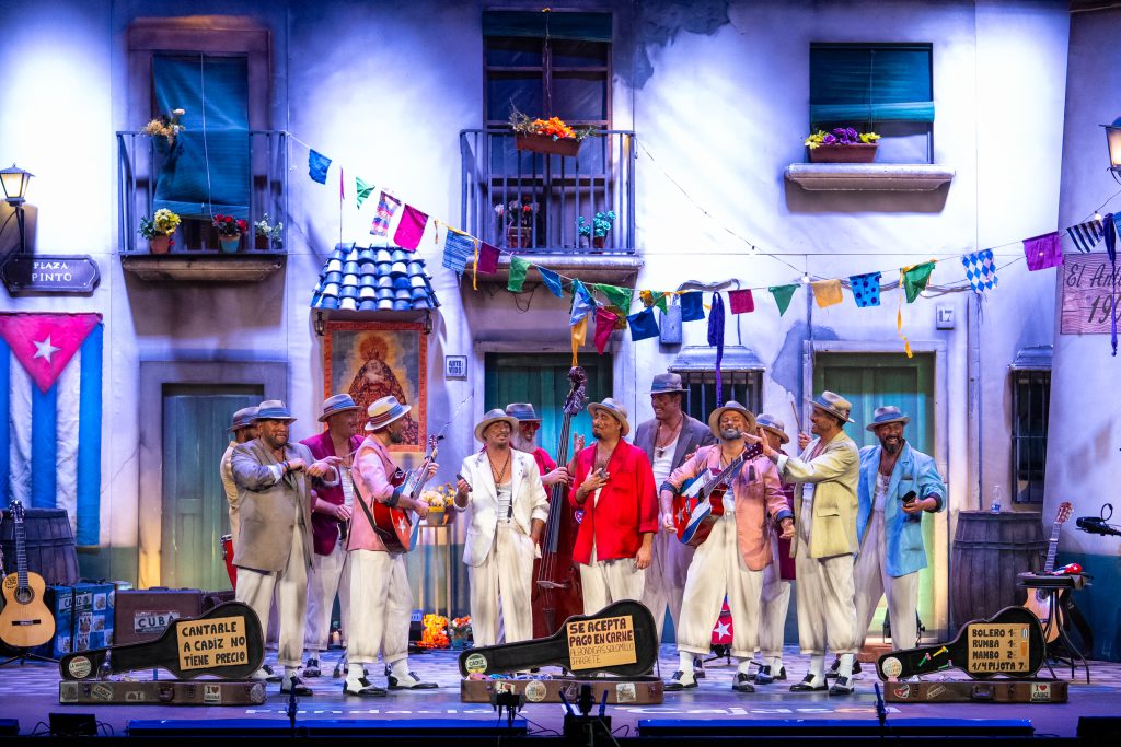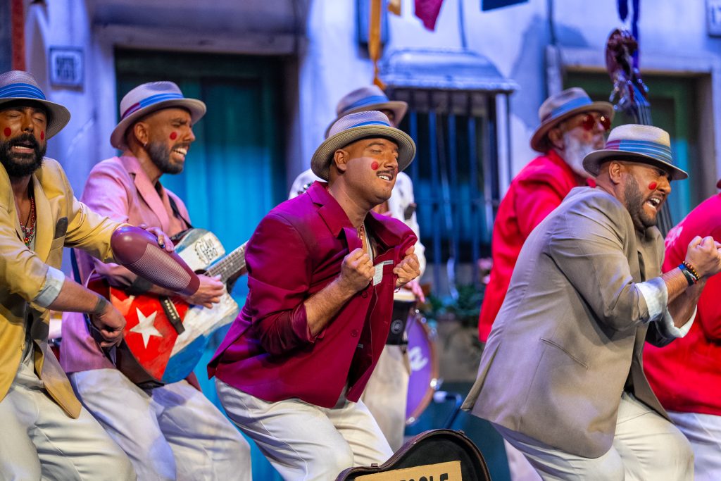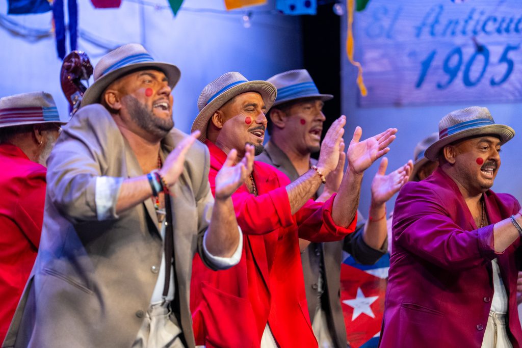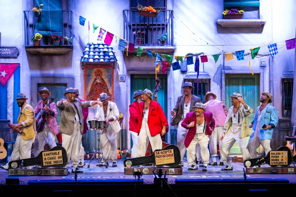 El telón se alzó para revelar un tipo cubano de músicos callejeros, con sombreros, guayaberas y guitarras decoradas con la bandera de Cuba, en un guiño explícito a la idea de Cádiz como “hermana rica” de La Habana. La presentación, con ritmos de son y guaracha, presentó el viaje a la Tacita como oportunidad para “buscarse algún dinero” cantando en la calle y tocando por la ciudad. El planteamiento jugó con la equivalencia cultural entre Cádiz y la capital cubana, fórmula que la comparsa y la chirigota han explorado en otras ediciones del concurso, y que permitió a la agrupación entrar por energía más que por construcción humorística.