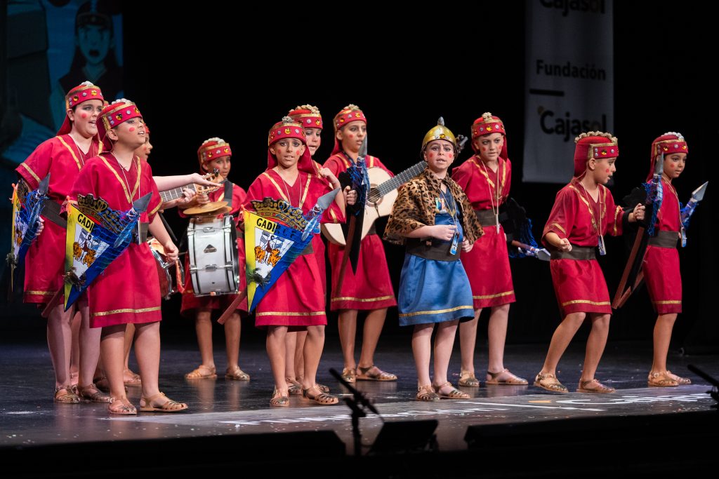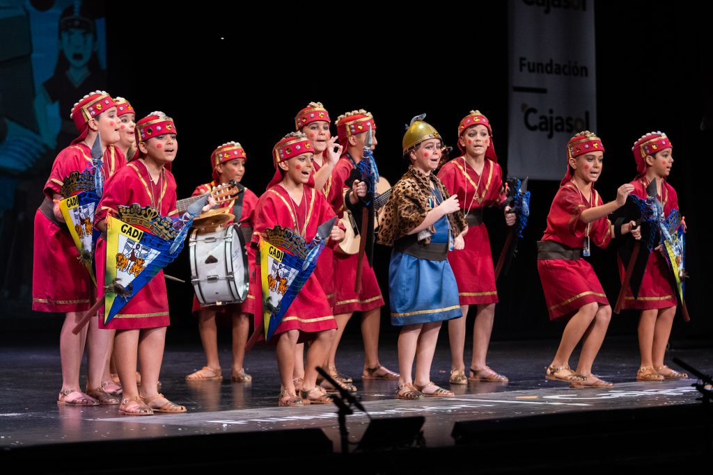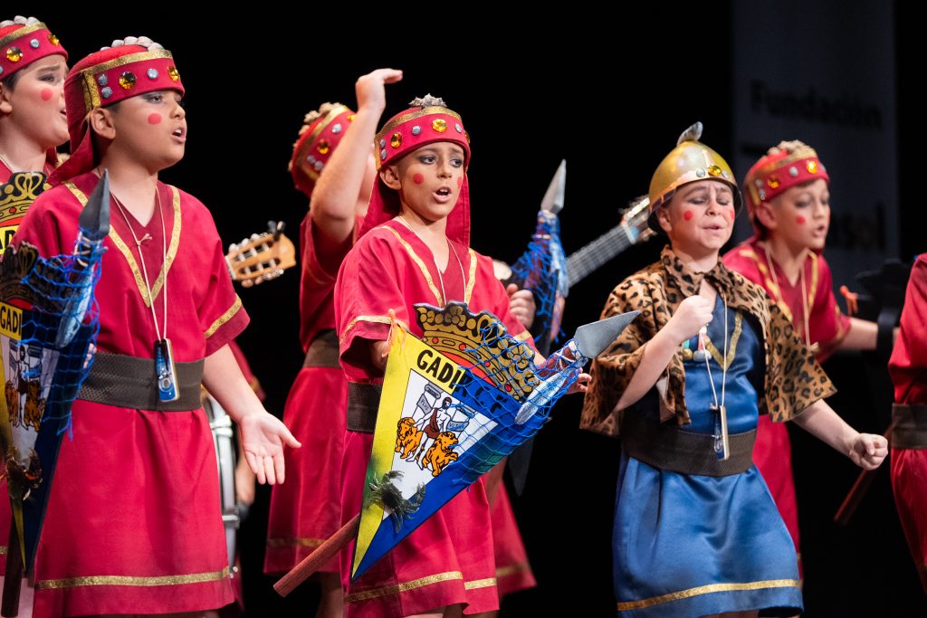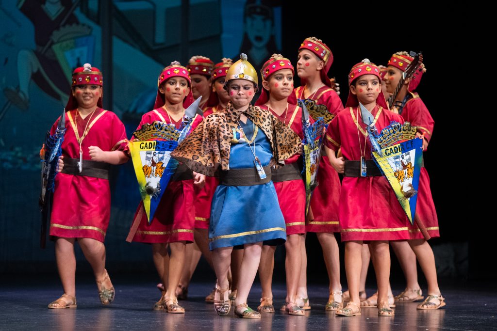 La actuación comenzó con el telón a oscuras, generando expectación hasta que la iluminación permitió descubrir el tipo: una legión de fenicios que regresan a Cádiz tras siglos de historia. El diseño escénico y el vestuario reforzaron la idea, con escudos, lanzas y guiños directos a la antigua Gadir, incluyendo referencias visuales como el emblema transformado en “Gadir Club de Fútbol”, los productos del salazón y elementos asociados a la herencia fenicia en la ciudad. El conjunto logró una imagen potente y fácilmente identificable desde el primer momento.