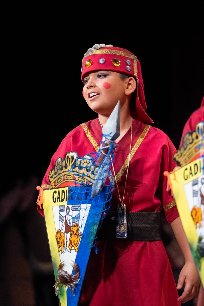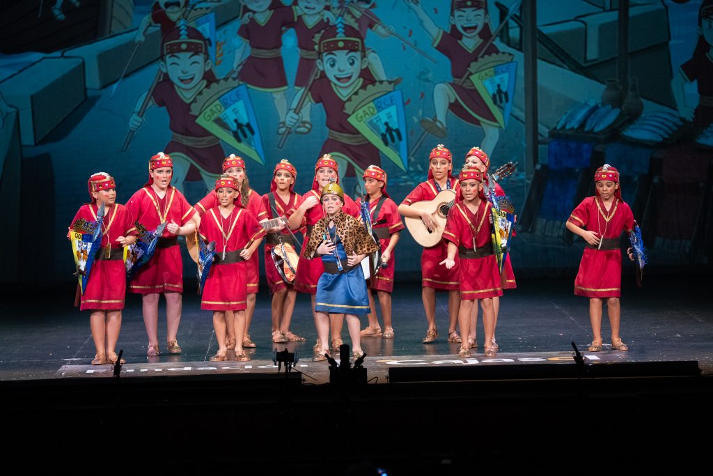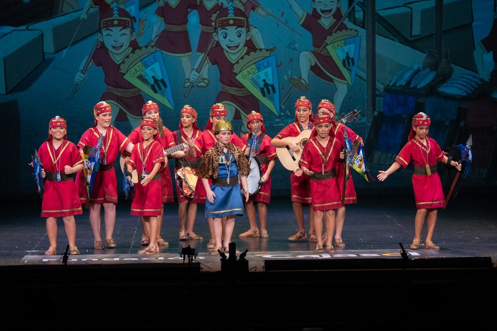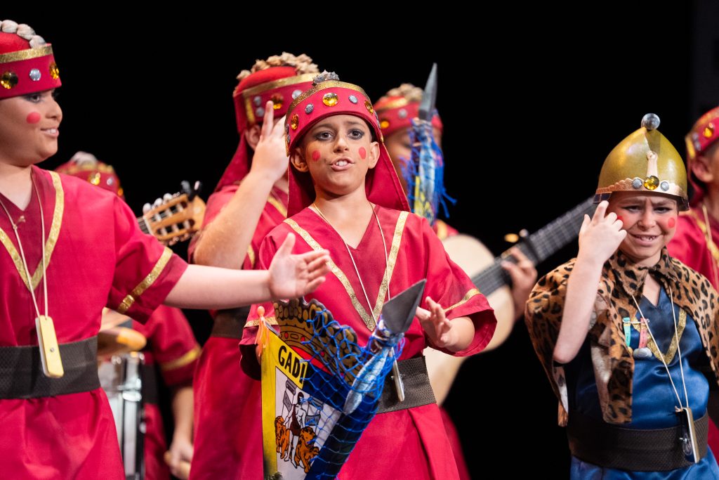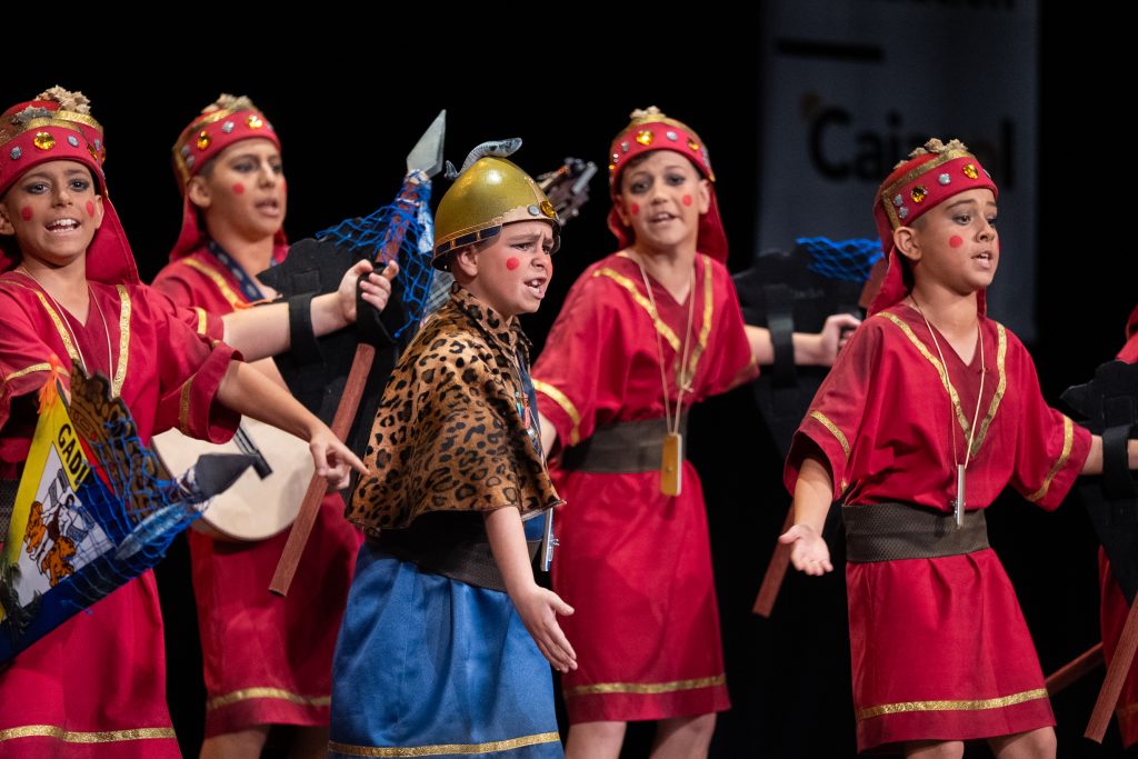 La actuación comenzó con el telón a oscuras, generando expectación hasta que la iluminación permitió descubrir el tipo: una legión de fenicios que regresan a Cádiz tras siglos de historia. El diseño escénico y el vestuario reforzaron la idea, con escudos, lanzas y guiños directos a la antigua Gadir, incluyendo referencias visuales como el emblema transformado en “Gadir Club de Fútbol”, los productos del salazón y elementos asociados a la herencia fenicia en la ciudad. El conjunto logró una imagen potente y fácilmente identificable desde el primer momento.