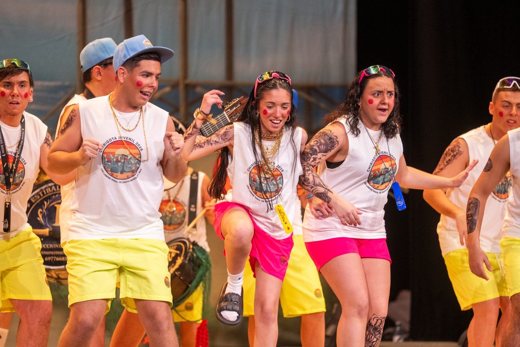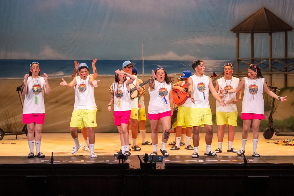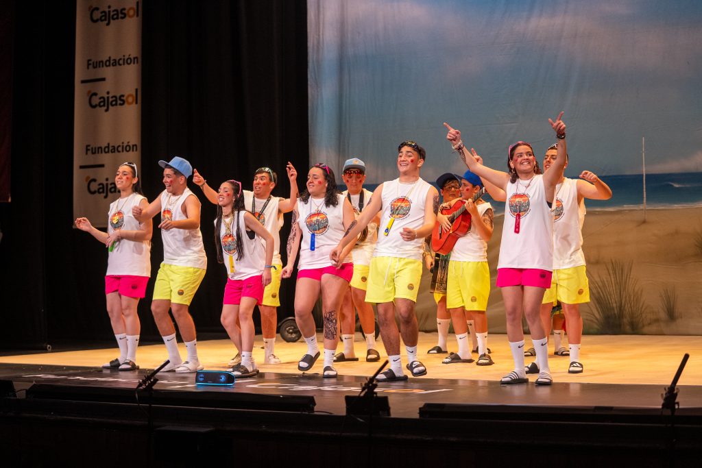 Desde la presentación, la agrupación se mostró caracterizada como un grupo de chavales que baja a la playa con lo justo, bañador, toalla y altavoz, recreando una escena habitual del verano gaditano. El tipo, apoyado en bañadores de colores llamativos, cadenas doradas y gafas, reforzó la parodia sin perder el tono juvenil. El forillo y la ambientación remitieron a la zona litoral, conectando con debates recientes sobre el uso de las playas y la convivencia entre vecinos y jóvenes.