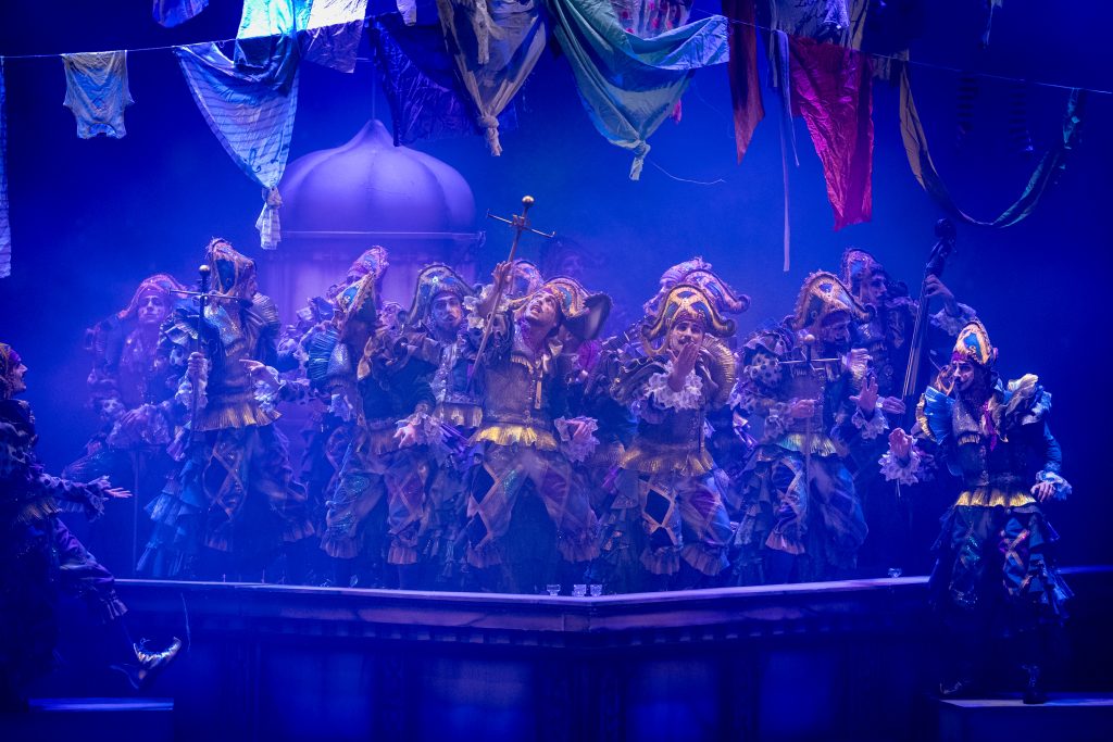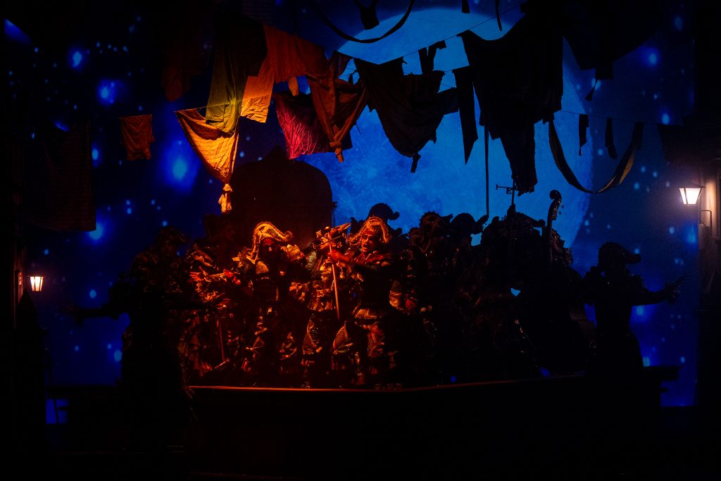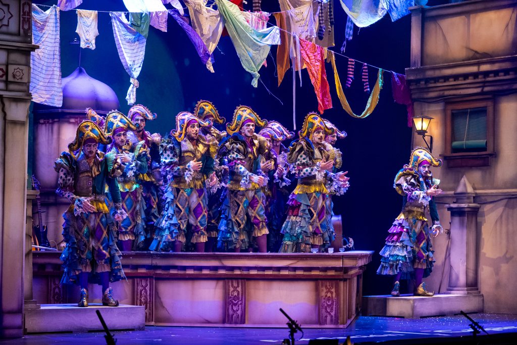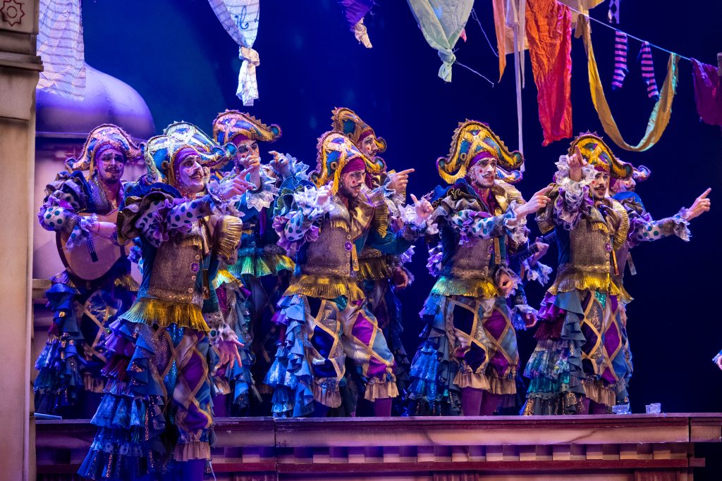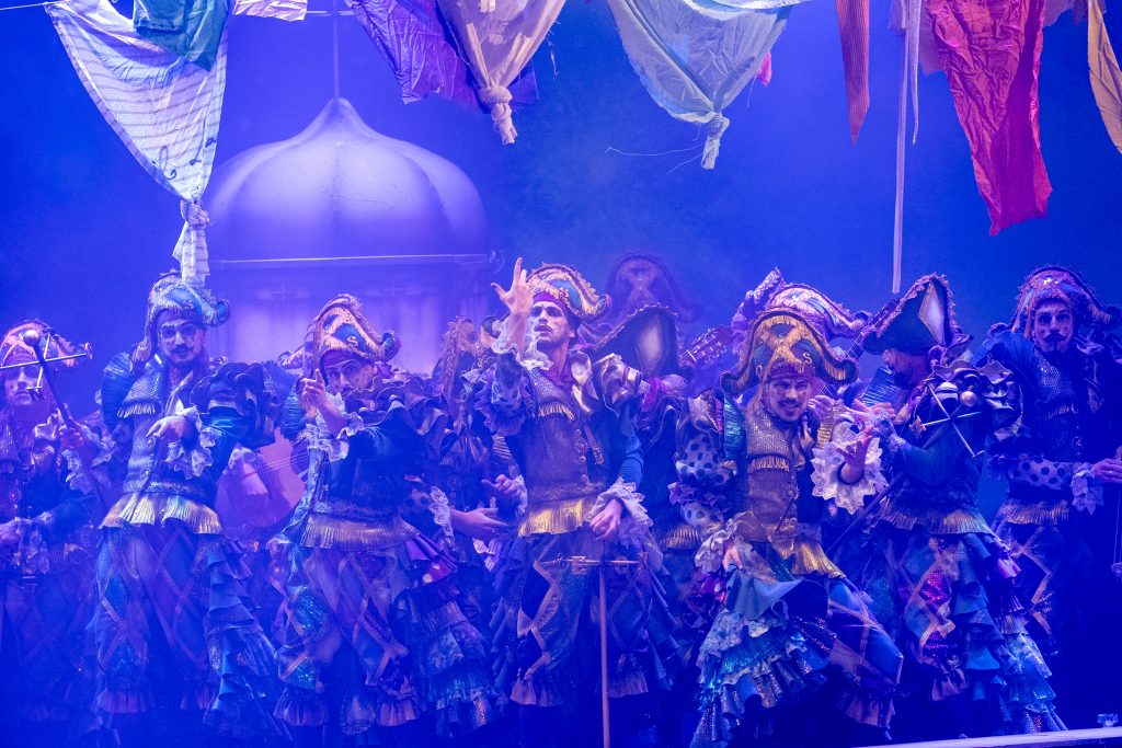 El telón subió con el teatro en silencio y la escenografía descubrió una azotea con ropa tendida, torres-mirador y ventiladores que aportaban movimiento, mientras el tipo se revelaba como una personificación del viento de levante. La presentación se construyó en clave gaditana, con alusiones explícitas a la ciudad y a su forma de vivir el carnaval, incorporando un guiño reconocible a ‘Los buscavidas’ de Antonio Martín. El recibimiento fue inmediato y la entrada tuvo fuerza tanto en lo vocal como en lo visual.