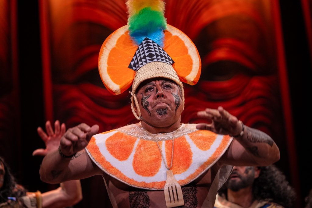 El arranque definió el tono del pase: ritmo corporal, golpes de pecho, coreografía marcada y un chamán que funcionó como guía interna del grupo, estableciendo códigos de movimiento y órdenes en clave humorística. La lectura fue inmediata para el público: “venimos a protestar haciendo mojiganga”. La propuesta se situó desde el primer minuto en un terreno híbrido entre lo físico y lo carnavalesco, con prioridad para el cuerpo sobre la verbosidad del texto.