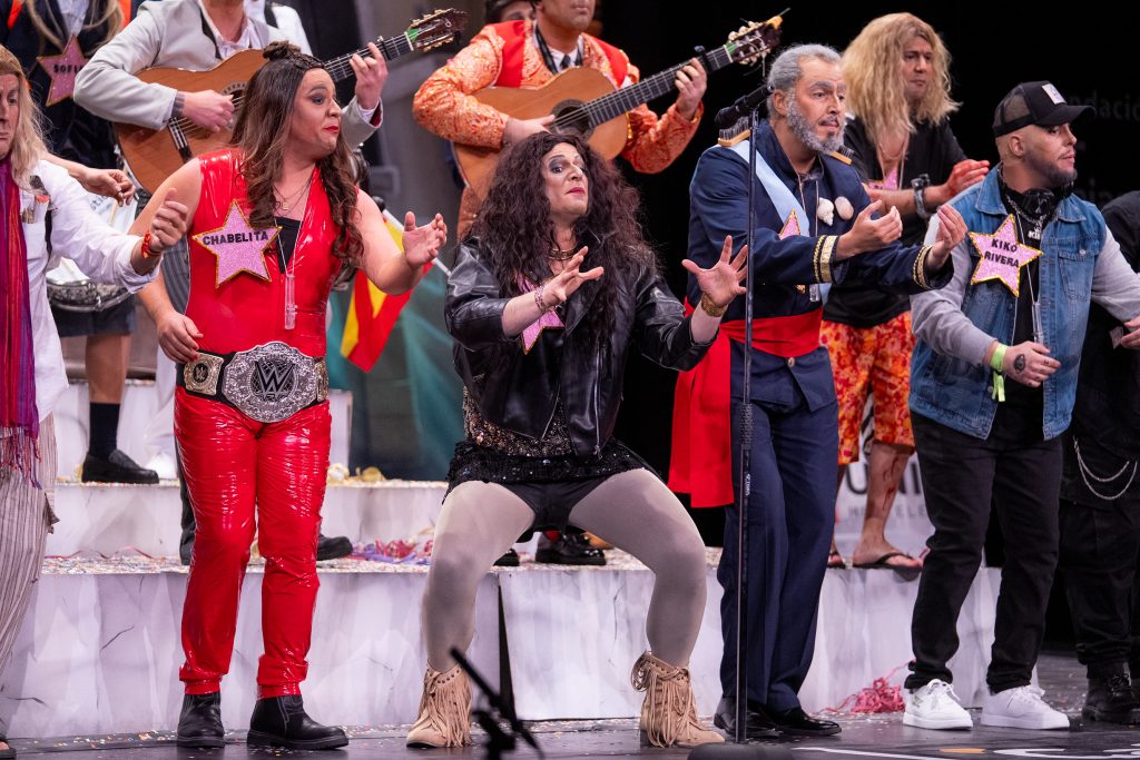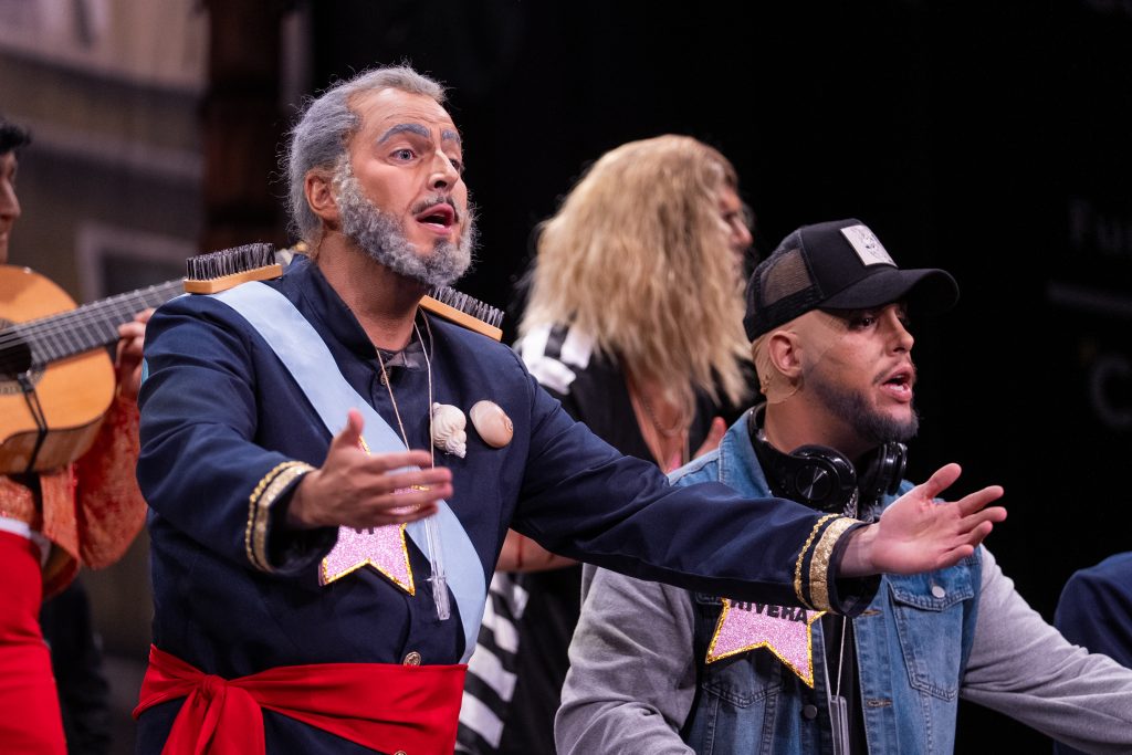 Los cuplés se presentaron “de dos en dos” y explotaron el formato doblete, habitual en chirigotas de humor adolescente y en repertorios construidos a partir de sketches. La primera tanda jugó con Nicolás Maduro en prisión y con el ginecólogo que, contra el tópico, no tiene fotografías sexuales en la consulta. La segunda empleó la vía del absurdo: fiestas, drogas, familias mediáticas y un guiño a los romanos venidos desde Tenerife que el propio concurso ha situado ya como uno de los memes de la edición. El humor funcionó mejor en concepto que en remate y el estribillo resolvió con la idea del privilegio heredado (“si no fuera por tus padres, por tu nombre y por tu fama…”), cerrando en coherencia con el tipo.